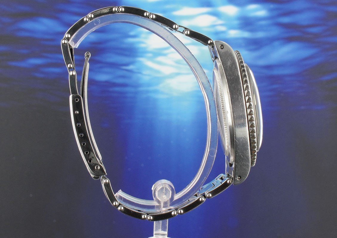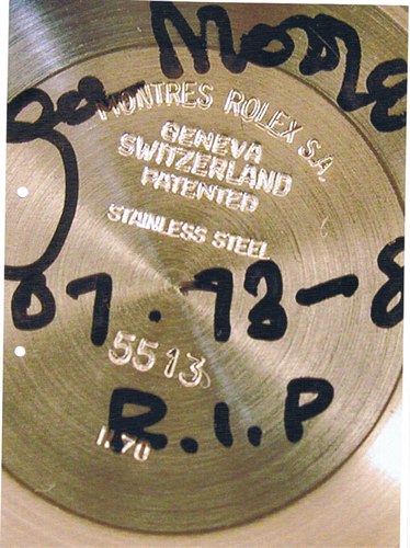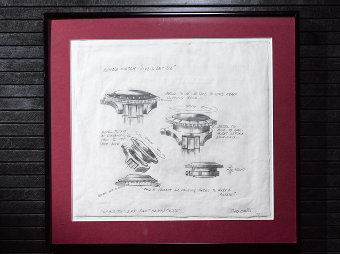 Made especially for Roger Moore as James Bond in the 1973 film ''Live and Let Die'' accompanied by the original production signed and mounted drawing by Syd Cain, the famous chief gadget designer, or real Q, for the majority of the Bond Films! Also included are two original black and white stills showing the watch worn in the film. With its specially adapted ''Buzz Saw'' bezel (which as a working prop spins while rising rise up by way of compressed air) it came to the aid of 007 in the scene where he escapes Kananga's shark infested lair by cutting himself and Solitare (Jane Seymour) free. If you're into your ''James Bond Submariners''? This is the real deal. In addition to all the highly collectible previously mentioned items it also comes with a copy of the auction catalogue back in 2001 (when Watch Guru originally bought the watch) and all the prop parts including its specially addapted fins cast from brass to restore it back to its original state should its new owner find himself in shark infested waters! The case back was also kindly signed by Roger Moore himself at a luncheon date 10 years ago in exchange for a healthy donation to Unicef of which he is a long standing ambassador.