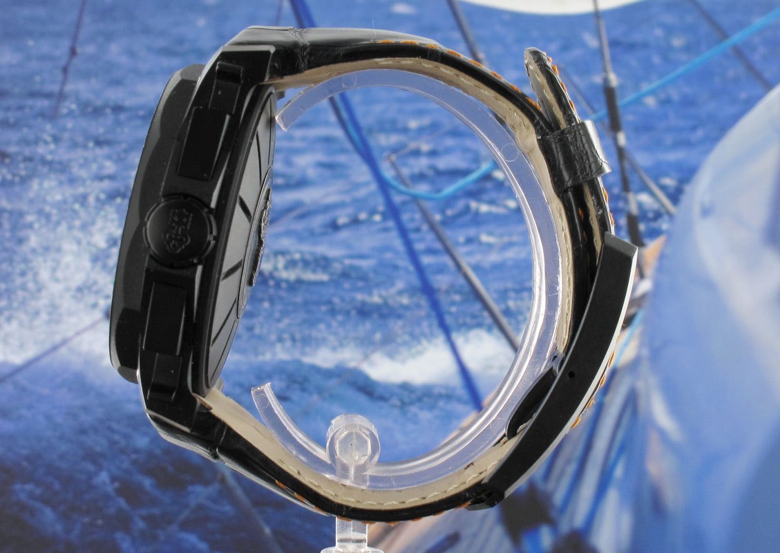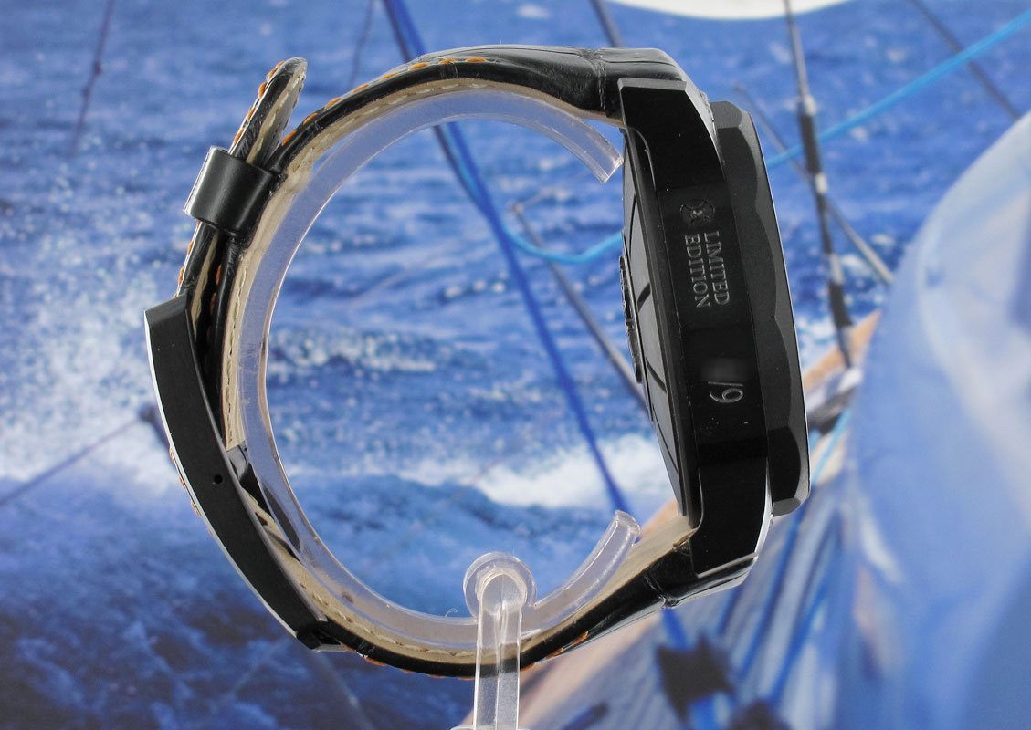 Oversize (48mm) chronograph with ingenious chrono button sliding locking mechanism. Only 6 days old and produced as a limited edition of only 9 pieces.