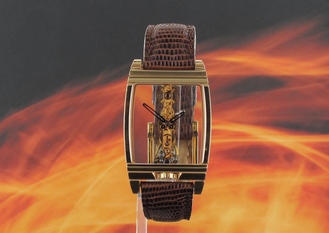 Corum set the benchmark for skeleton watches back in the mid seventies with Calabrese's first Golden Bridge and his stripped down movement, this example is their contemporary interpretation which is a larger and slightly curved case so it sits on the wrist more comfortably. Manual wound with forty hour power reserve in it's own "display case" of sapphire glass and rose gold it really looks like a work of art. Utilizing only four screws on the case back it is amazingly also water resistant too!
