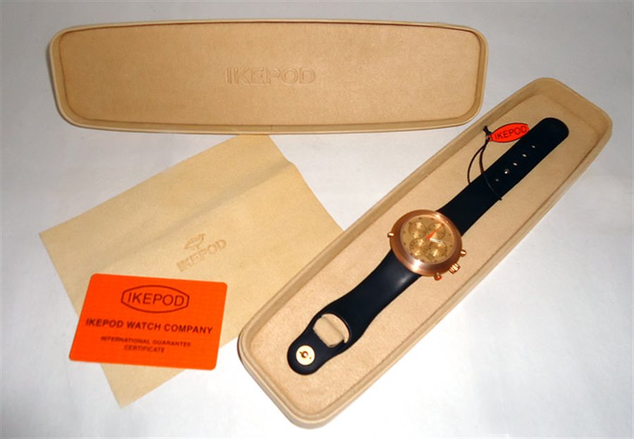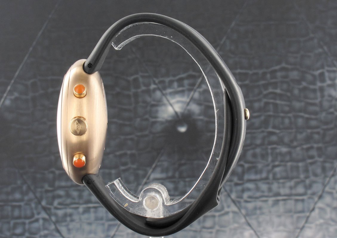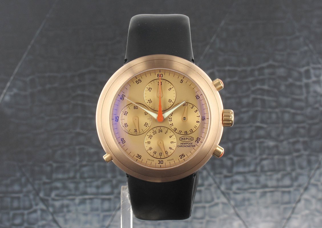One of the original Marc Newson watches designed around 15 years before the Apple iwatch and one can see the relationship between the two. Rose gold was always the most desirable configuration of the Hemipode's as it offset the black rubber strap and made such a statement. Produced as a limited edition of only 999 pieces complete with box and papers.
