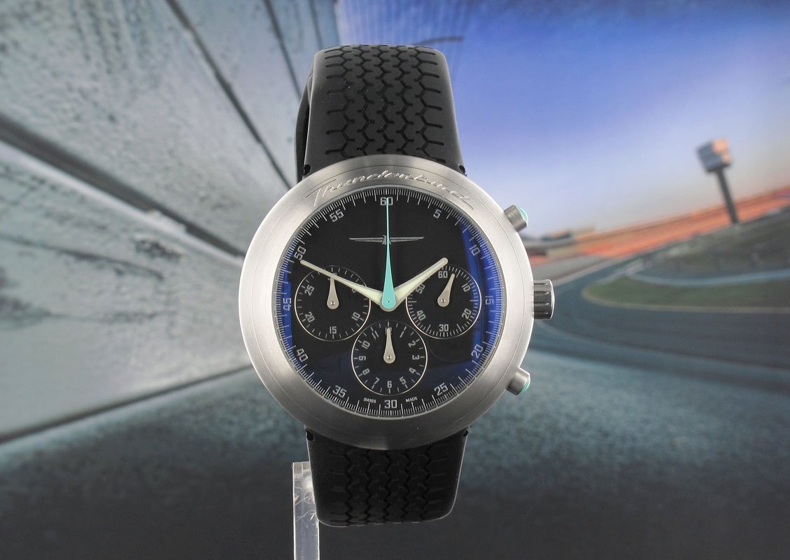 Back in 2003 Ford commissioned Marc Newson at Ikepod to design a special version of the Hemipode to commemorate the re-launch of the Ford Thunderbird. Incorporating the infamous Swiss ETA 2892 chronograph movement widely regarded as its most accurate. With the infamous "Thunderbird" logo on the dial and bezel Newson also incorporated tread of the tires used on the car in the rubber strap which incidentally is vanilla scented. Only 500 pieces were produced of which 250 were in this 44mm size and the other 250 were 39mm a true limited edition.