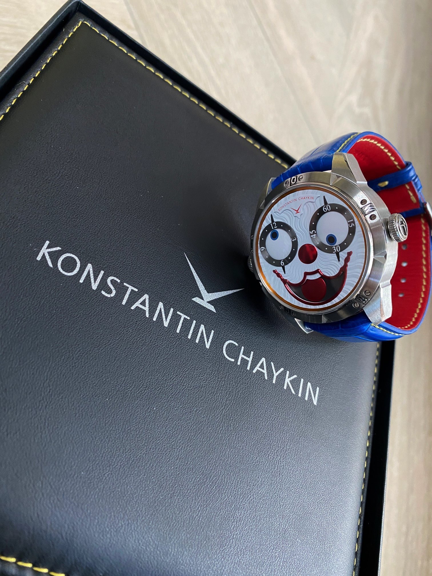 Currently on a waiting list and a limited edition of 88 pieces, this luxury novelty timepiece, hand made in Russia by independent Master Watchmaker Konstantin Chaykin. With its clown face dial incorporating blue eyes that indicate the hours and minutes plus a mouth indicating the moonphase, this watch if nothing makes you smile which is what watches should be all about! This fantastic example remains unworn.