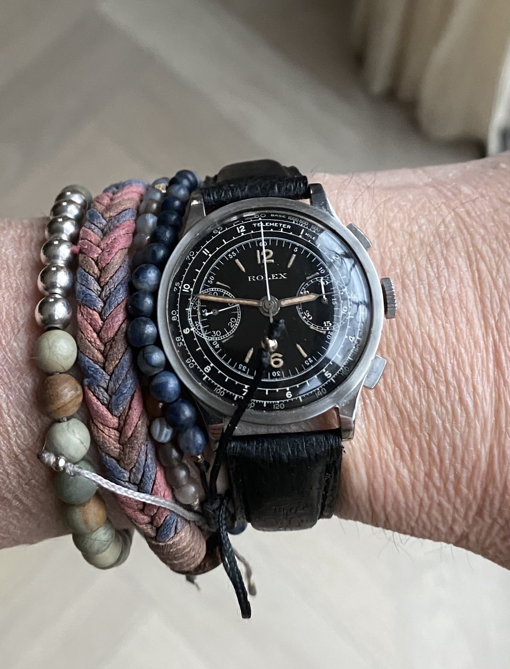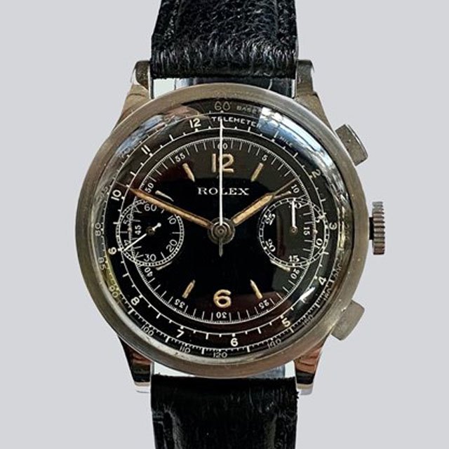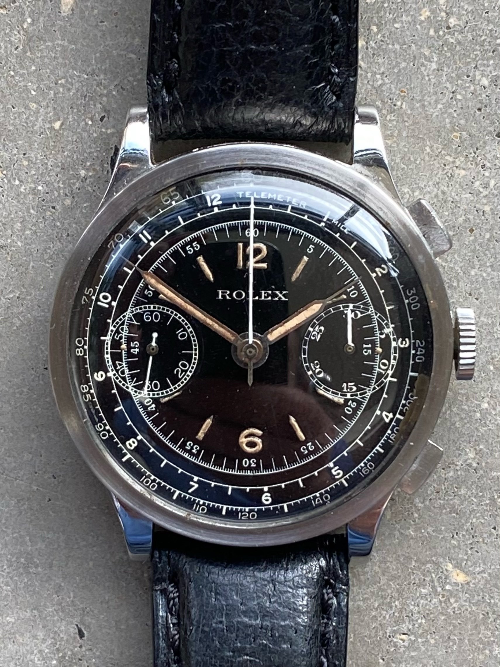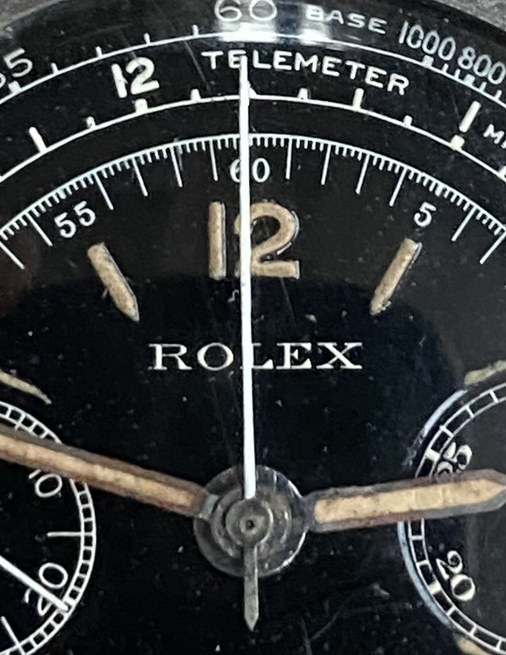 Virtually no other model showcases the disparity between original & non-original dialled Rolexes like a chronograph. Though this dial has been refinished exquisitely many decades ago, ( possibly under licence by Daust of Clerkenwell ) it only musters around 15% of the price as an original black faced example. Ridiculous!