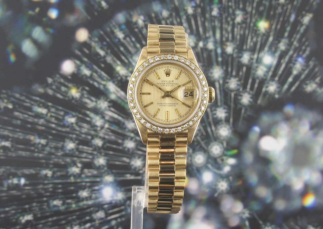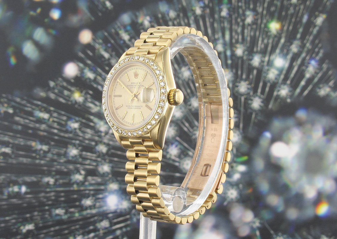 18 Carat version of the ladies Date Just with factory diamond bezel.