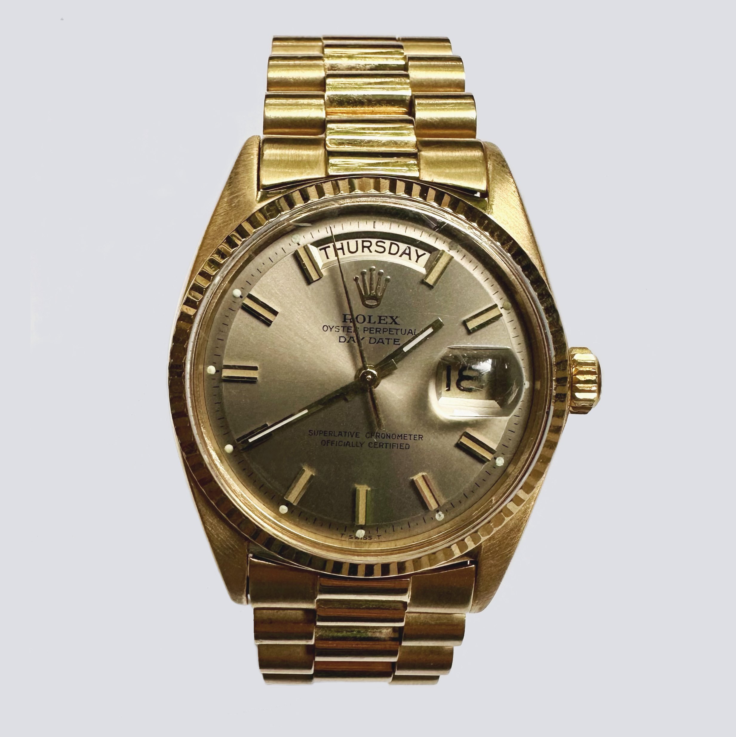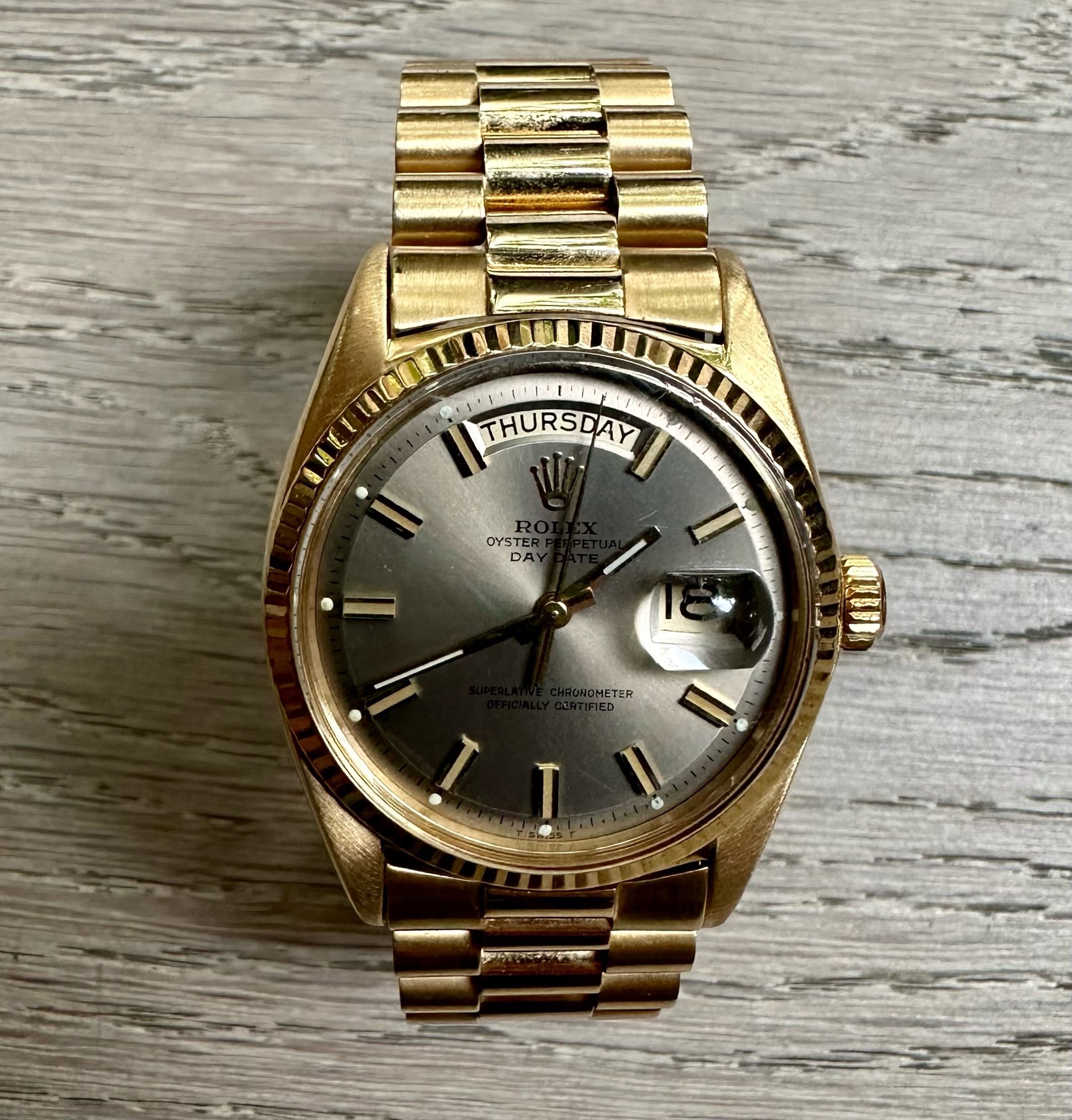 Known as the Wide-Boy due to its chunky 1970s styled our markers, few have this fabulous looking grey dial, the majority running champagne equivalents.