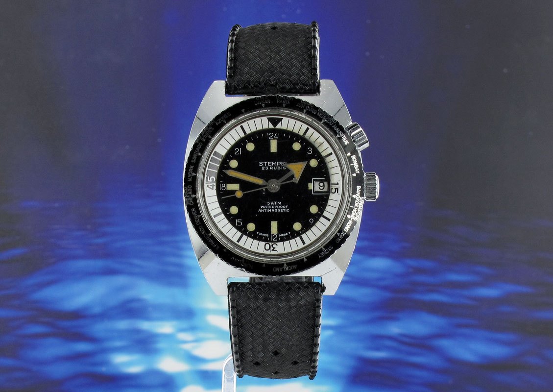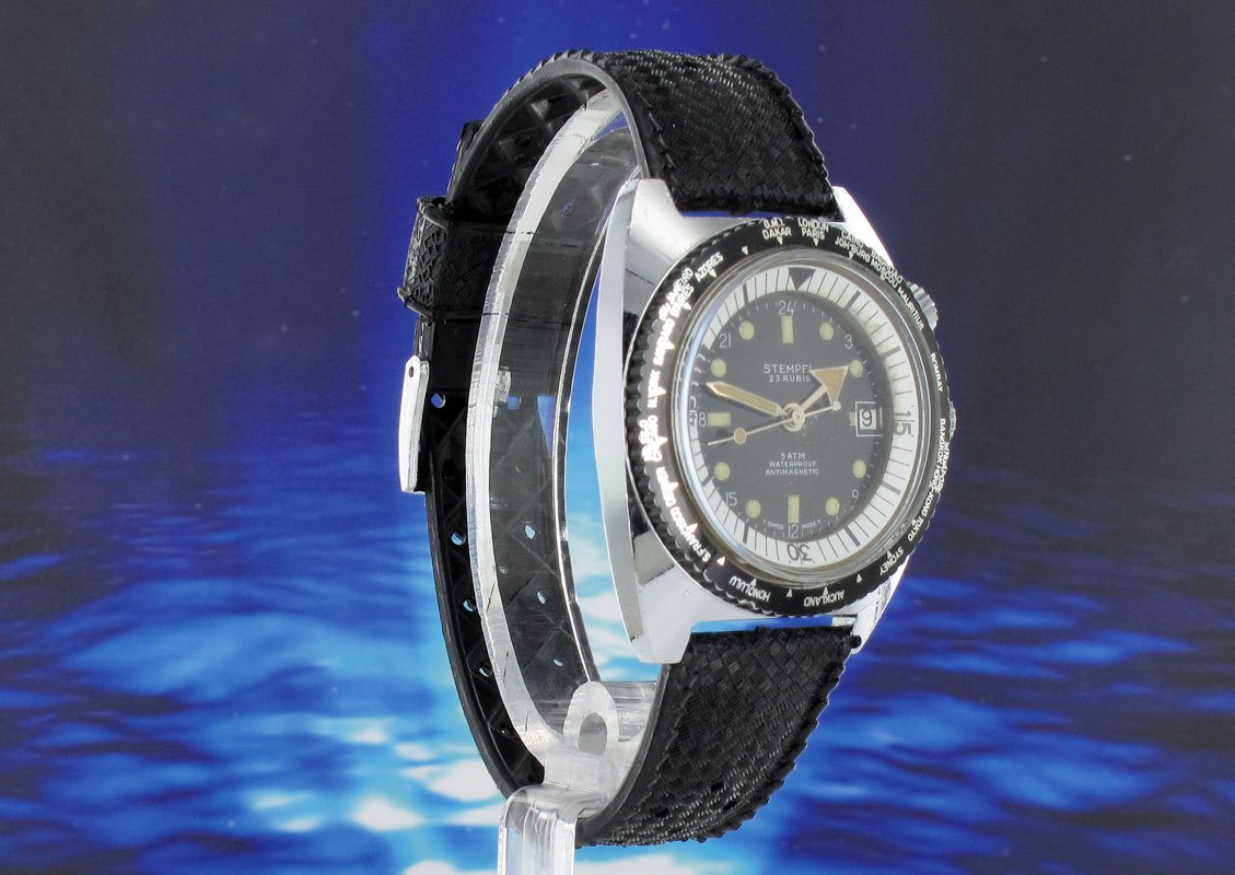Every now and then a little gem comes along without blowing its trumpet and sneaking under the radar. This Stempel is such a thing, with proper old school manual wound movement, waterproof to 5 ATM's inbuilt divers bezel and 24 hour and world time indicator not to mention a calendar if it had any other name on the dial it would have a couple of zeros added to the price. Supplied on its original tropical strap it truly is a cool piece of kit.
