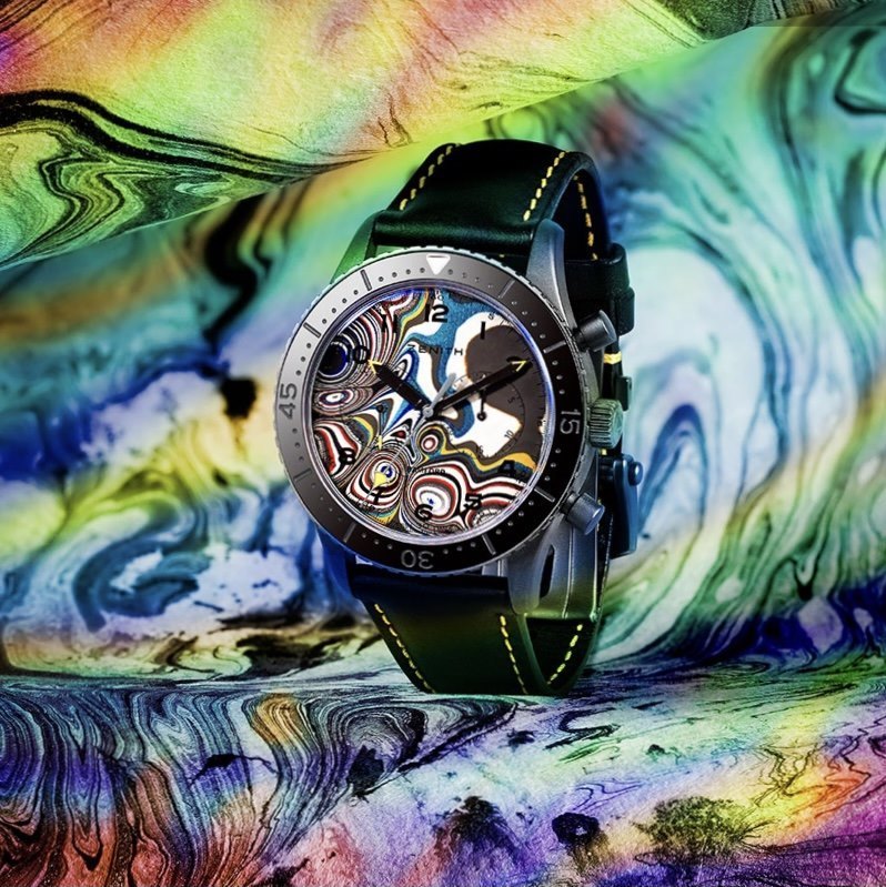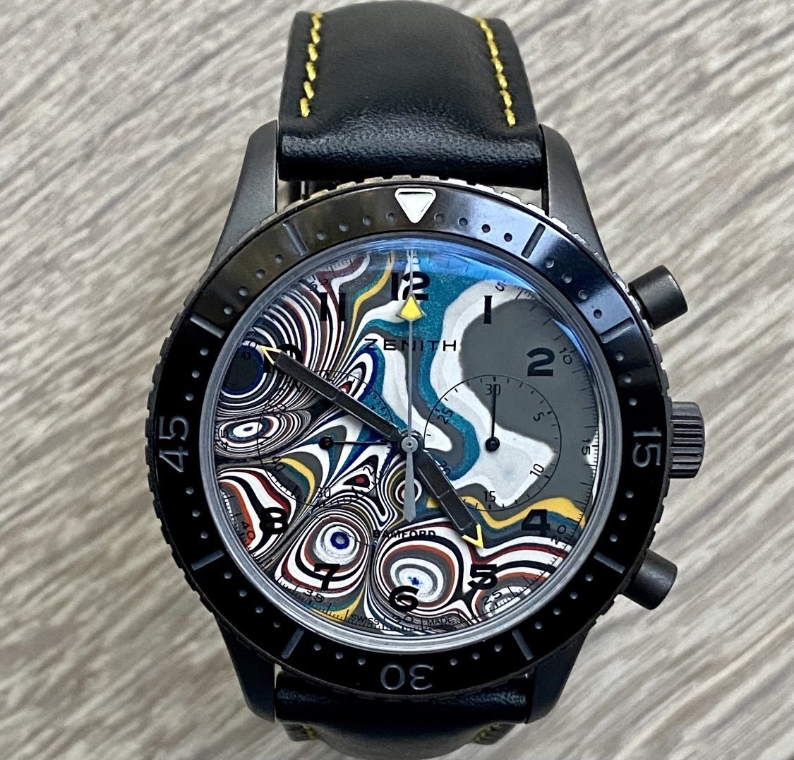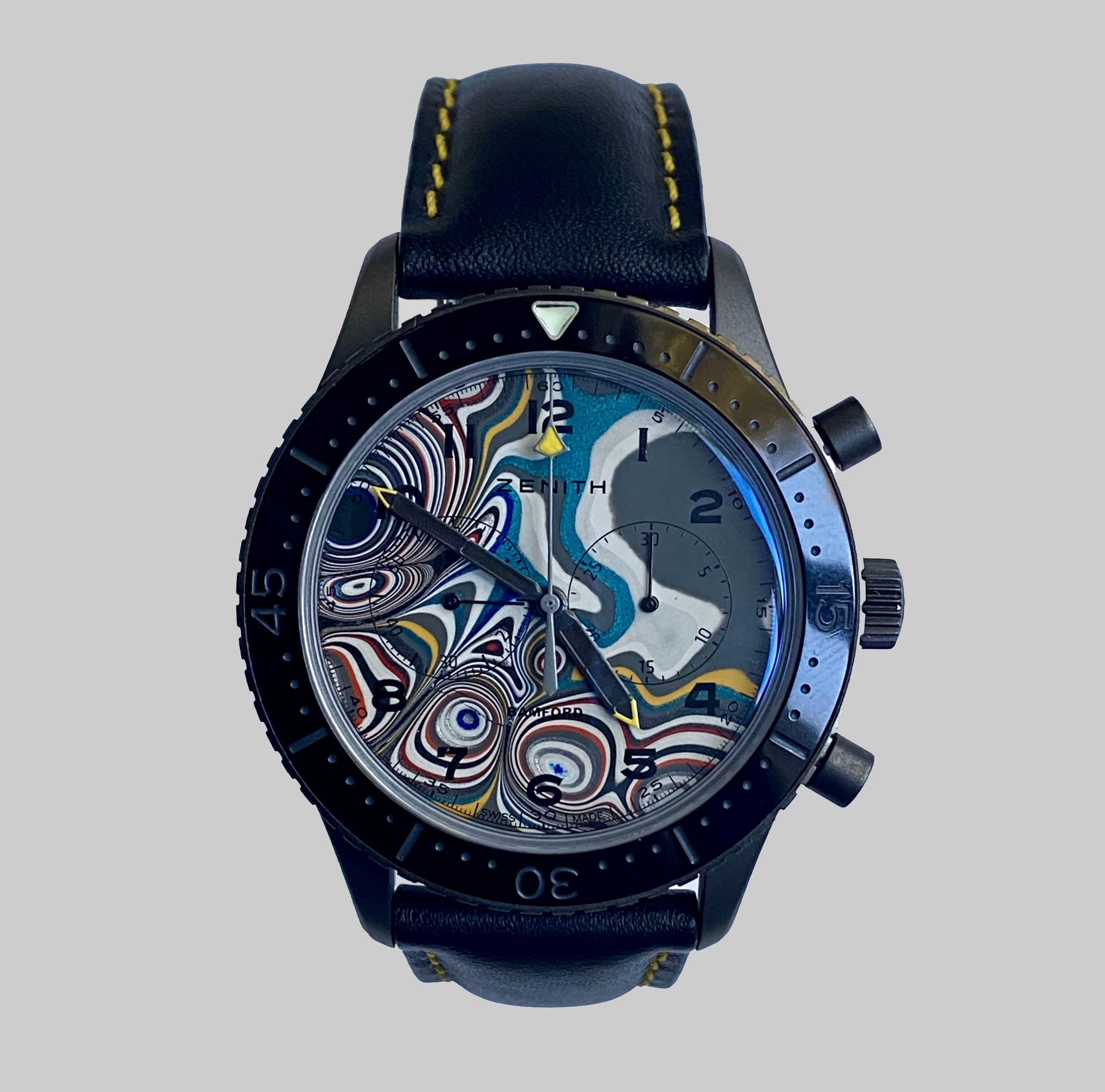 Customised by Bamford in partnership with Zenith, this X Black Badger Zenith Pilot Chrono TIPO CP-2 is a limited efeotion 1/1! Designed in collaboration with Black Badger, this Chrono Pilot features a unique dial of collective overspray from the 1970’s to 1990’s Ford Michigan Paint Factory known as Fordite. Nothing need be said about the El Primero 4069 Automatic Movement, Min 50 hours Power Reserve, Central Chronograph and 30 minute Counter Itself!