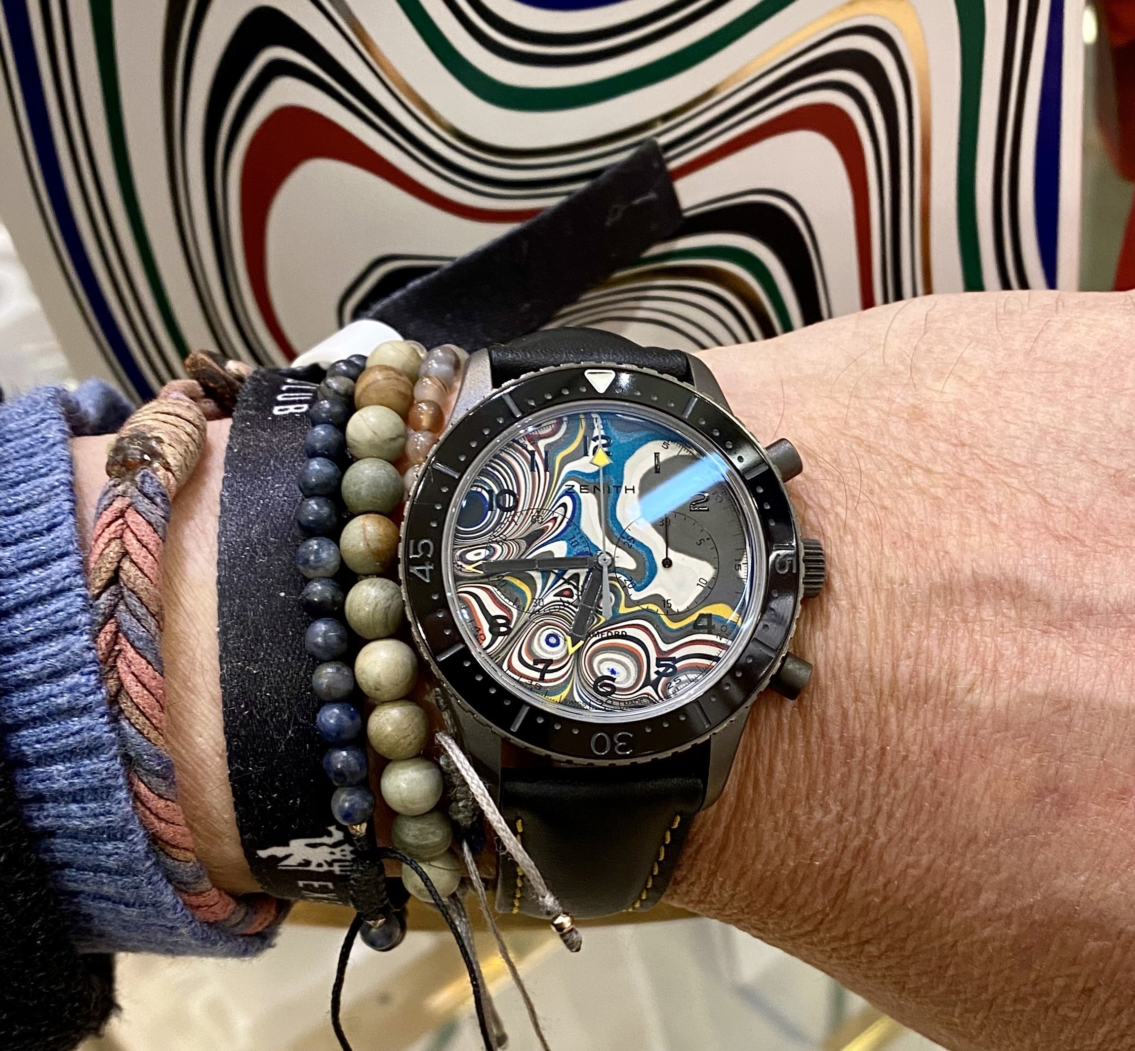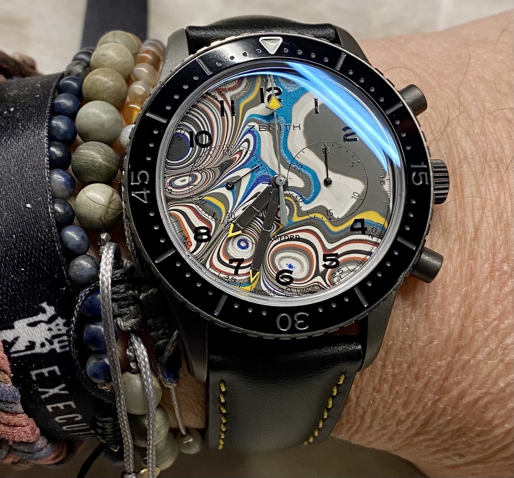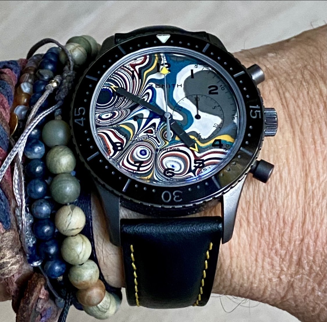Customised by Bamford in partnership with Zenith, this X Black Badger Zenith Pilot Chrono TIPO CP-2 is a limited efeotion 1/1! Designed in collaboration with Black Badger, this Chrono Pilot features a unique dial of collective overspray from the 1970’s to 1990’s Ford Michigan Paint Factory known as Fordite. Nothing need be said about the El Primero 4069 Automatic Movement, Min 50 hours Power Reserve, Central Chronograph and 30 minute Counter Itself!