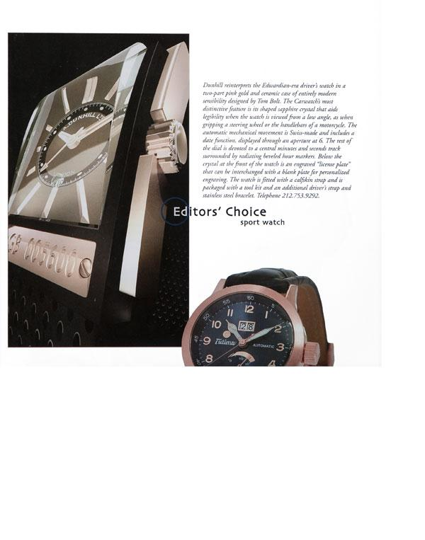The automatic mechanical movement is Swiss-made and includes a date function, displayed through an aperture a 6. The rest of the dial is devoted to a central minutes and seconds track surrounded by radiating bevelled hour markers. Below the crystal at the front of the watch is an engraved “license plate” that can be interchanged with a blank plate for personalized engraving. The watch is fitted with a calfskin strap and is packaged with a tool kit and an additional driver’s strap and stainless steel bracelet. Telephone 212.753.9292.