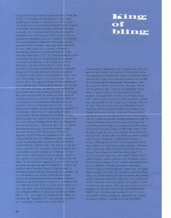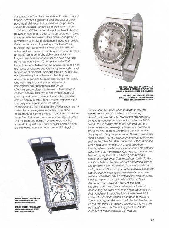 You play with fire you get burned. This however is not such a piece. This is a tourbillion amongst tourbillions and the fact that Mr. Mille made one of the 30 pieces with a baguette set case? He must have been thinking of me! I wish I were so important! He actually set 5 of the 30 with stones. OK, sales pitch over and I’m not saying there isn’t anything seedy about diamond set watches. That would be stupid. To the uninitiated of course they look like something from a cheesy porno film and actually I do have a little bit of a dirty secret . . . One of my greatest pleasures is diving into the ocean wearing an offensive diamond clad piece. Some might say it’s actually the relief of seeing it still on my wrist as I get out but it’s not. Gold, diamonds, sun and salt water are the best ingredients for one of life’s ultimate cocktails of debauchery. So what next then? Nostradamus said that world war 3 would be fought with bows and arrows. So perhaps shortly I’ll go back to wearing Tag Heuers again. But that would be just fine by me as theone thing that dealing an collecting watches has taught me over the twenty years is, it’s the journey not the destination that matters.
