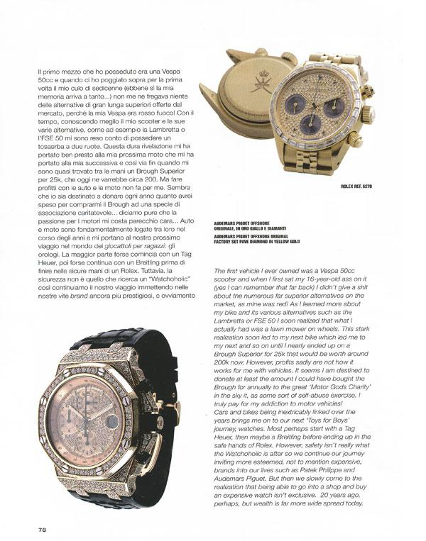 The first vehicle I ever owned was a Vespa 50cc scooter and when I first sat my 16-year-old ass on it (yes I can remember that far back) I didn’t give a shit about the numerous far superior alternatives on the market, as mine was red! As I learned more about my bike and its various alternatives such as the Lambretta or FSE 50 I soon realized that what I actually had was a lawn mower on wheels. This stark realization soon led to my next bike which led me to my next and so on until I nearly ended up on a Brough Superior for 25k that would be worth around 200k now. However, profits sadly are not how it works for me with vehicles. It seems I am desined to donate at least the amount I could have bought the Brough for annually to the great ‘Motor Gods Charity’ in the sky, as some sort of self-abuse exercise. I truly pay for my addiction to motor vehicles! Cars and bikes being inextricably linked over the years brings me on to our next ‘Toys for Boys’ journey, watches. Most perhaps start with a Tag Heuer, then maybe a Breitling before ending up in the safe hands of Rolex. However, safety isn’t really what the Watchoholic is after so we continue our journey inviting more esteemed, not to mention expensive, brands into our lives such as Patek Philippe and Audemars Piguet. But then we slowly come to the realization that being able to go into a shop and buy an expensive watch isn’t exclusive. 20 years ago, perhaps, but wealth is far more widespread today.