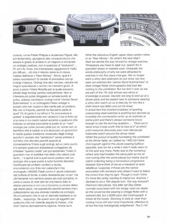 Next we decide the way forward is vintage watches. Timepieces you have to seek out, search for in specialist shops or markets even. Gradually the whole philosophy of why we were attracted to watches in the first place changes. We no longer want a shiny dick extension on our wrist; we now seek out watches like ‘James bond Submariners’ or steel vintage Patek chronographs that look like nothing to the uninitiated. But we don’t care; as we are part of the 1% club whose very ethos is knowledge is power. Secretly we long to end up at a dinner party and be seated next to someone wearing a shiny dick watch so as to feel pity for him like a child whom has fallen and cut his knee! In actual fact this inverted snobbery of sporting unassuming steel watches is anything but discrete as invariably the conversation ends up as watches at some point and there’s always someone brave enough to ask the burning question . . . “God you’d never know it was worth that to look at it” at which point everyone discusses your now ridiculously indiscrete watch around the dinner table! Whilst the pursuit of quietly humiliating the uninitiated at the dinner table, as I pitted my 1463 SS Patek chronograh against the Jacob wearing buffoon opposite, was fun for a while it didn’t really seem to hit the spot any more. Partly due to the numerous others who had trodden the same path as me all now lusting after the same pieces but mainly due to watch collecting being a horrendous progressive disease! Some think of me as a maverick or even rebellious I suppose. If those are the names associated with someone who doesn’t want to follow the crowd then they’re right. Though in truth I think it’s more like vanity, wanting to stand out. Anyhow, I decided to do a 180-degree turn. The way forward? Diamond clad pieces. Not after set Day-Dates normally associated with the dodgy used car dealer as this would be like wearing a vintage Rolex with a restored dial, but a 6269 pave dial Cosmograph. It ticked all the boxes. Stunning to look at, rarer than rocking horse shit and more importantly offensive to all but the truly horologically enlightened. The 0.1%! Complication has been used to death today and means very little in the skilled watch-making department. You can see Tourbillions retailed today by various nondescript brands for as little as 1500 Euros. This is mainly due to the fact that corners have been cut so severely by Swiss outsourcing to China that it’s come round to bite them in the ass.
