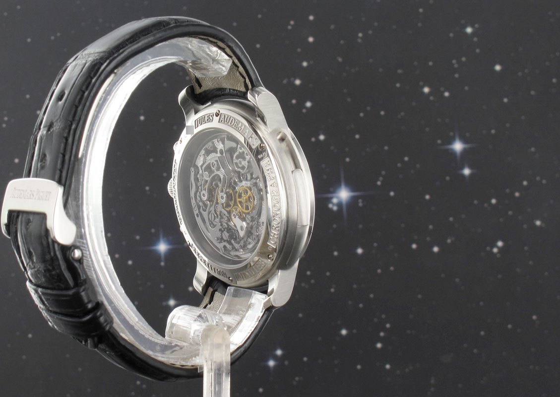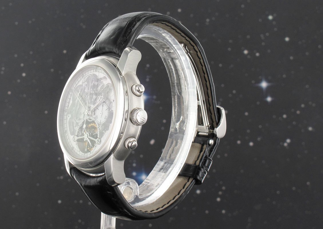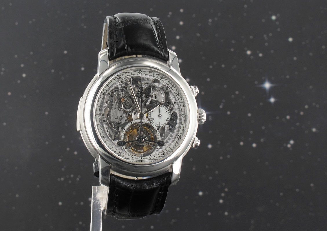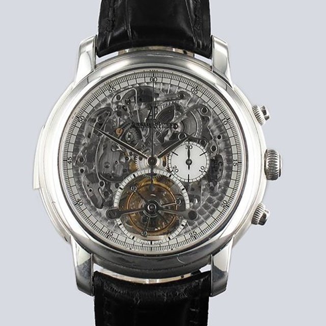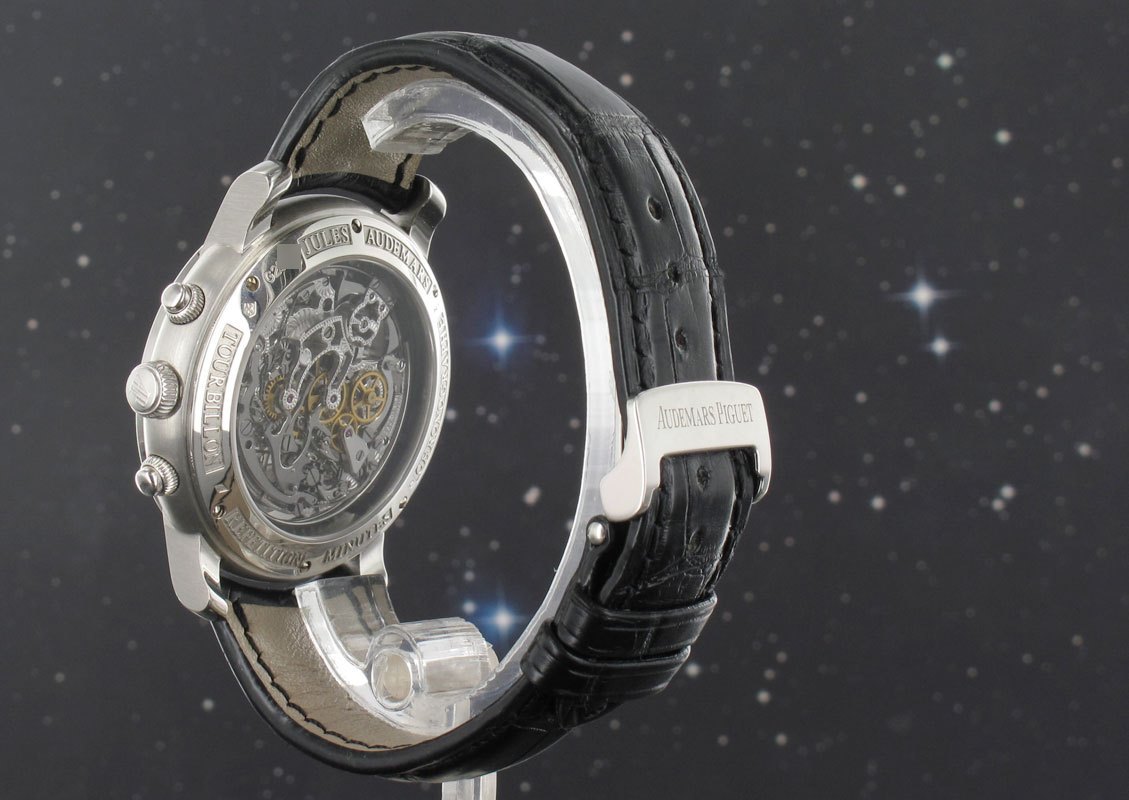Affectionately known as "La Bombe" due to the cosmetic detailing of the finishing of the skeleton dial this discontinued minute repeating tourbillon truly is a work of art. While incorporating an enamel sub dial for the chronograph watching the minute repeater operate through the skeleton dial is a joy to behold.