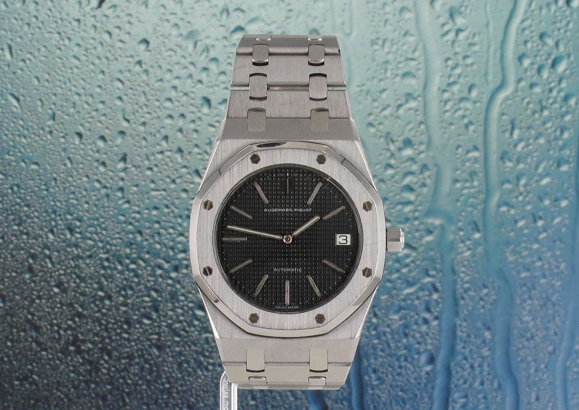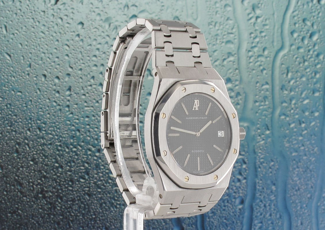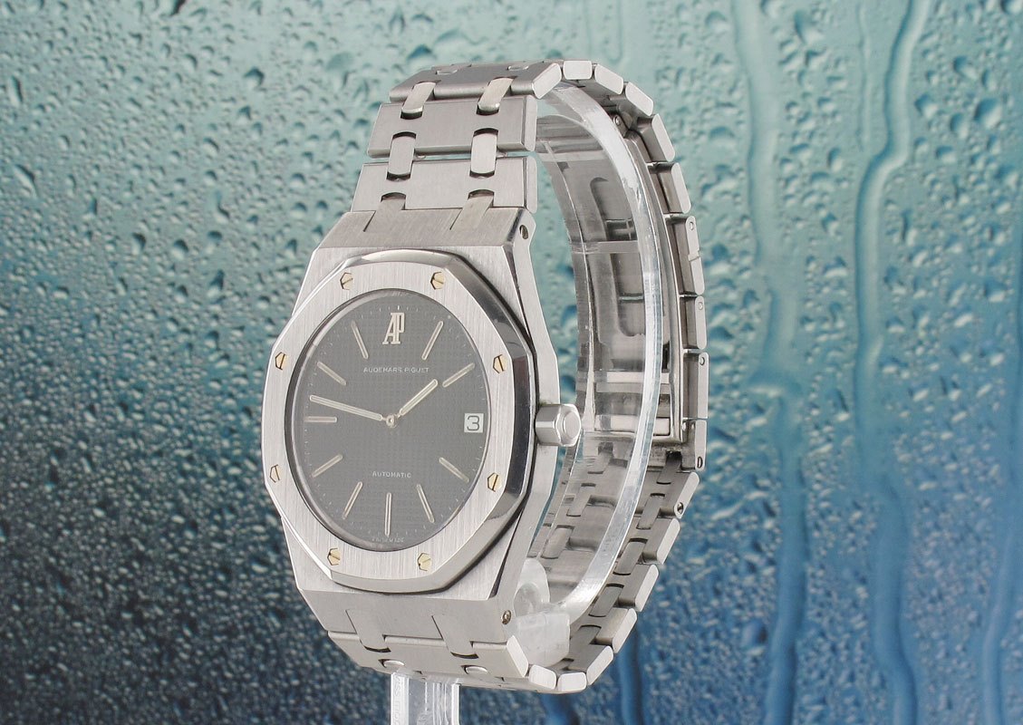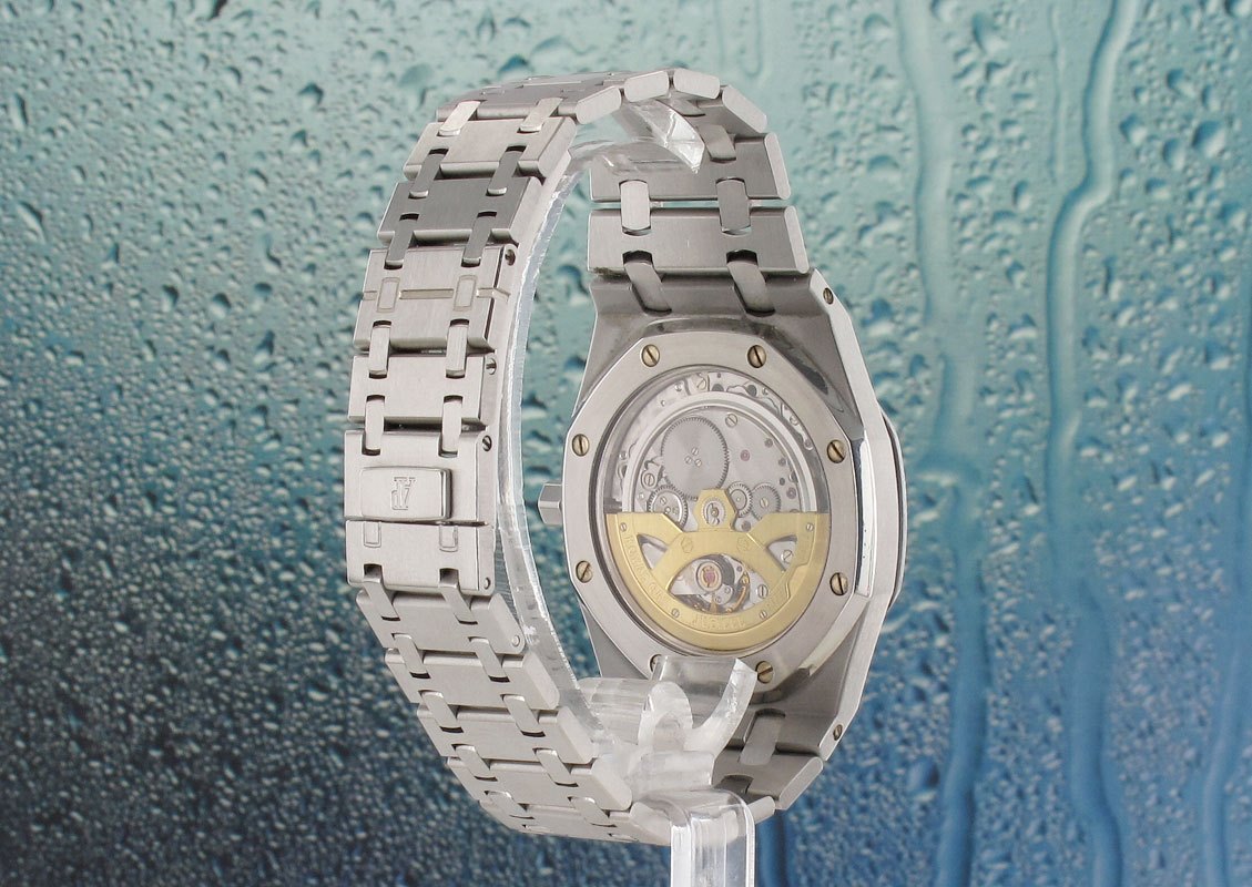 Produced as a limited edition of only 1000 pieces to commemorate the 20th anniversary of the Royal Oak model. With the 2121 caliber movement (Audemars thinnest automatic with a central rotor) originally created by Jaeger Le Coultre for Gerald Genta to use on this model as well as for Patek Philippe and Vacheron Constantin. This version incorporates a display back with solid gold oscillating weight and is arguably the last of the old school Genta incarnations. The anomaly with this example being that it has what appears to be a prototype or test dial due to the micro sized printing which is 100 % original.
