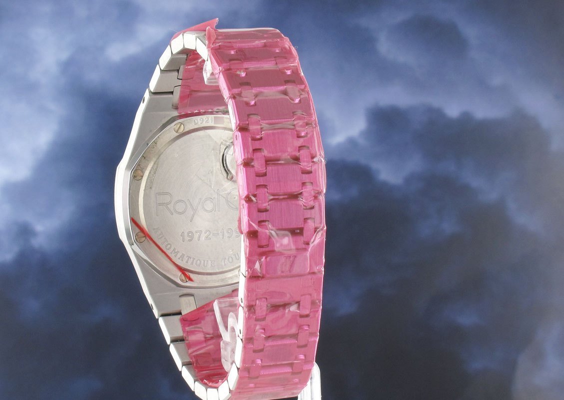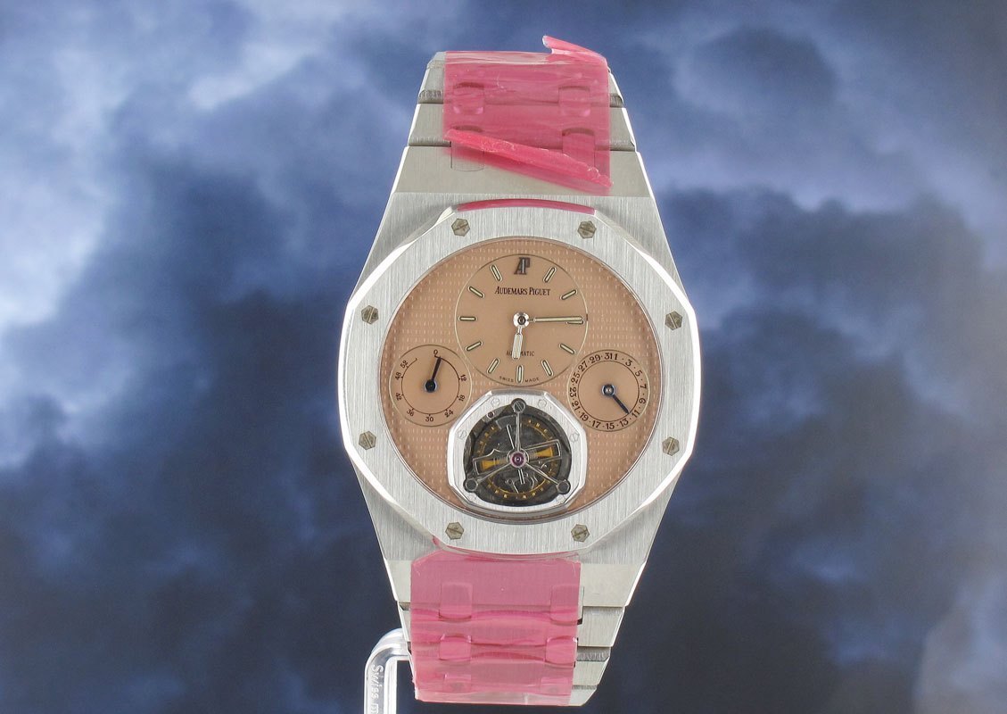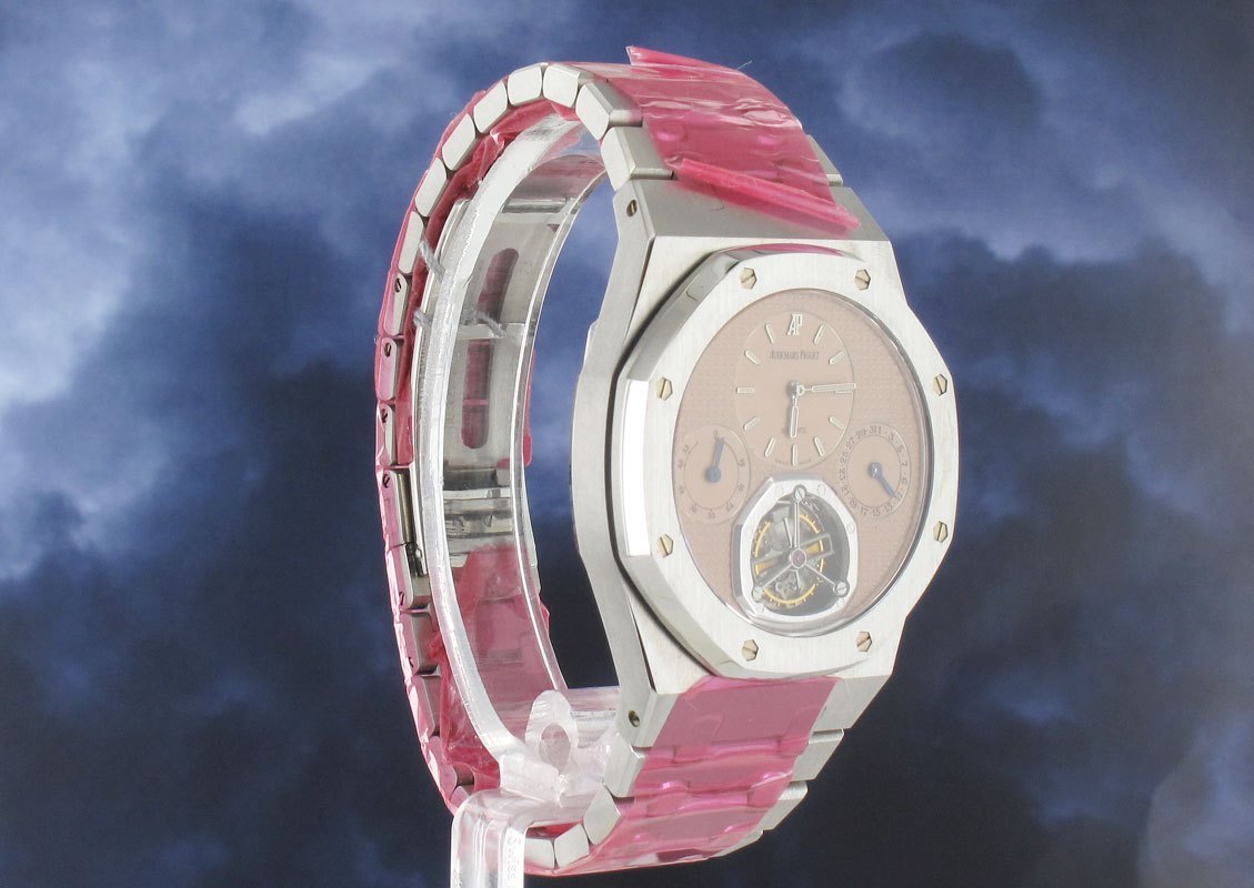 Unworn new old stock example produced as a limited edition of only 25 pieces in 1997 to commemorate the 25th anniversary of the Royal Oak. Incorporating an automatic tourbillon as well as a winding crown incorporated in the case back.