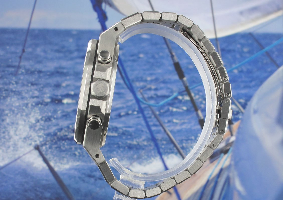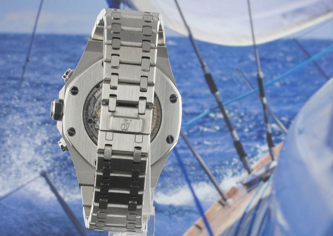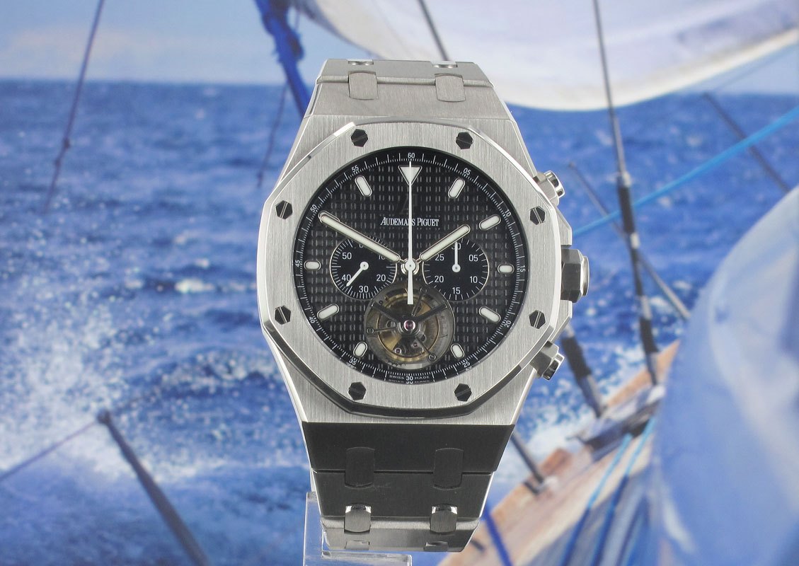 Incorporating a one minute Tourbillon located at the six o'clock position. The chronograph function is fitted with a titanium lever in the mechanism, thus eliminating the phenomenon of the "jumping chronograph hand" when starting the chronograph function. AP caliber 2889 movement beats at 21,600 vph & contains 25 jewels with an approximate Power Reserve of 70 hours. The main plate & bridges are made of Nickel Silver - an alloy which resists oxidation & remains stable over long periods of time.