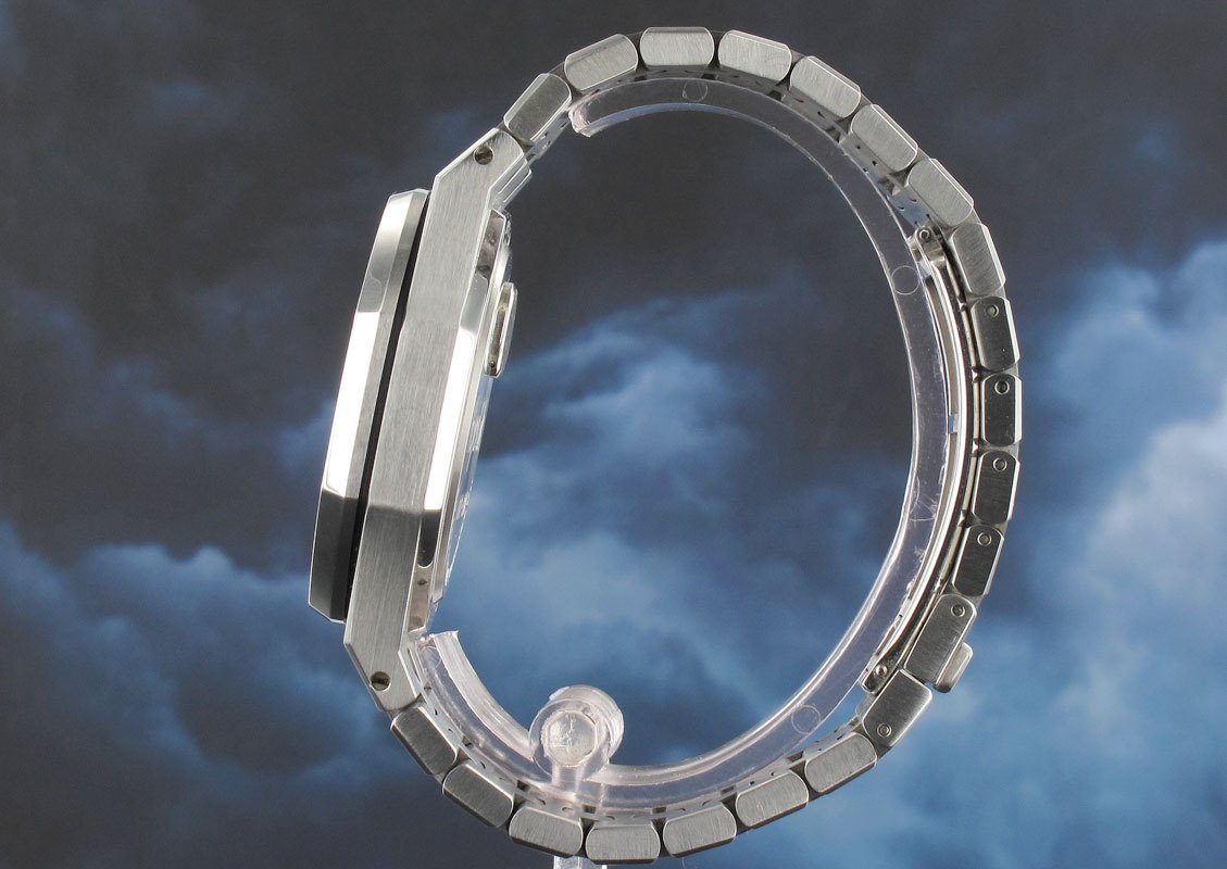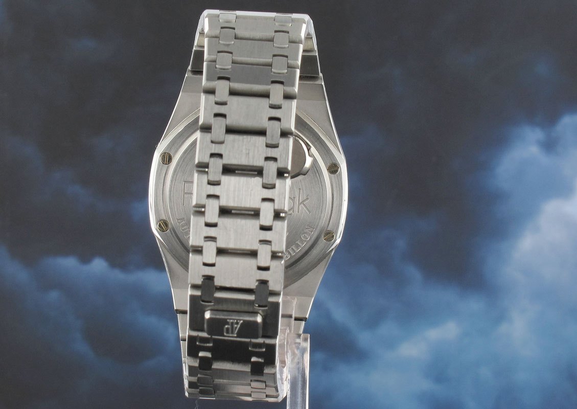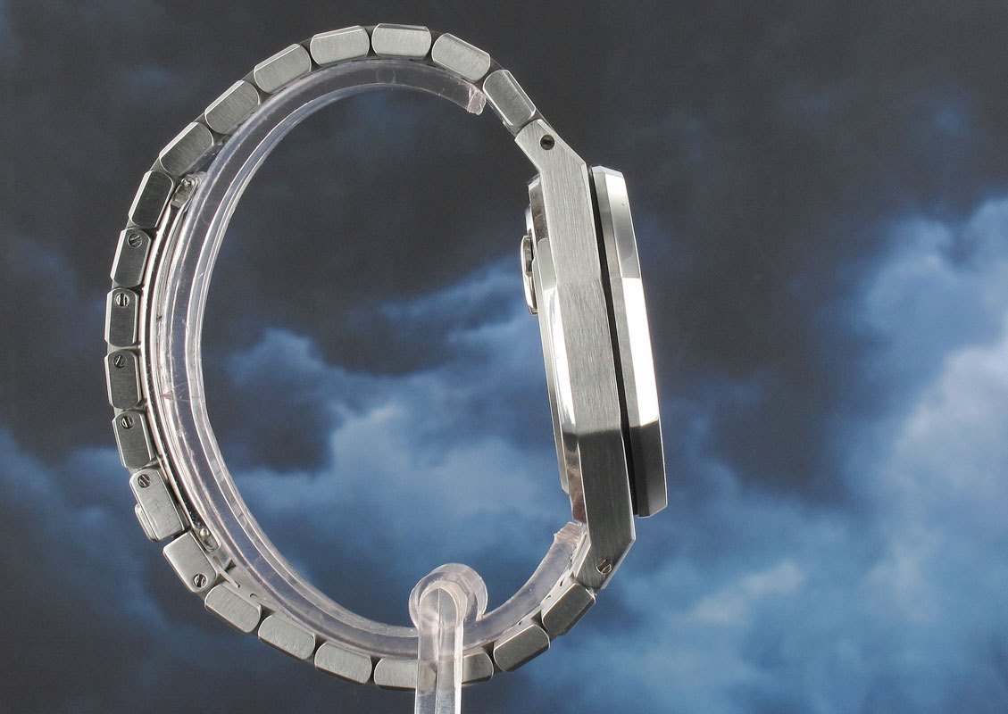 Exceptional limited edition of only 25 pieces in steel of which only a hand full were released with the blue rather than pink dial normally reserved for the platinum pieces. Produced to commemorate the 25th anniversary of the Royal Oak and still remaining the only automatic RO tourbillon to have been manufactured, which is just as well due to the fact that they seem to have forgotten to give it a winding crown! So much more chic than their modern chrono tourbillon counterparts. This example comes with the additional pink dial as well as a bespoke made to order strap by AP to match the blue dial with adapters and another brown croc strap as well as a nearly €4000 euro service receipt from Dec 2012 with its warrantee still outstanding.