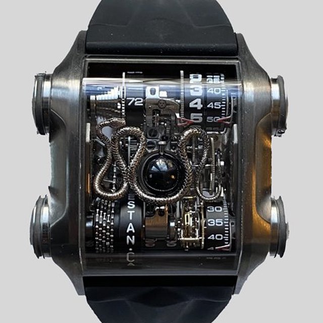 A phenomenal example of wrist architecture utilising a chain fuse Tourbillon movement. A watch utilising both desipherable madness & exquisite method by way of it's beautifully finished movement.