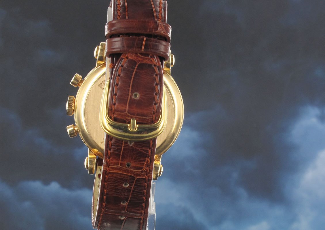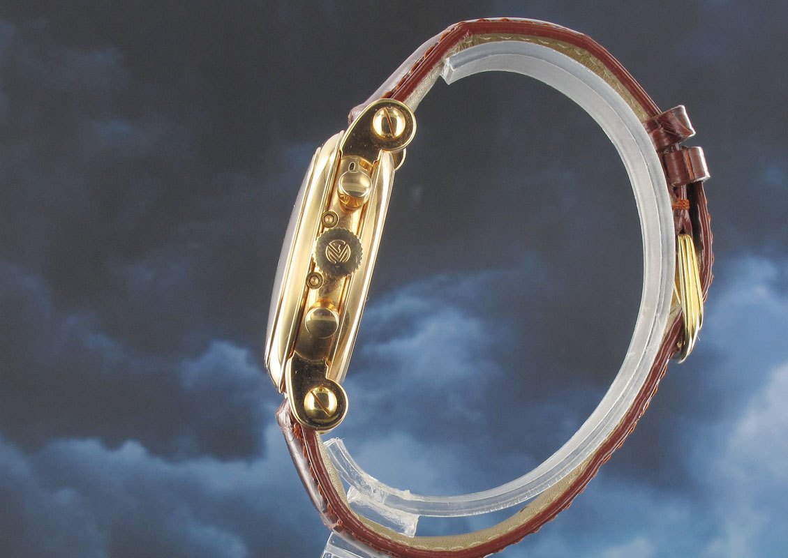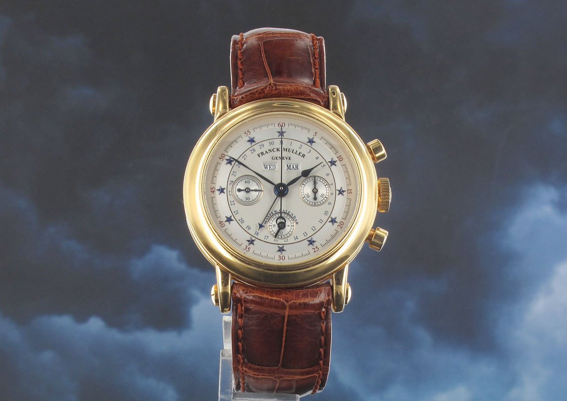 Prototype version of the Muller Master Calendar still with part of the case back seal intact in the engraving. Produced in 1995 as a limited edition of only 150 pieces incorporating a stunning two tone matt and guilloche star dial, triple calendar, moon phase and chronograph.