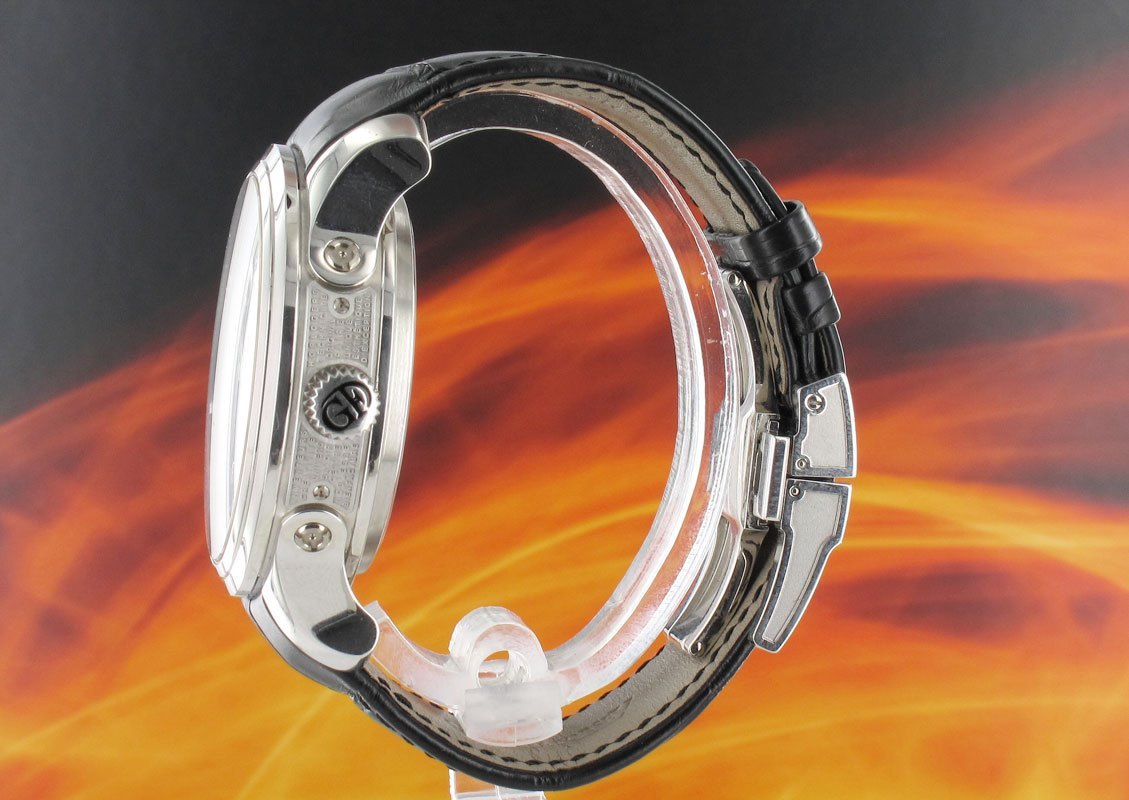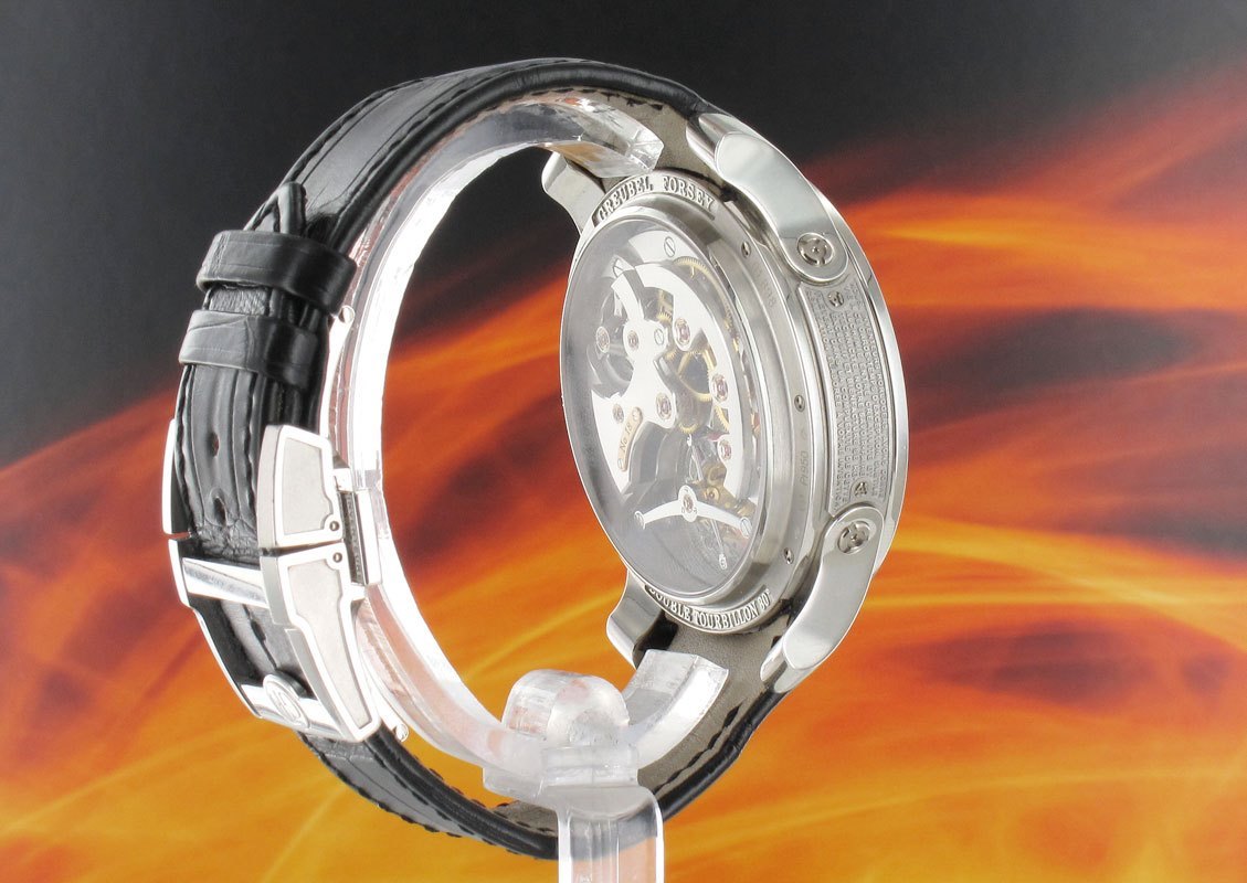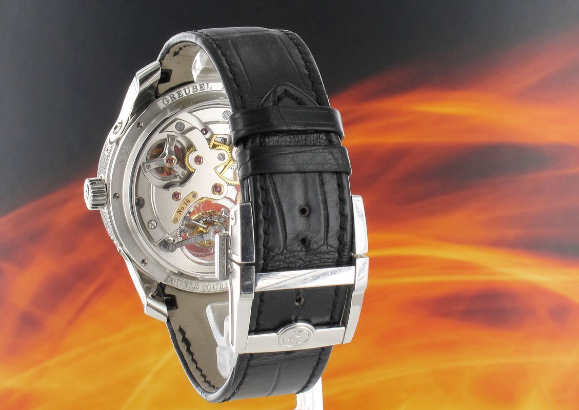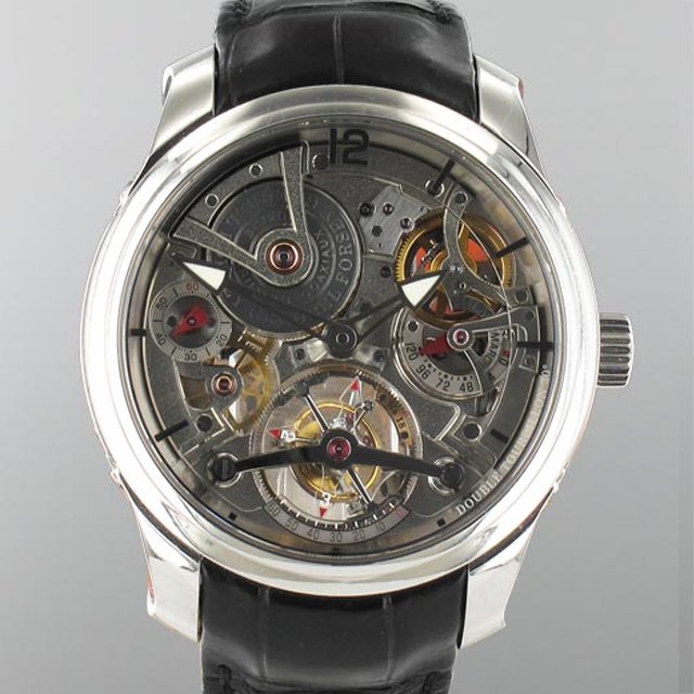G&F are without doubt the greatest Tourbillon mechanisms ever to grace a wristwatch case & this example, known as the 'Architectural piece' perhaps boasts the quality of their workmanship the best being their 1st skeletal example ever made. It's far more aesthetically pleasing than its white or rose gold syblings due to it having dispensed with the black PVD base plate due to it being in platinum. Its balance set at 30 degrees so as to best defy the effects of gravity is of a quality no Tourbillon has ever or probably ever will come close to replicating. In their own words by virtue of its fully visible mechanism, the Double Tourbillon Technique is a showcase for Robert Greubel and Stephen Forsey's unique blend of technical mastery coupled with superb aesthetic finishing. Their innovative double tourbillon system with one tourbillon (inclined at 30 degrees) rotating in 60 seconds inside another rotating every four minutes. This is shown by the four-legged hand over the tourbillon. It's a shame that tourbillons have been used to the extent they have recently as examples such as this are often not given the time they deserve. There is no doubt that his piece represents the next level of old school watch making at its finest.