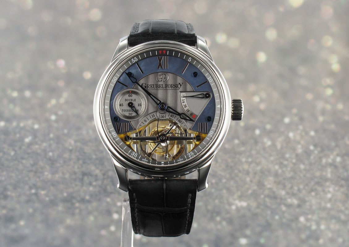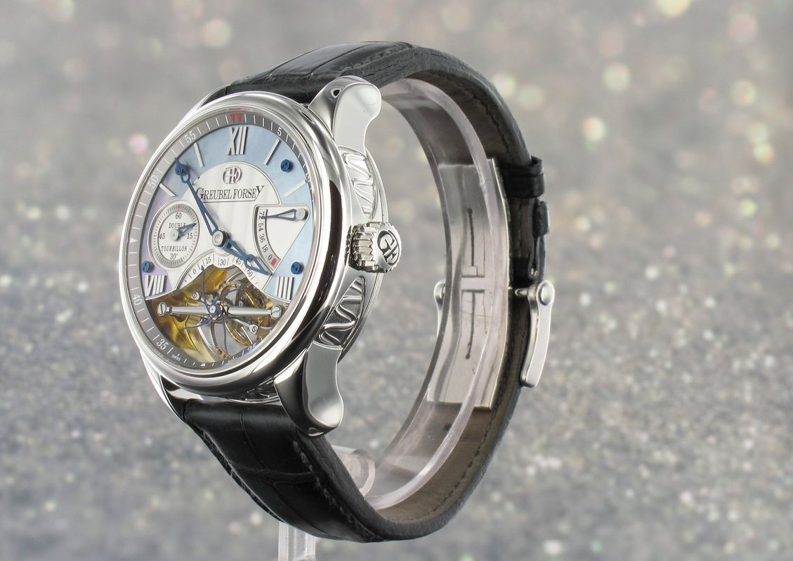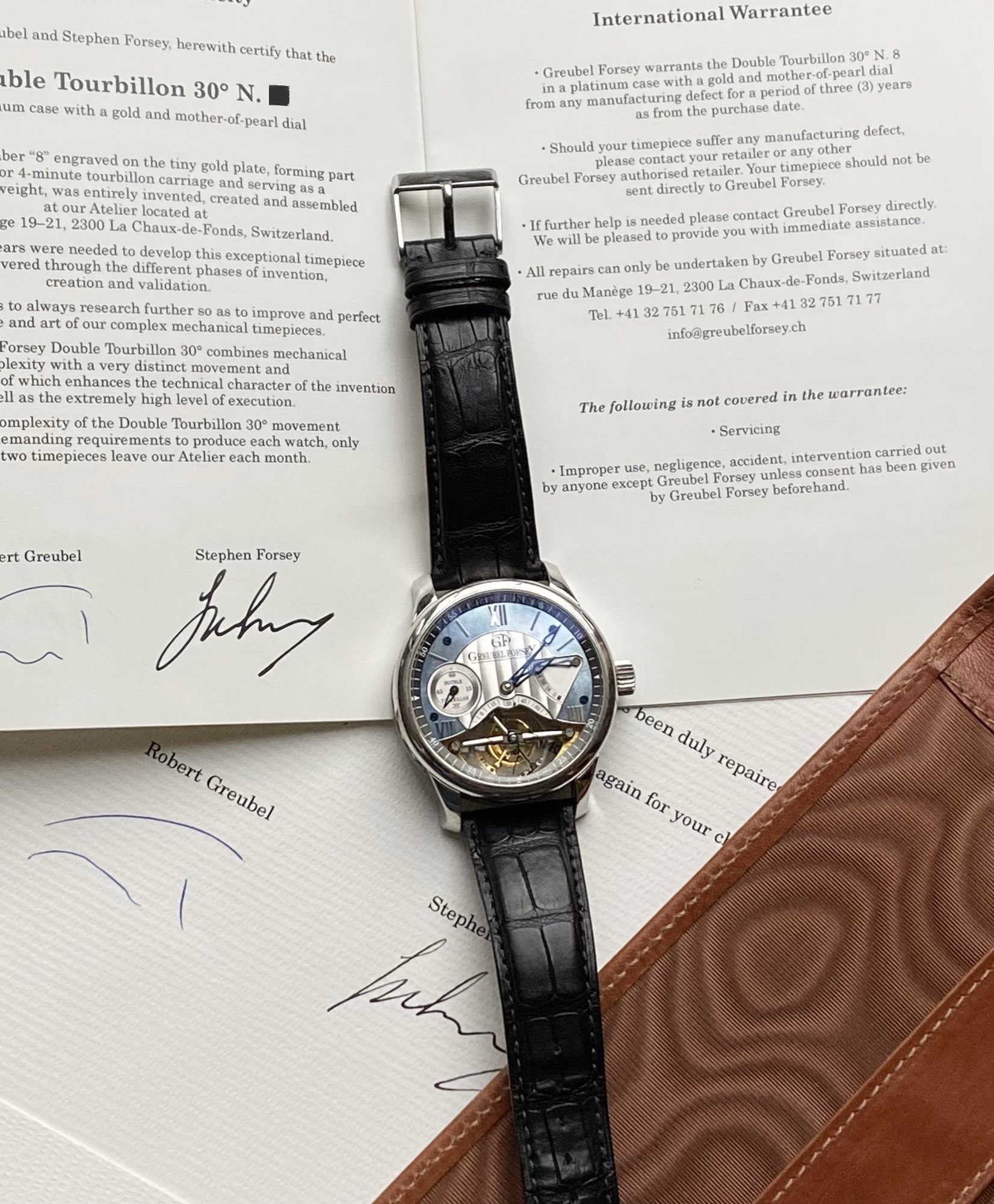 G&F are without doubt the greatest Tourbillon mechanisms ever to grace a wristwatch case & this example is of huge historical significance. Being not only one of the very 1st examples or a '1st series' it's also their sexiest variant being platinum with a dial that defies belief. Consisting of a partial MOP veneer in conjunction with its blue screws & engine turning it's a veritable feast for the eyes enough but Inset within a segment of the dial at the 6 o'clock position is the icing on the cake. It's their patented double Tourbillon with a balance set at 30 degrees so as to best defy the effects of gravity. Of a quality no Tourbillon ever has or probably ever will come close to replicating.
