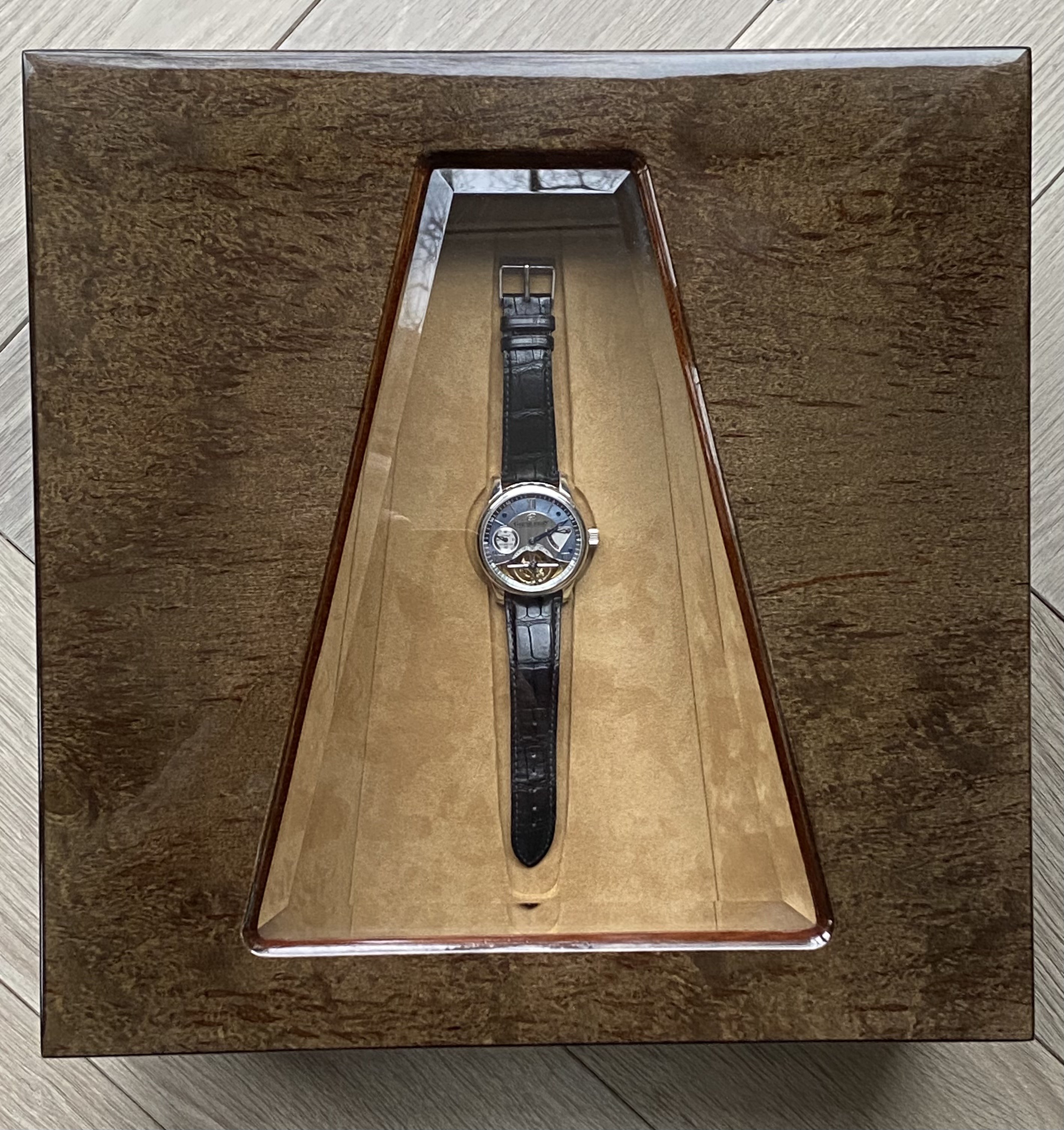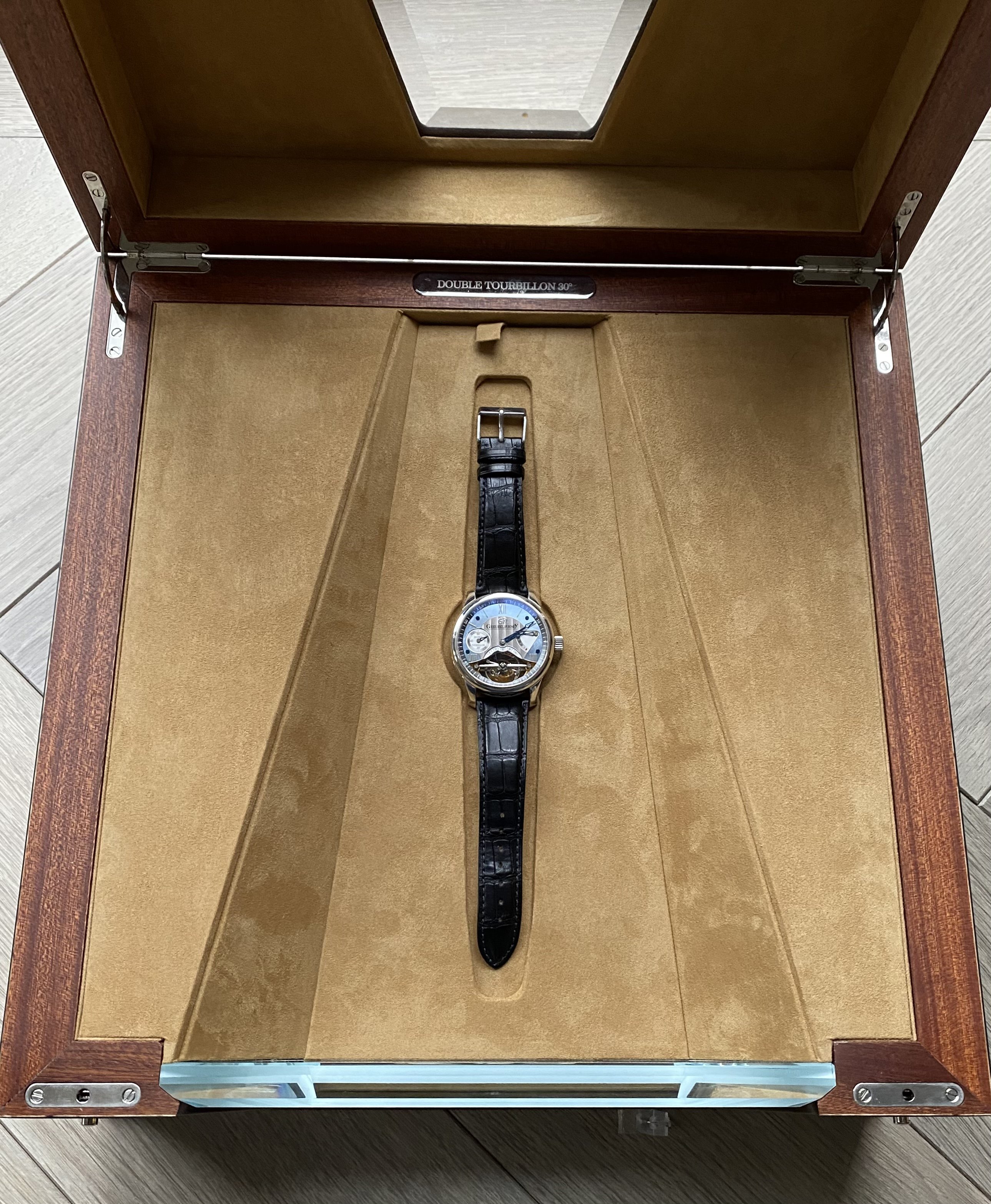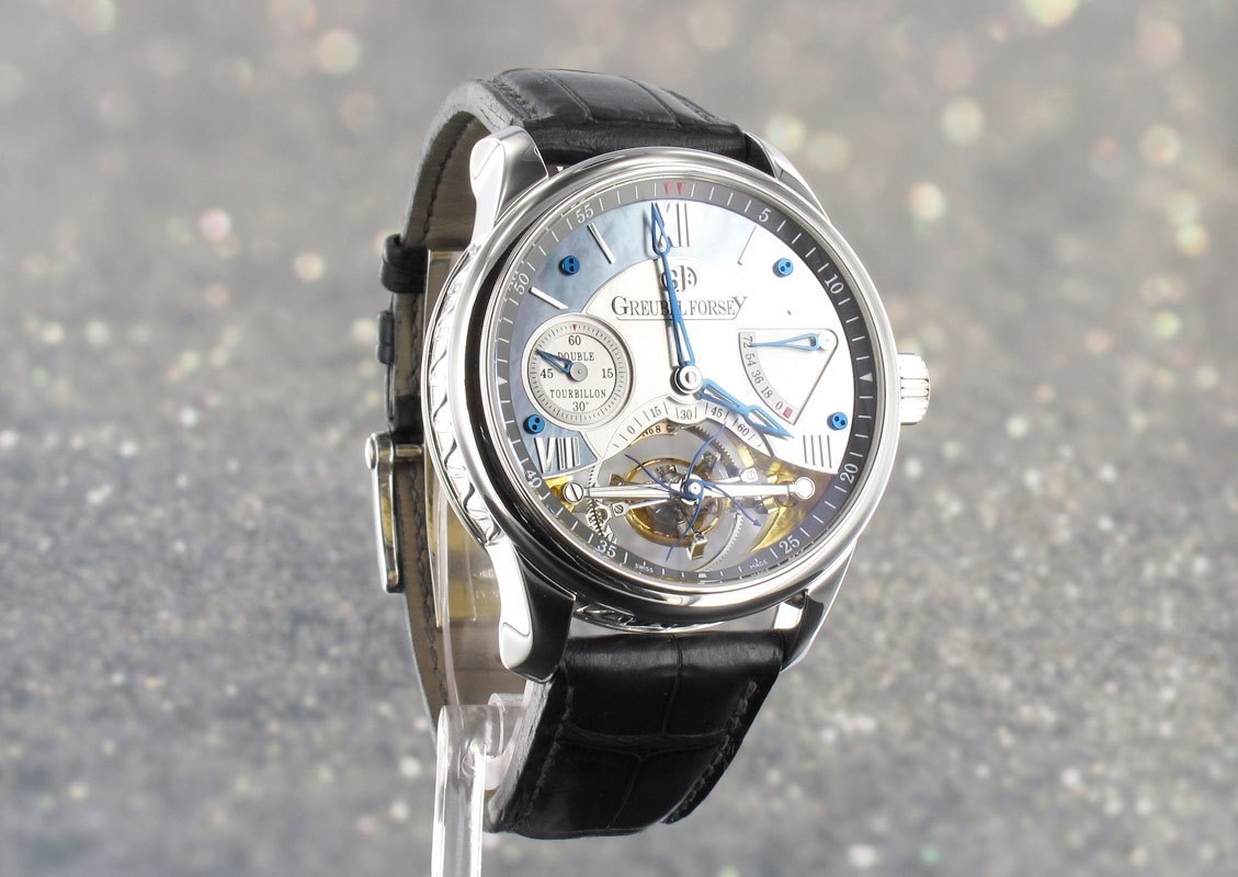 G&F are without doubt the greatest Tourbillon mechanisms ever to grace a wristwatch case & this example is of huge historical significance. Being not only one of the very 1st examples or a '1st series' it's also their sexiest variant being platinum with a dial that defies belief. Consisting of a partial MOP veneer in conjunction with its blue screws & engine turning it's a veritable feast for the eyes enough but Inset within a segment of the dial at the 6 o'clock position is the icing on the cake. It's their patented double Tourbillon with a balance set at 30 degrees so as to best defy the effects of gravity. Of a quality no Tourbillon ever has or probably ever will come close to replicating.