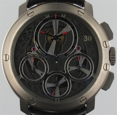 The first round men's watch created by Guy Ellia.The Jumbo Chrono 50 mm in diameter, with its caliber in slate grey has an oscillating weight that is unique in its kind being totally circular, it is revealed through the segments in the same way that alloy wheels reveal the disk brakes of a car. The function plate, specially designed by the brand's founder, actually acts as the dial. Its open structure reveals the wheels with their high level of finish and their unique gear teeth. They transmit the information to the circled counters whose position maximizes the power of the instrument's face. Its strength is also derived from one important detail: its fully visible rotating date disc with the date figures cut out like lace so the date is the figure shown in the light zone in the otherwise dark dial.