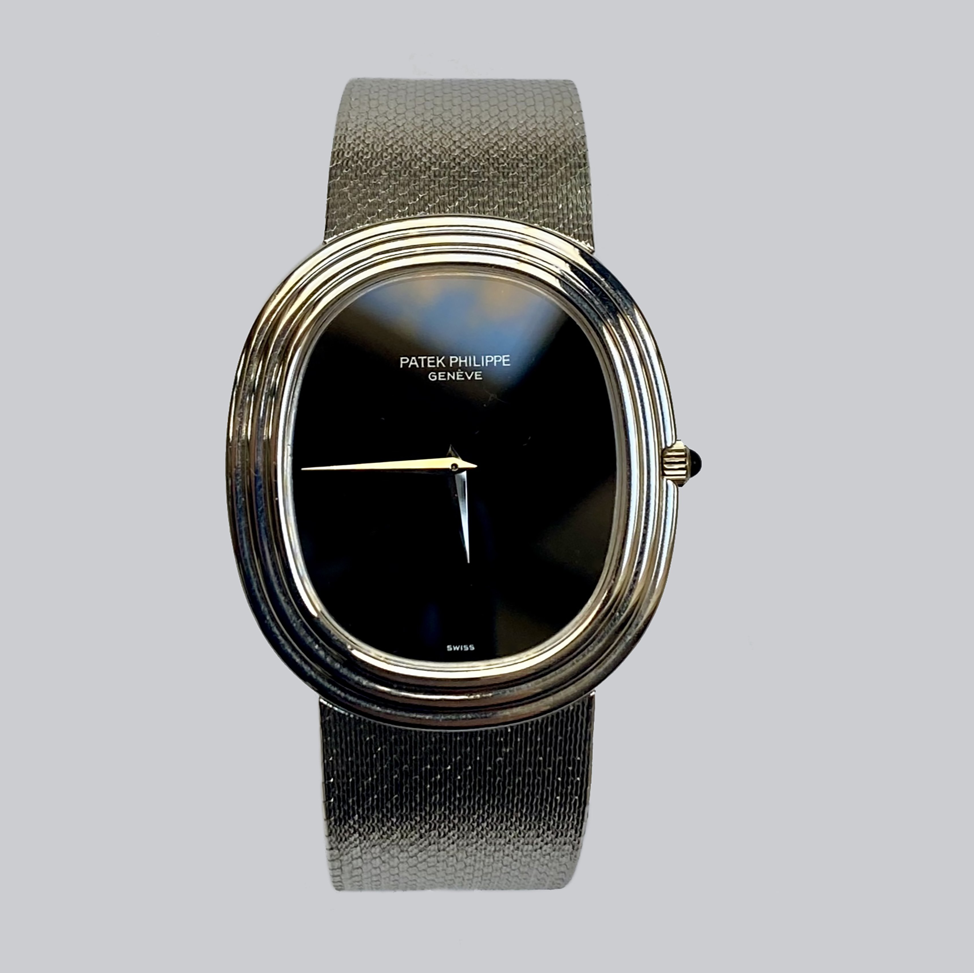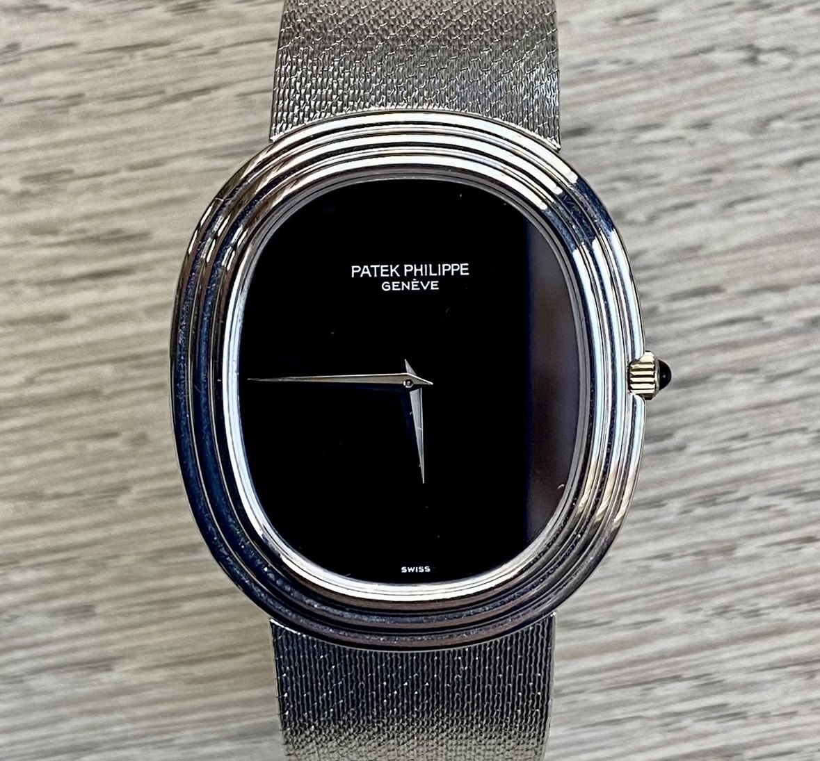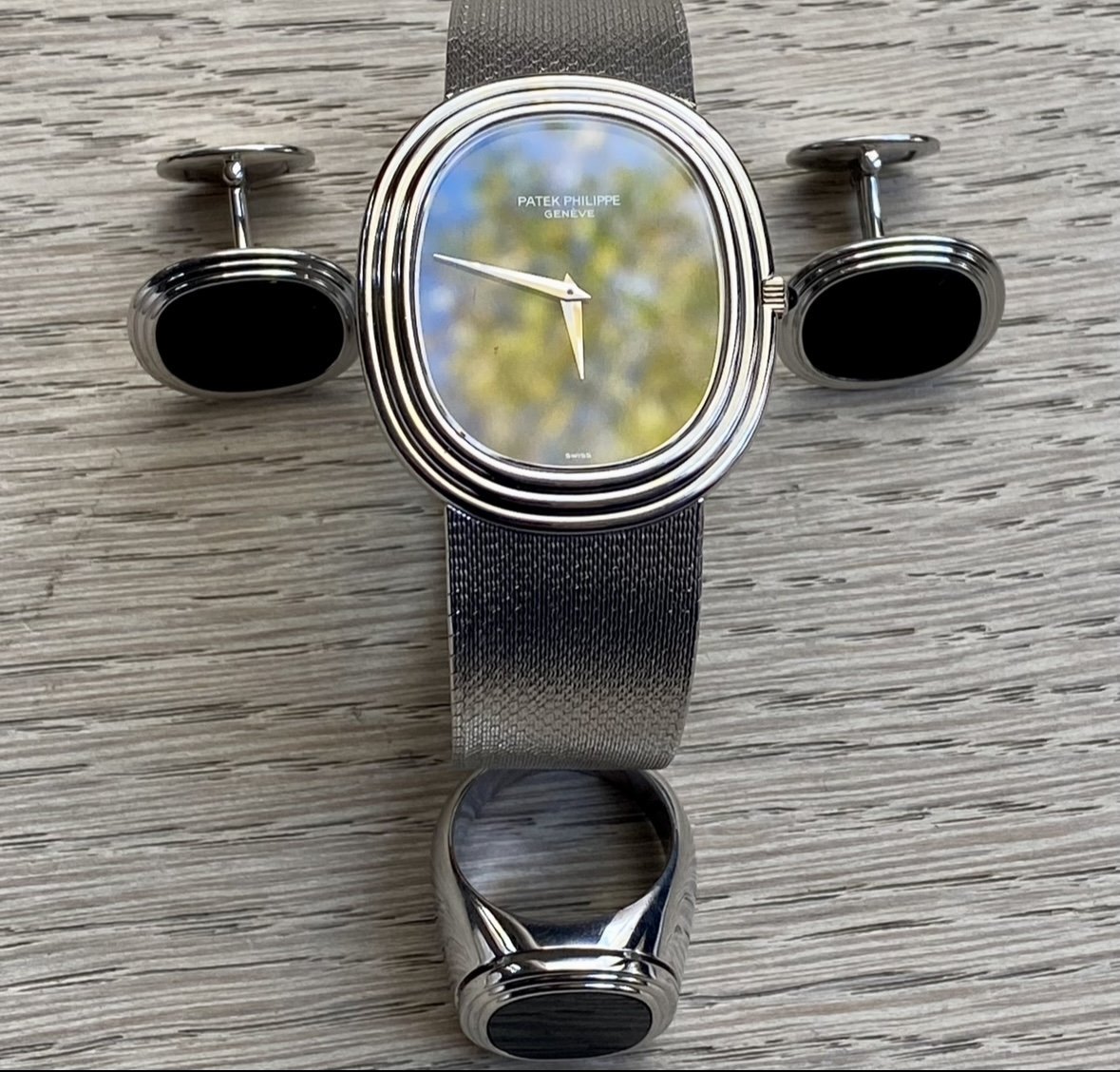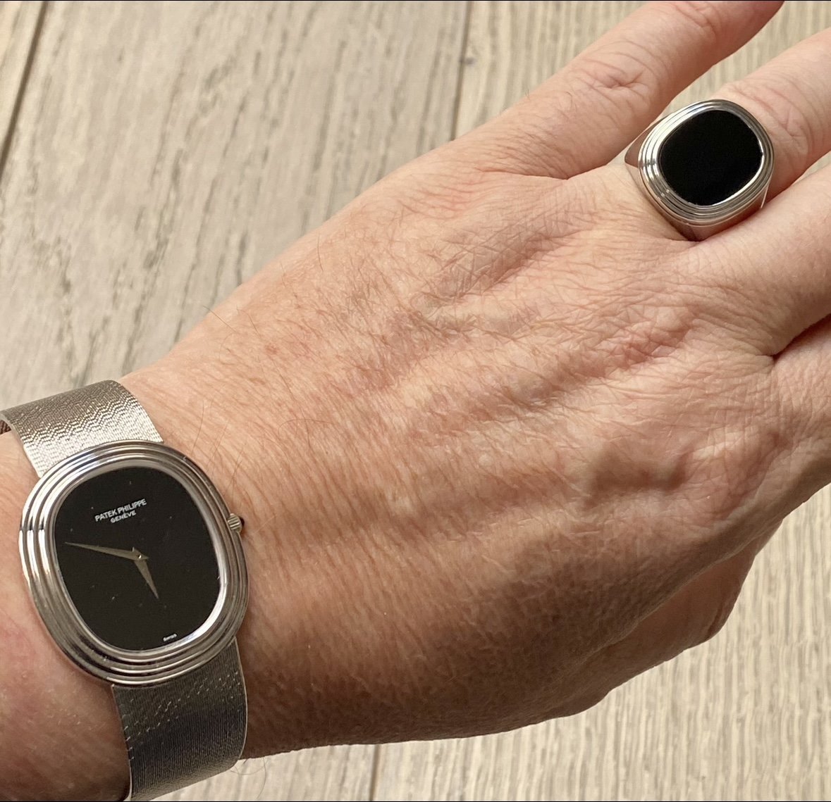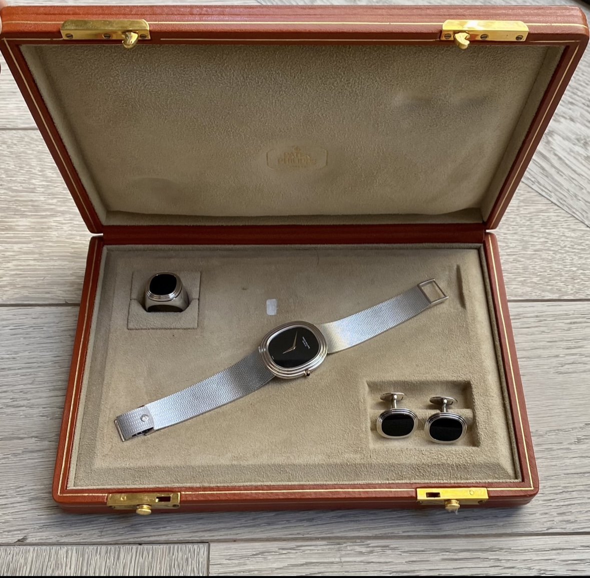 Complete with box and papers, this high-end black onyx Patek set consisting of wristwatch, cufflinks and ring is about as gangster as you could get in the 1980's.