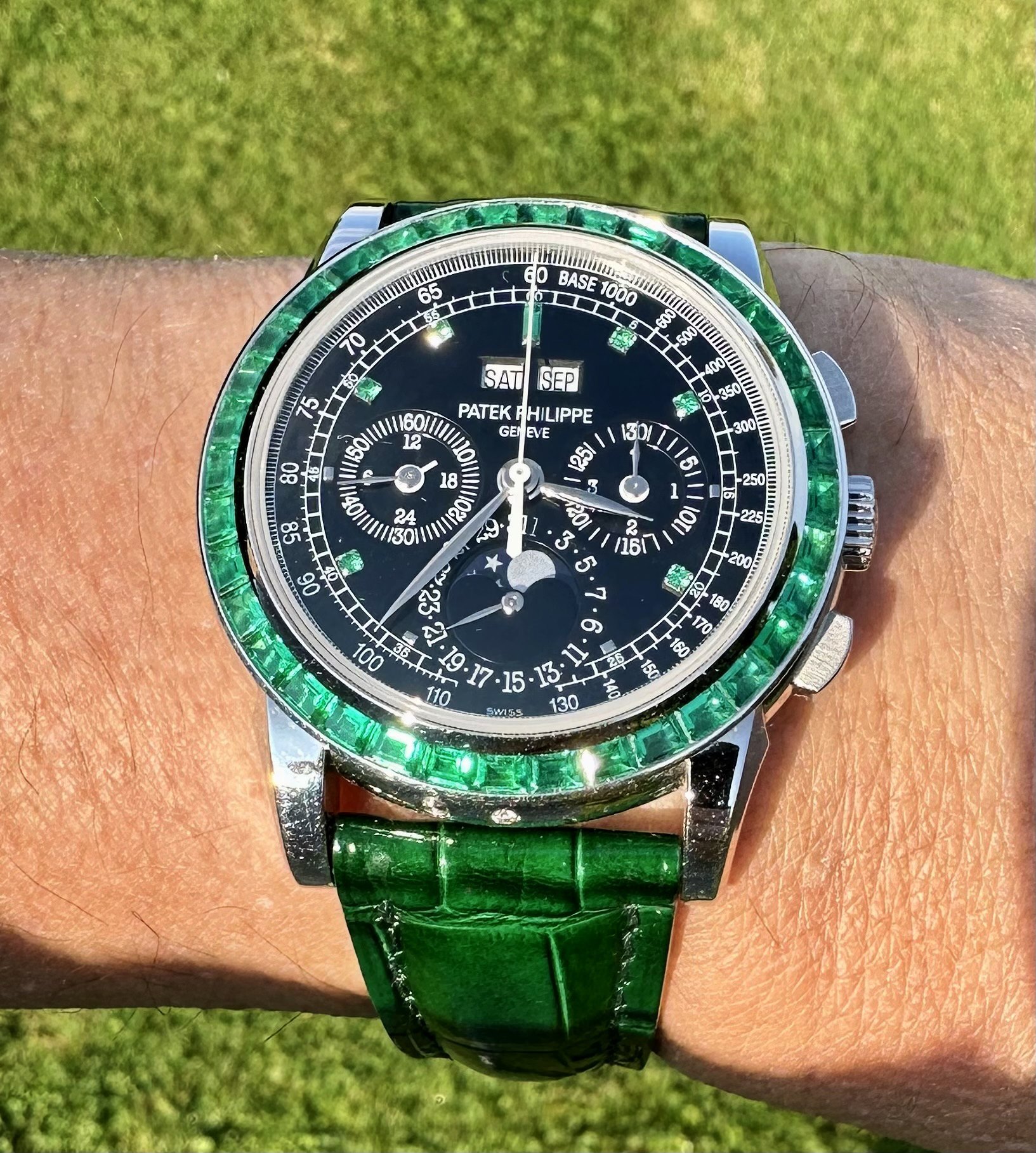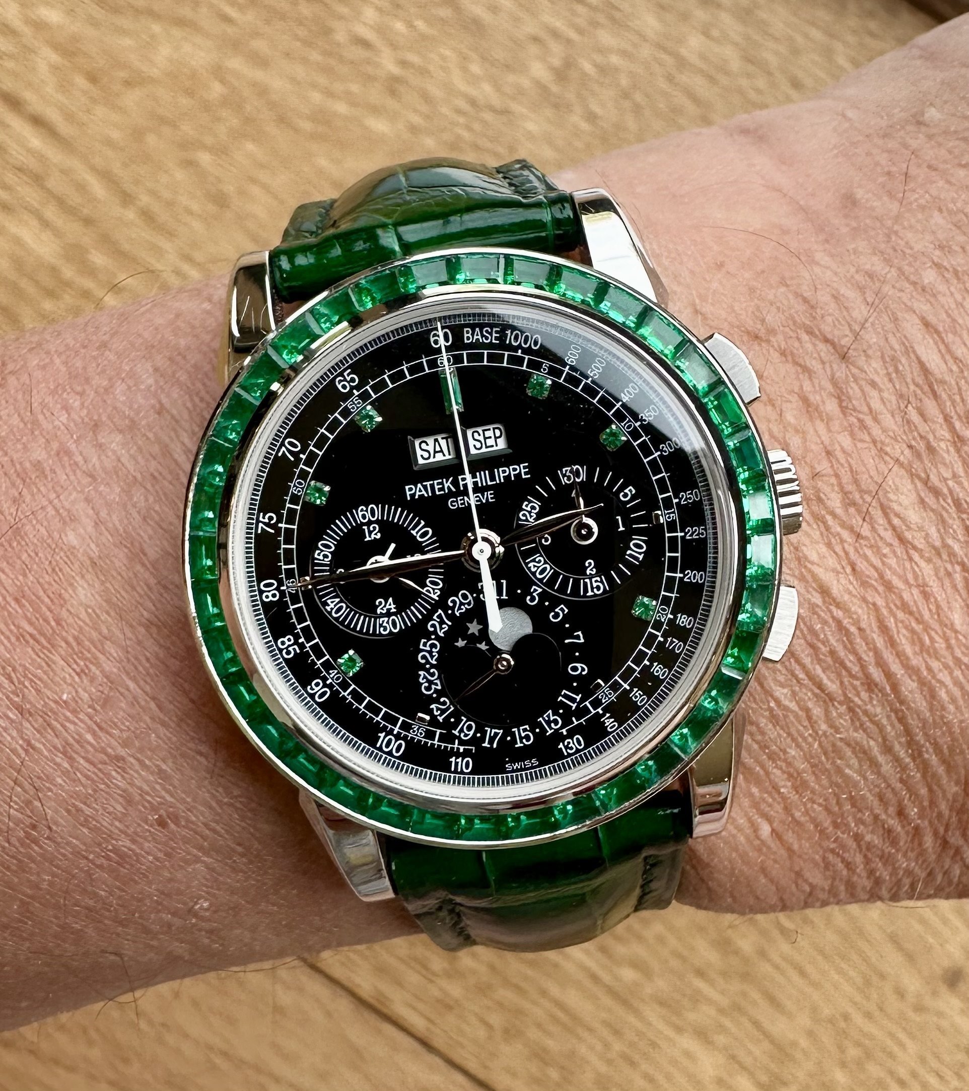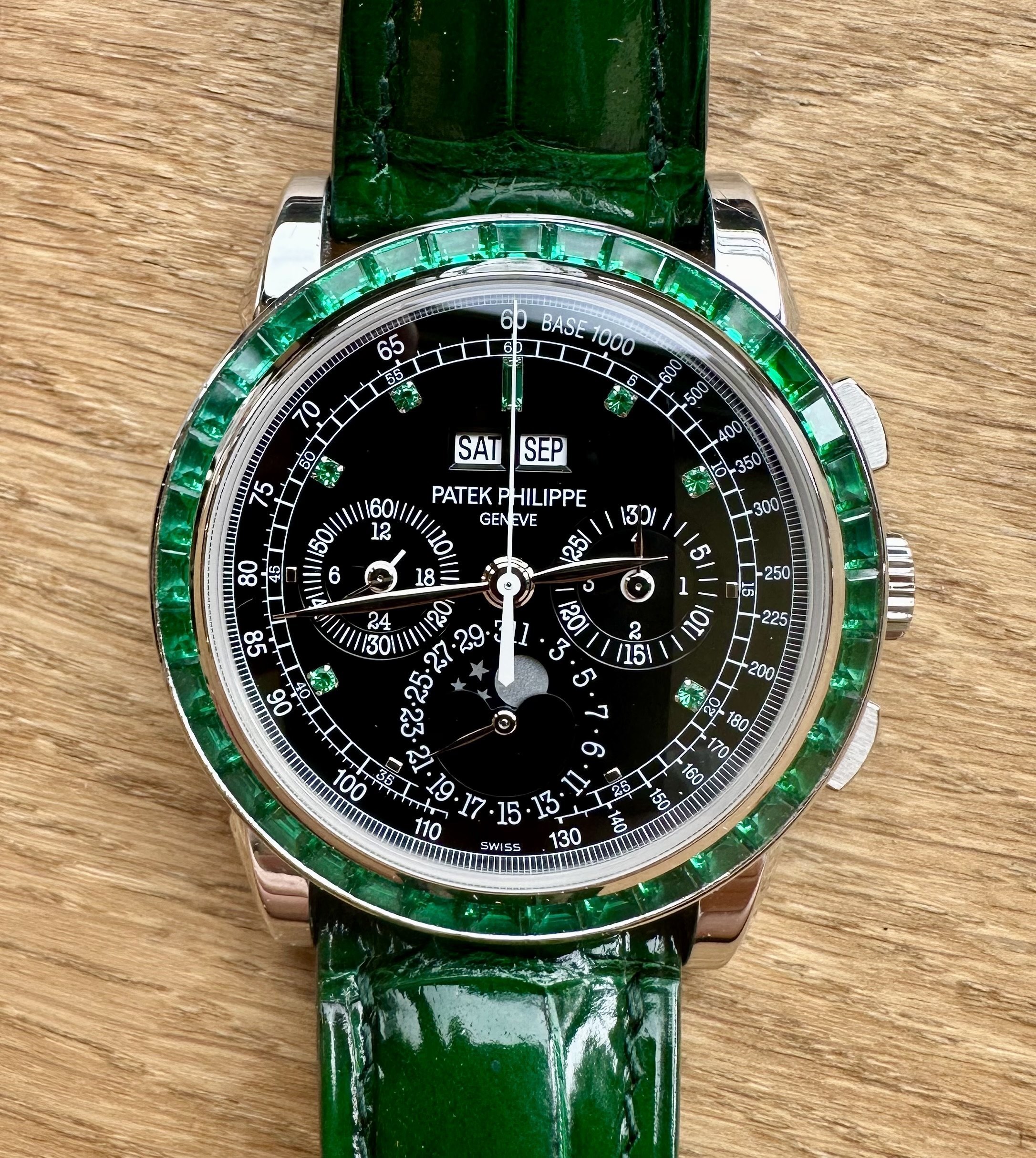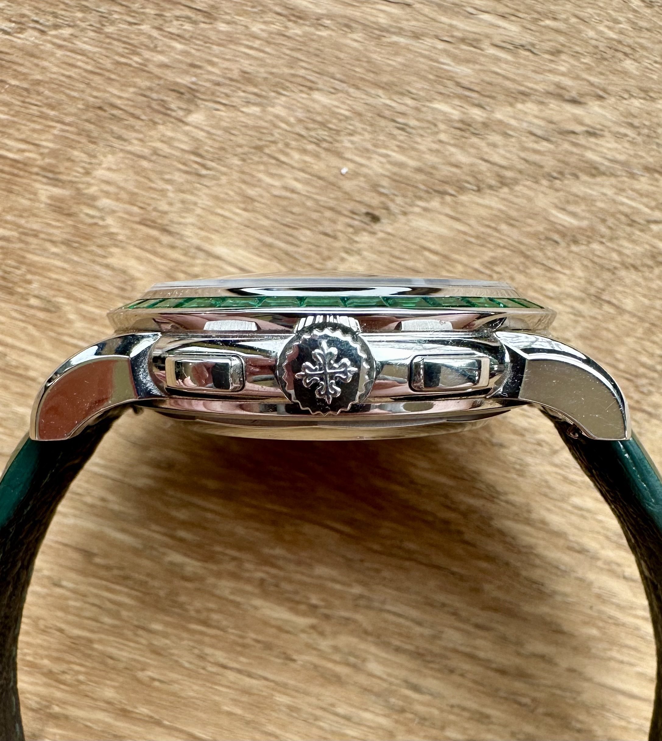 Many view the 5971P as the greatest rendition of Patek's now flagship complication, the perpetual calendar chronograph. The 13P with its emerald adornments, has to be the Zenith of the aforementioned with only five currently known to exist. The most recent similar example sold was of the more cost-effective ruby variety which sold for £930,000 2 years ago at auction.