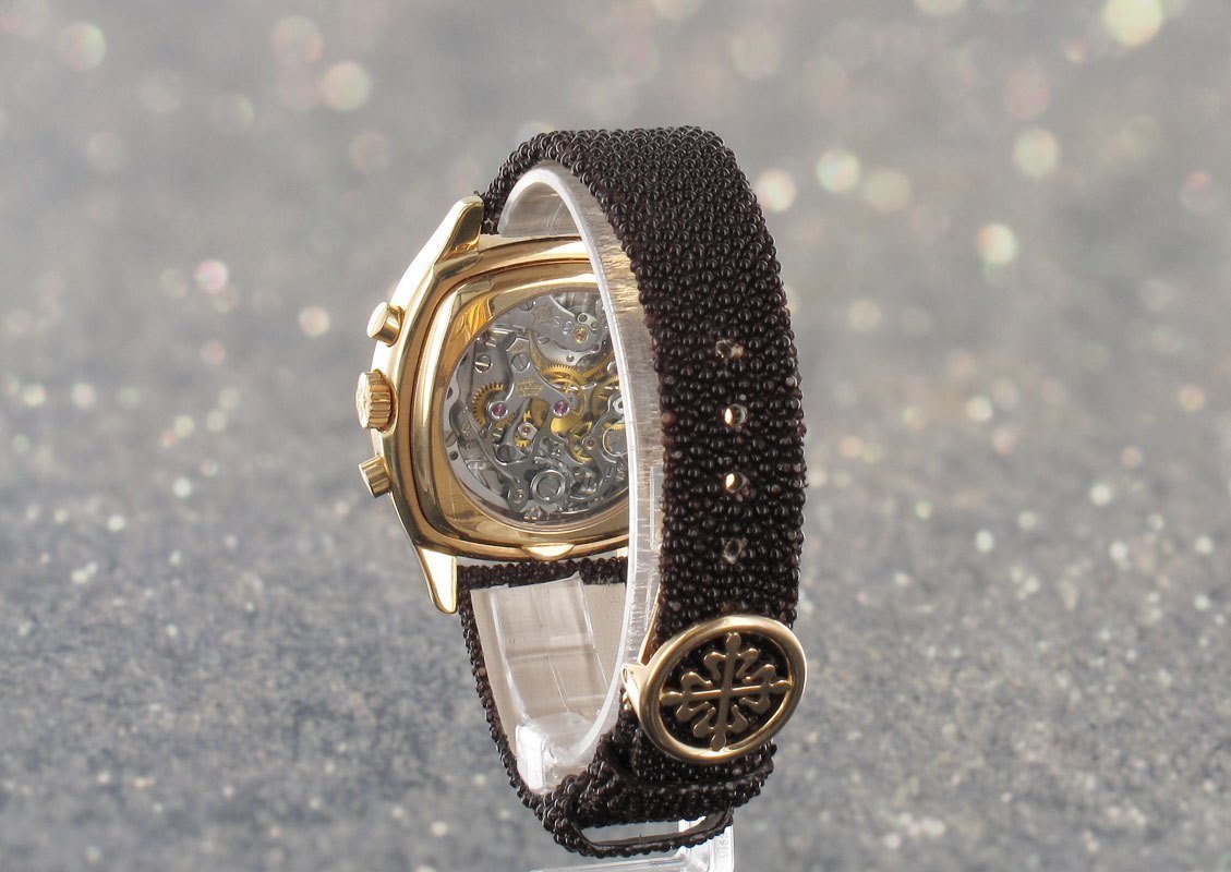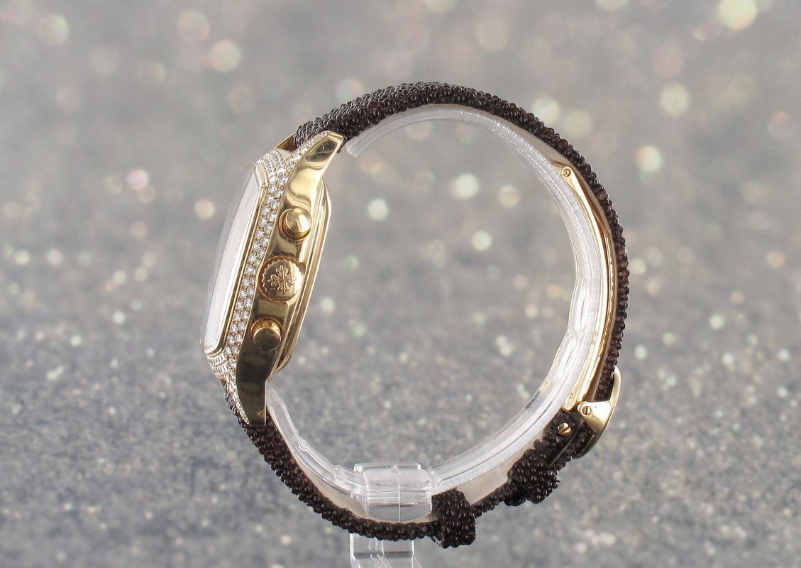 Most probably a piece unique, being the diamond embellished version of the 5020, incorporating a rare salmon coloured dial in addition.