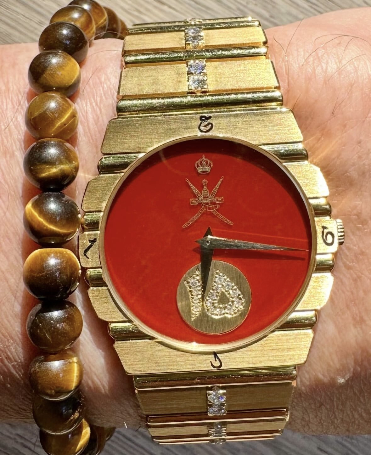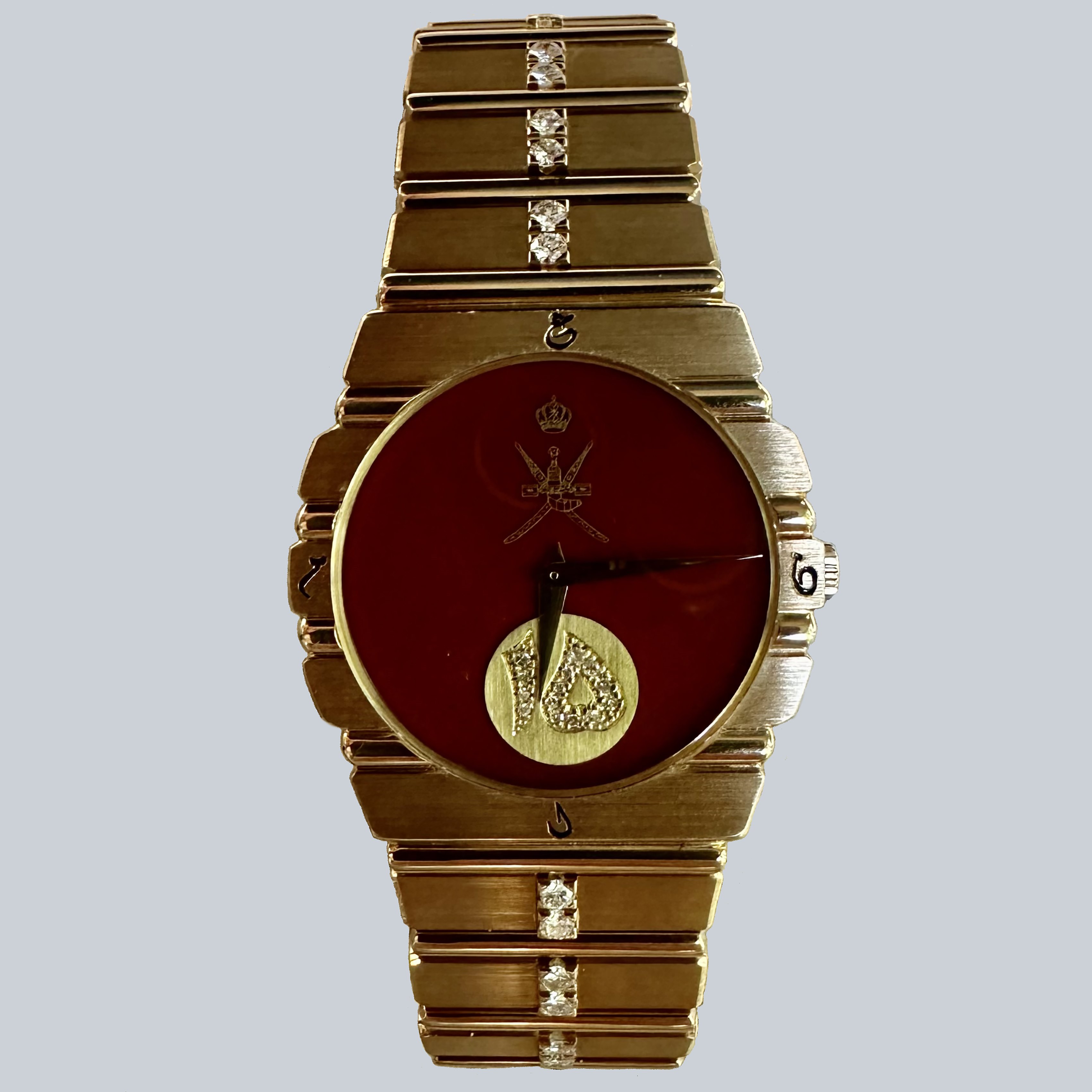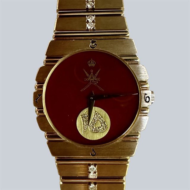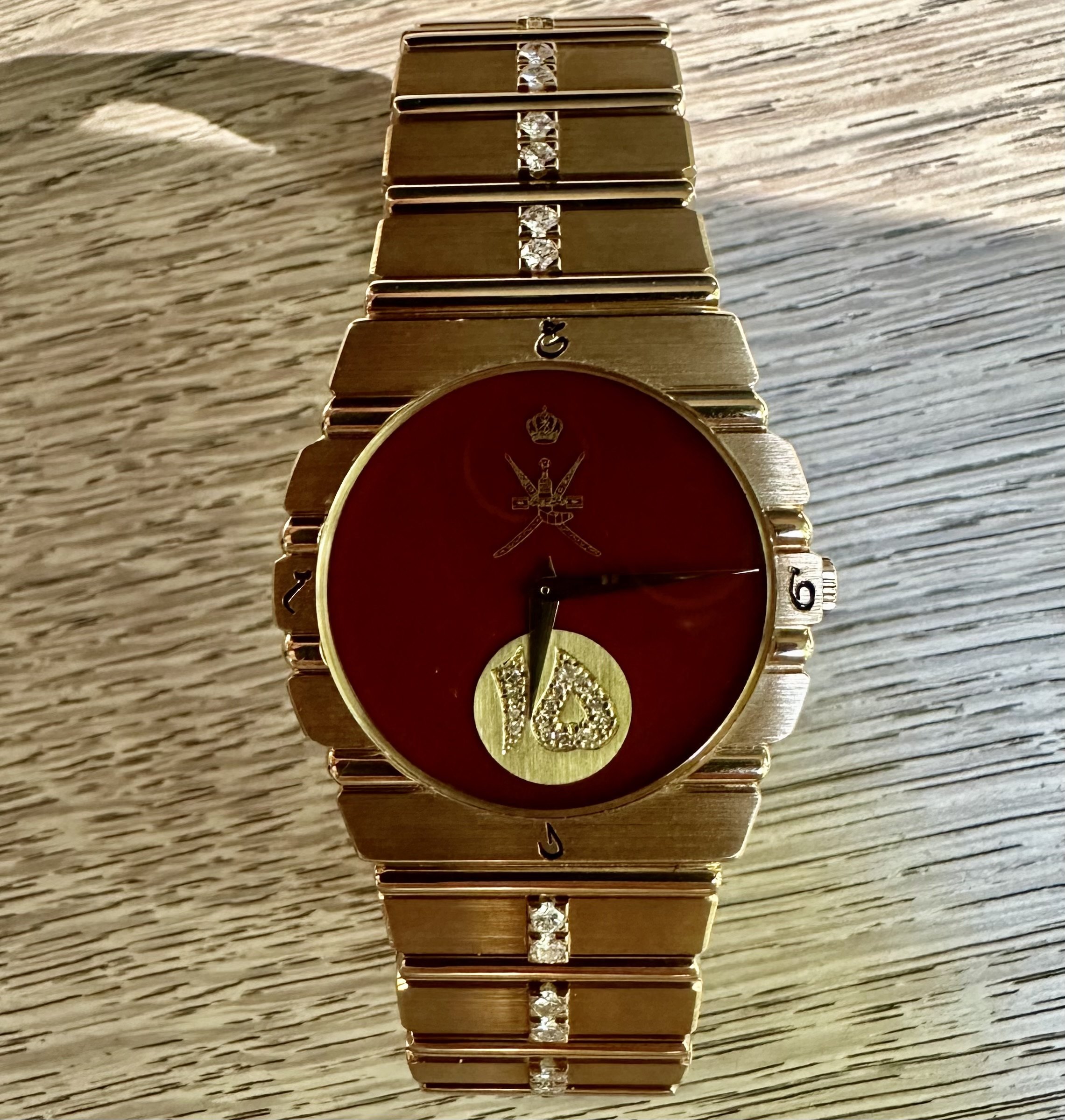 Created by Piaget on behalf of Aspreys for the Sultan Of Oman to celebrate the 15th year of his reign. When one studies pieces like this in the metal, you can see why Piaget were more expensive than even the equivalent Patek's of the era. The execution of the Royal coloured enamel dial, the plaque at 12, the uneven number of 15 diamonds on the bracelet shows the detail, thought & more importantly execution of said timepiece which just happens to be in unpolished like new condition save for 1 or two small marks here and there. Love the fact that its the mechanical variant and not the much more common quartz version too. The box, made of the finest leather, suede & silk is manufactured by Aspreys themselves, being a masterpiece worthy of display in its own right. At just over half the price of the recent limited re-edition of the model, this factory bespoke Royal example is not only an absolute bargain but a great investment for the future.