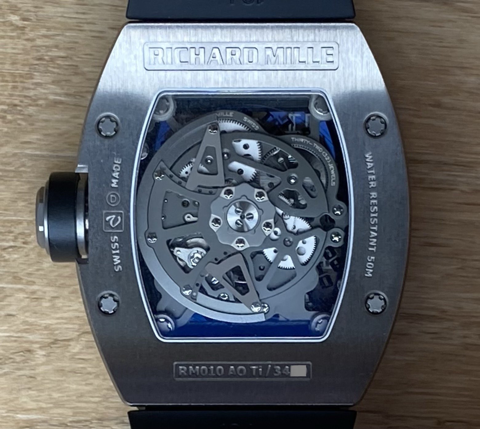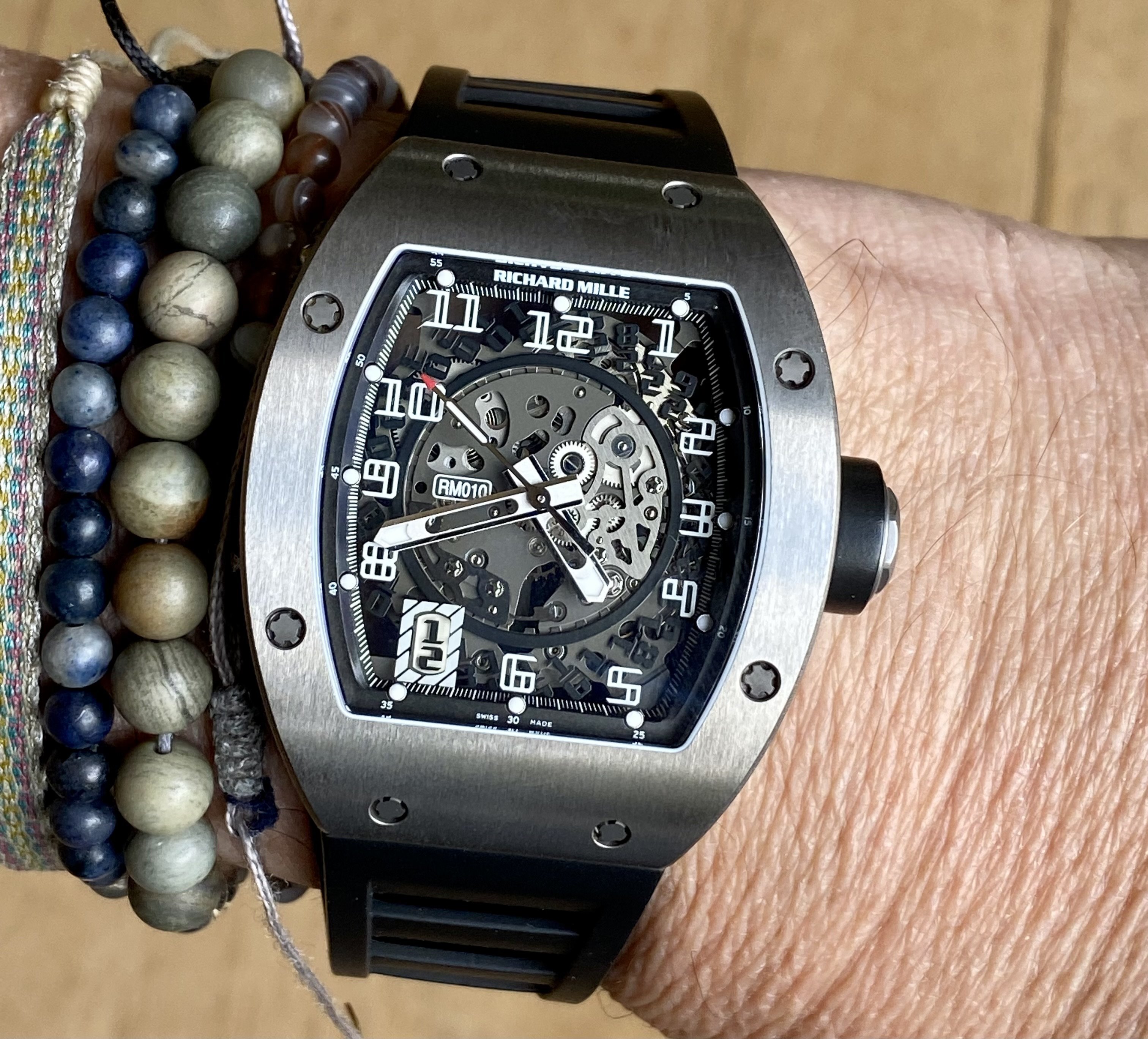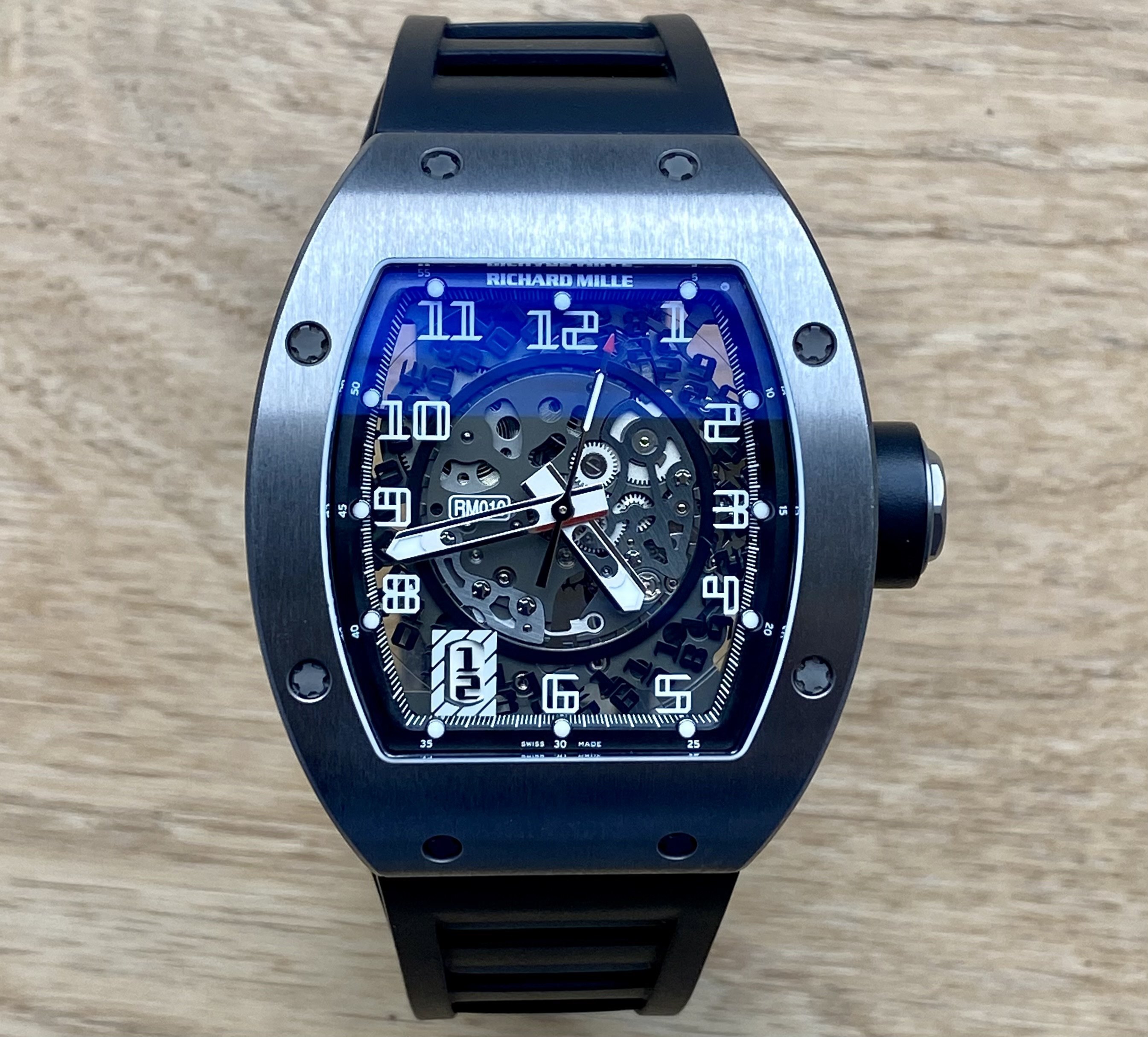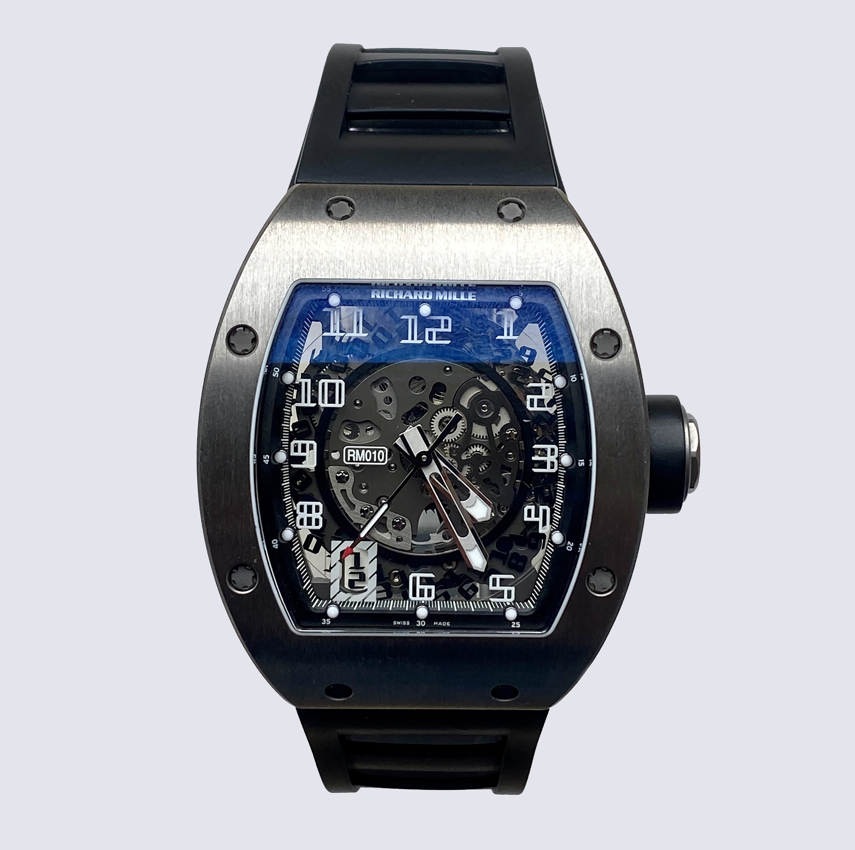 A much sought after Titanium RM010 on black rubber strap not only complete with box and service papers but unworn since its service.