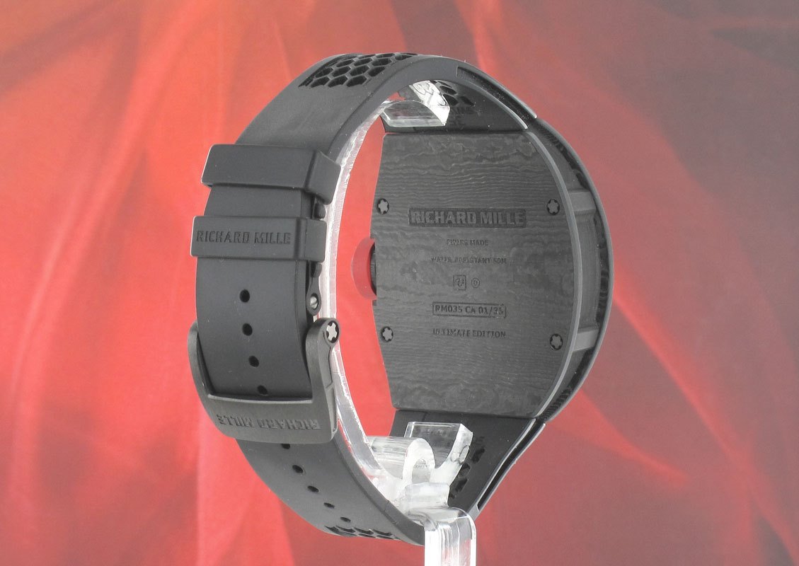 Considered the ultimate Richard Mille by not only RM aficionados but by Richard himself so naming it so, there is little doubt that up until the last few years RM have struggled to find a compatible case material worthy of their ground breaking movements. Or as Richard would no doubt say, a compatible chassis for his engines. Since the invention of his bullet proof featherweight Quartz TPT cases RM have enjoyed premiums on their watches only seen by the likes of Rolex. No mean feat when you consider their gargantuan price differential. To use another car analogy: Upon Ferrari's release of the 599 GTO many believed it to be too much car for the money when compared to its race version the "XX" at over three times the price. The current static price of the "XX" compared to the huge premiums for the GTO indicate such. Many RM collectors felt aggrieved upon the release of the RM35 due to its utilization of a similar strut configuration of the award winning RM12 albeit at not only a fifth of the price but at a fifth of the weight! Current market prices would indicate a vindication of the aggrieved as prices have more than doubled and are still climbing as I type. The only drawback of the RM35, its big brothers the RM27 and RM50 is that they all run Nano carbon cases that seem to mark almost as you look at them! So as a last hurrah to the most expensive manually wound watch in history Richard decided to create only thirty five pieces in honor of the model that truly put his brand on the map. Whilst incorporating the original strut movement of the RM35 and utilizing the same old school case design, the Ultimate Edition is hewn from ground breaking Quartz TPT, creating the perfect incarnation of a manually wound sports watch. Now we really get to show off... Ours is not only 1 of the 35 only offered to the most loyal of RM collectors (much in same way that Ferrari operate) but is actually the 'Ultimate Ultimate' edition being case number 1.