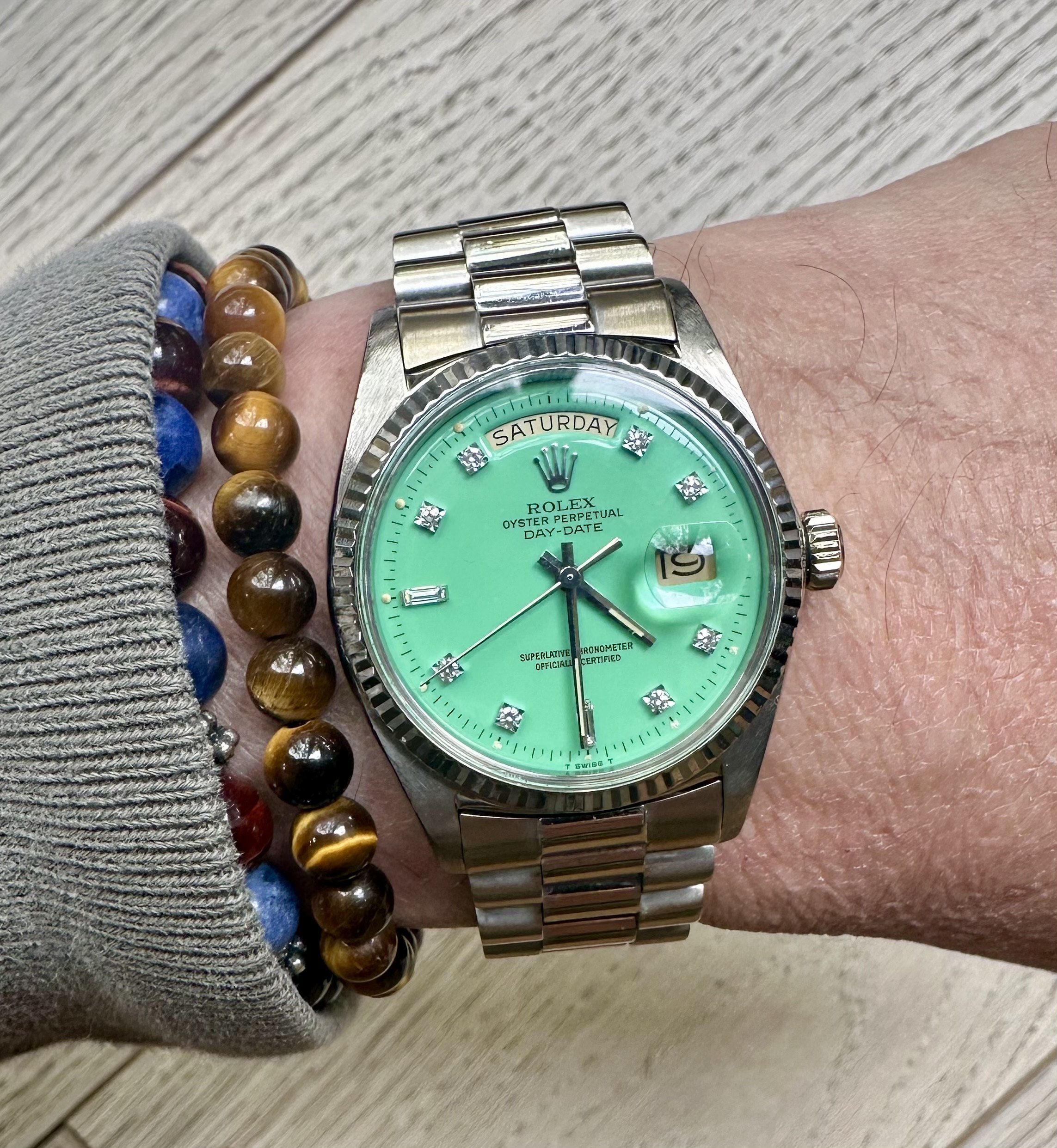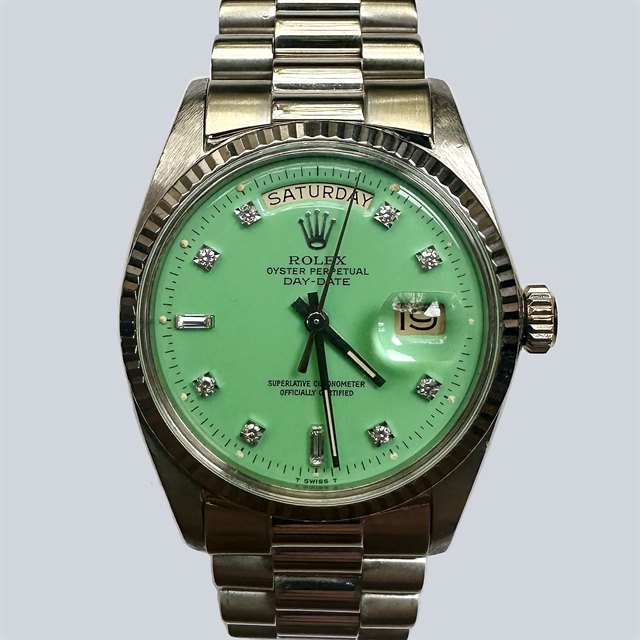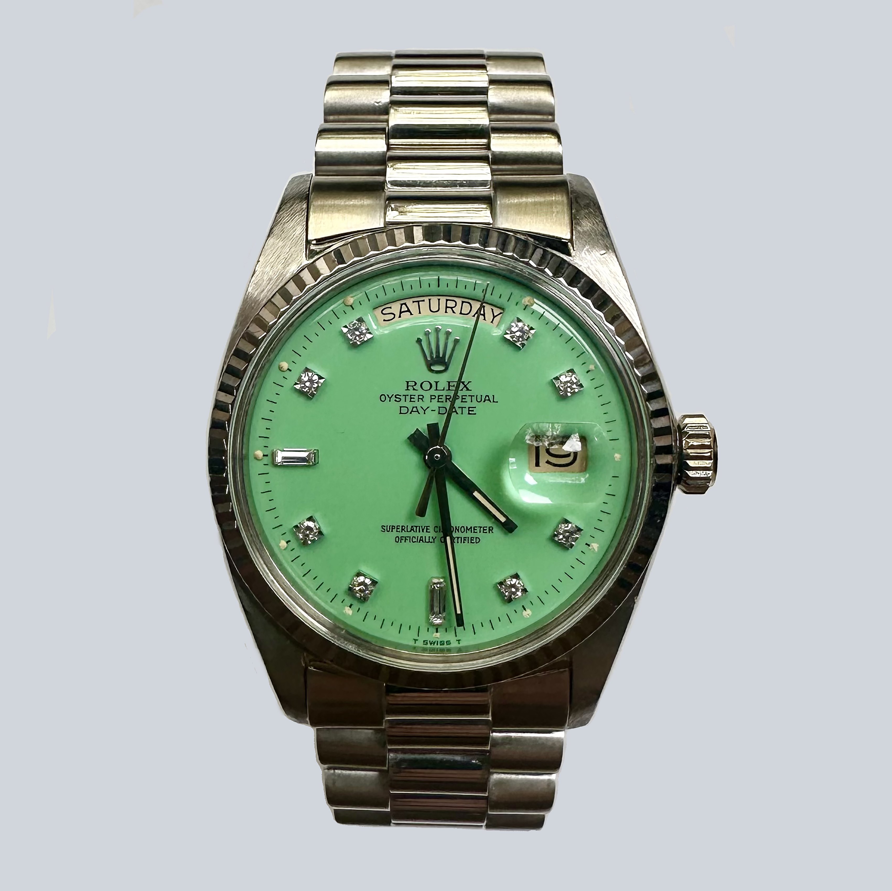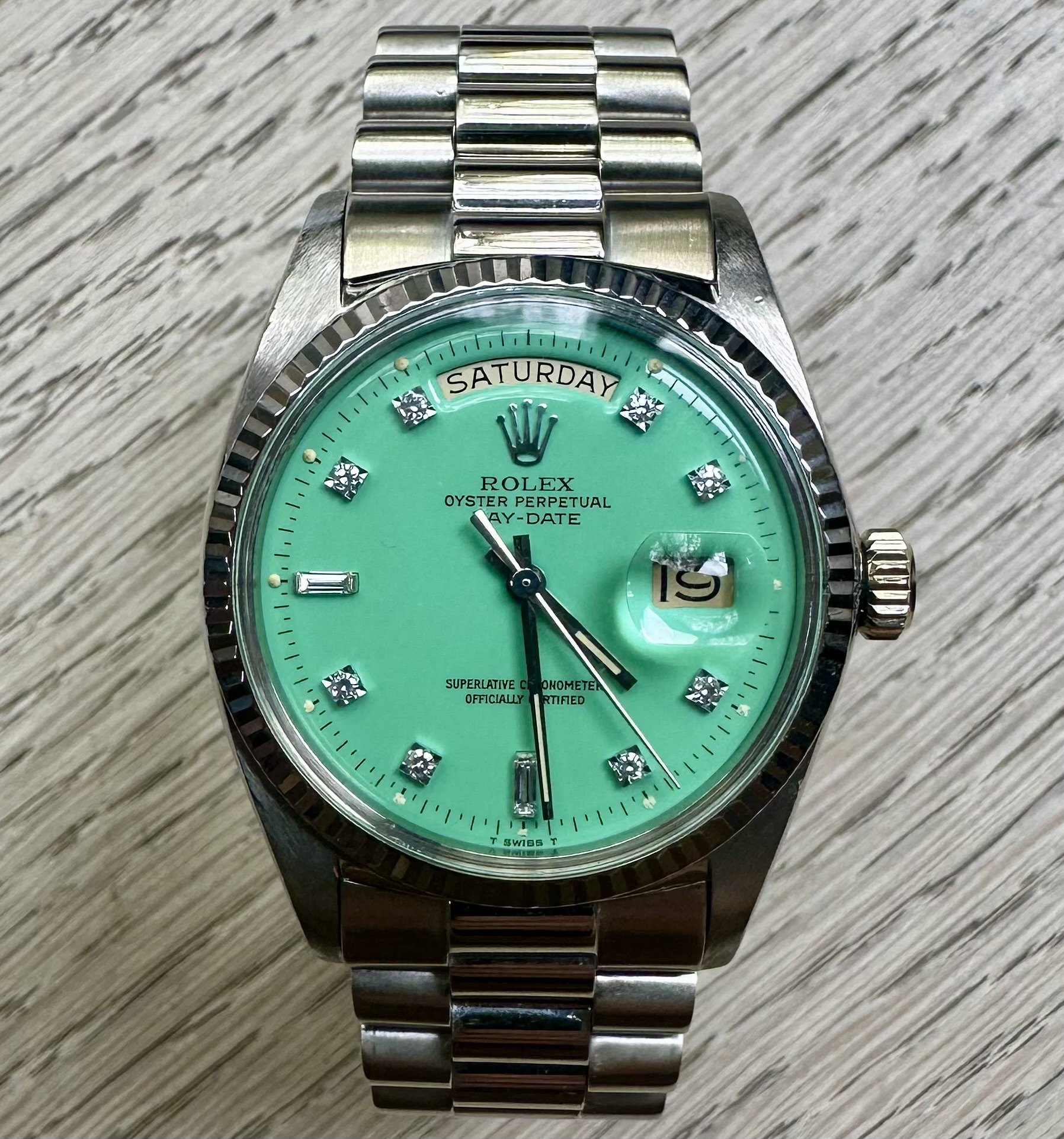 In stunning condition, this ultra rare Stella dial Day-Date known as the 'Seafoam' is one of the rarest Stella dials known to exist.