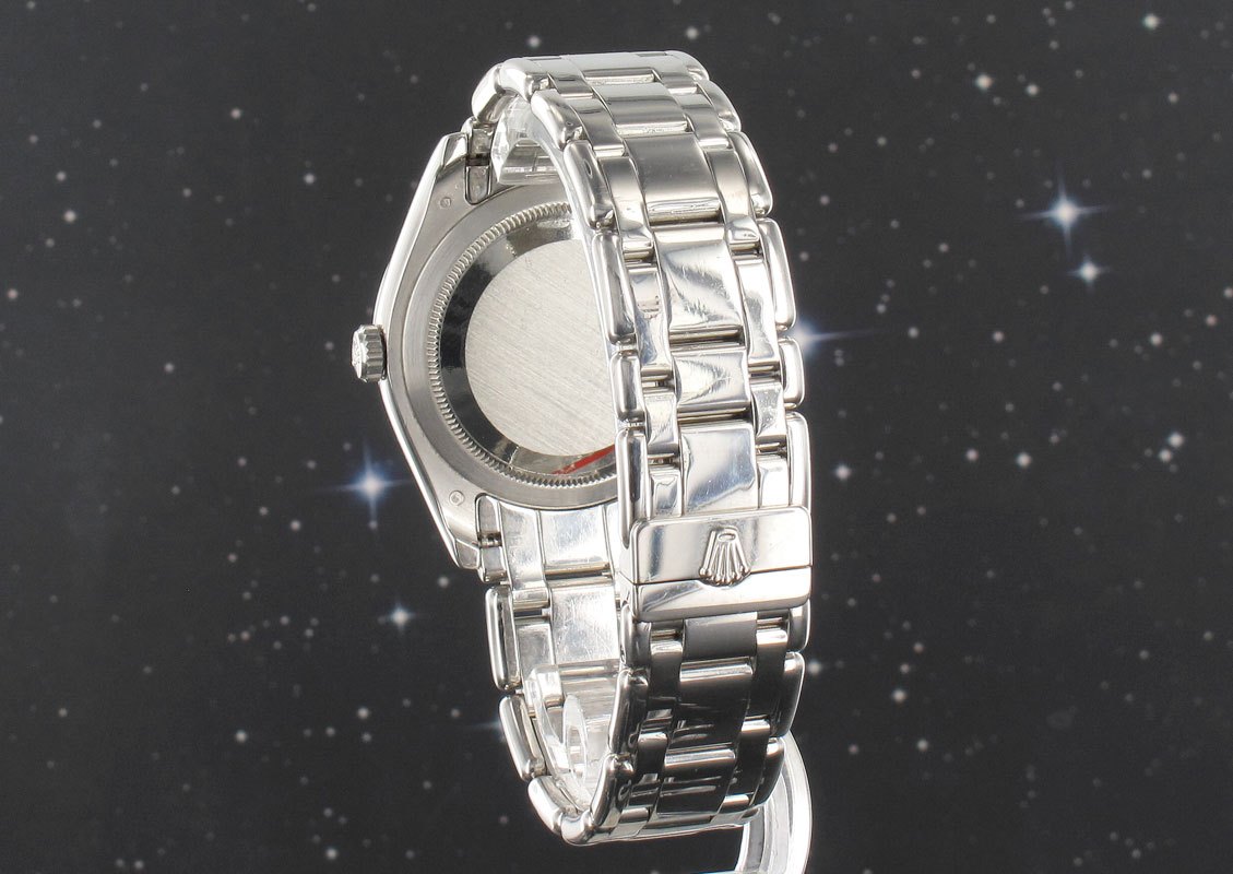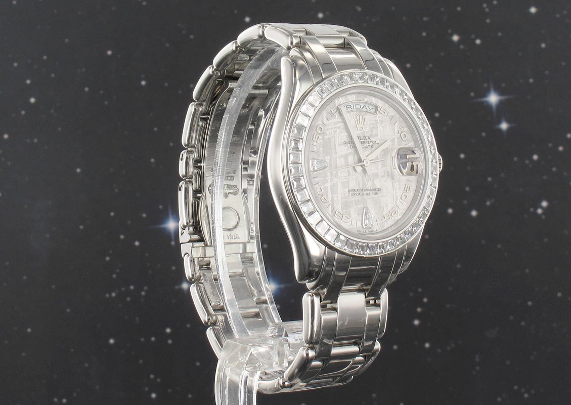 Discontinued limited edition Masterpiece Day Date with possibly the most unusual bracelet design ever manufactured by Rolex. Supplied with Rolex written confirmation stating it to have been serviced four years ago. Please note that for an all be it substantial cost the optional extra of a factory baguette set diamond bracelet is also available.