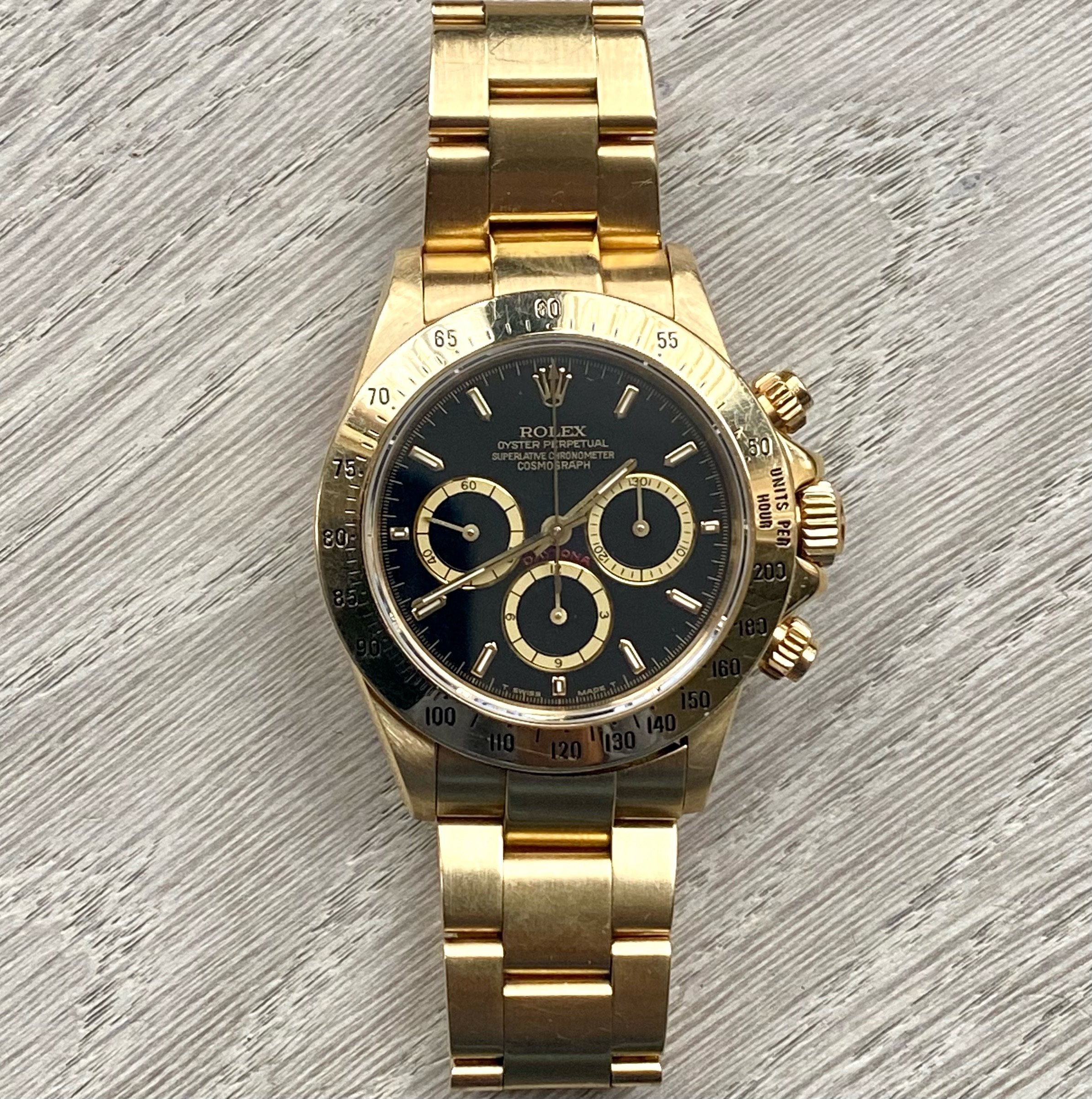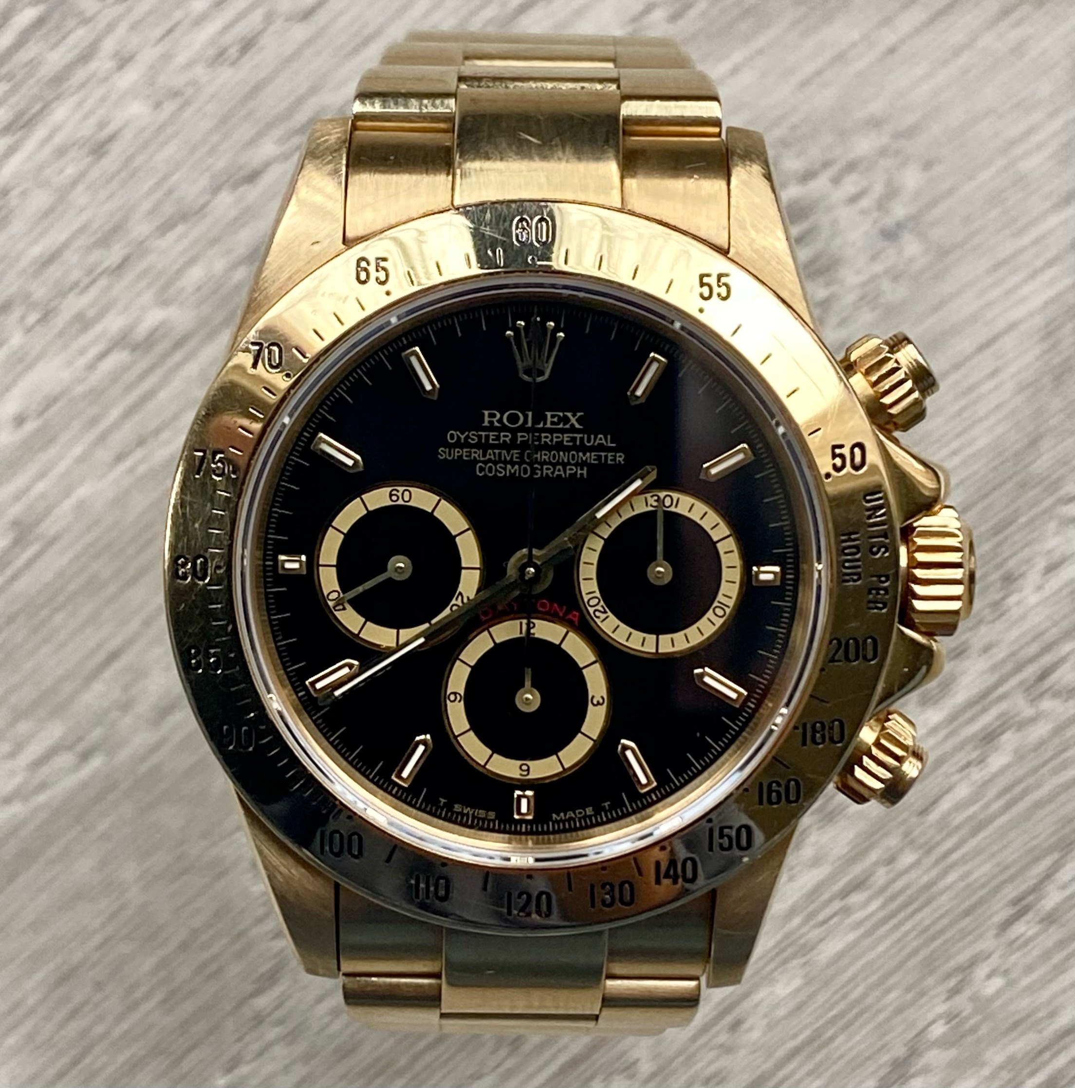 One of the desirable configurations of the 16528 being an R reg from 1988 with the ''4 line'' Daytona black dial and 200 meter bezel.