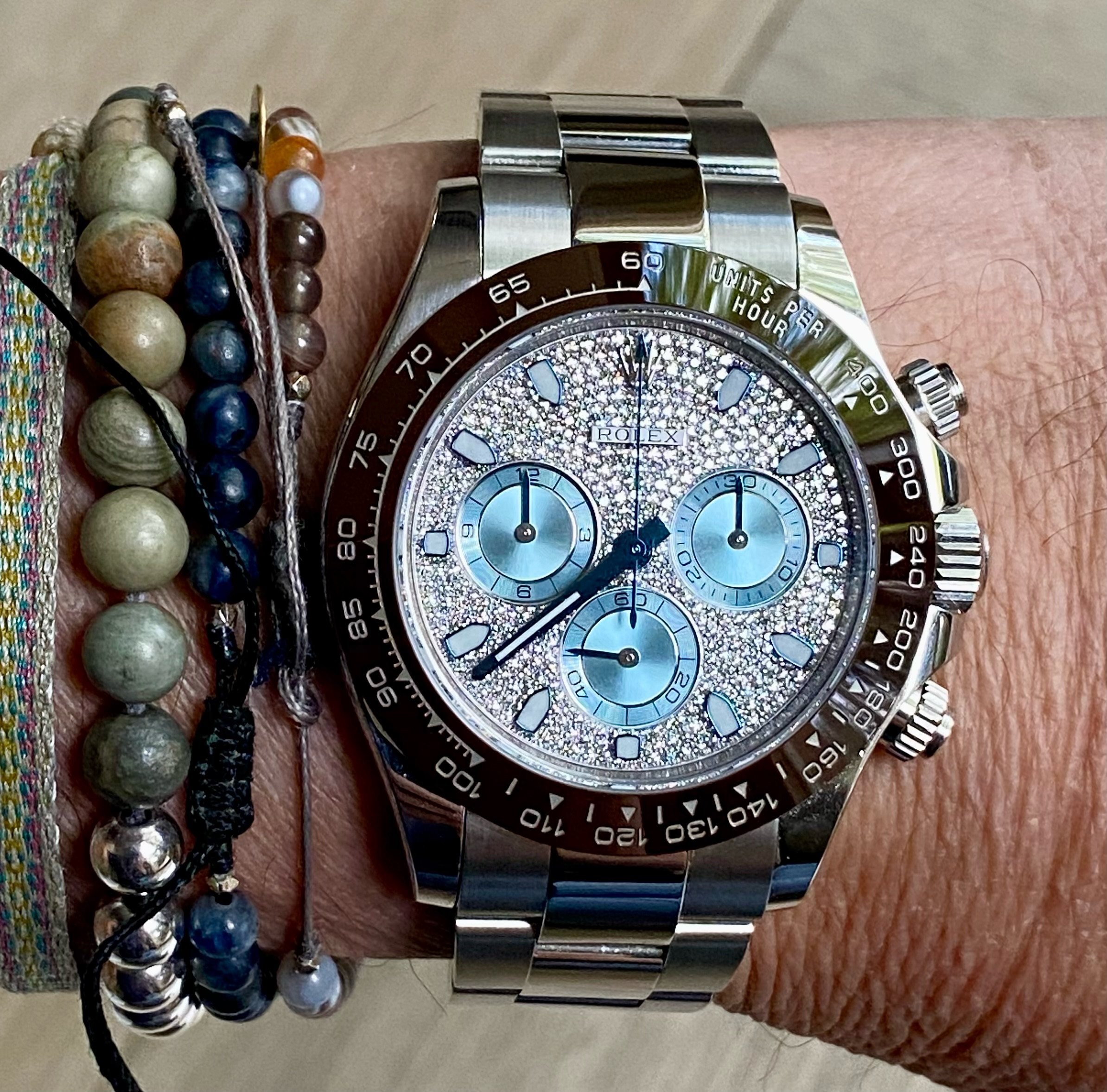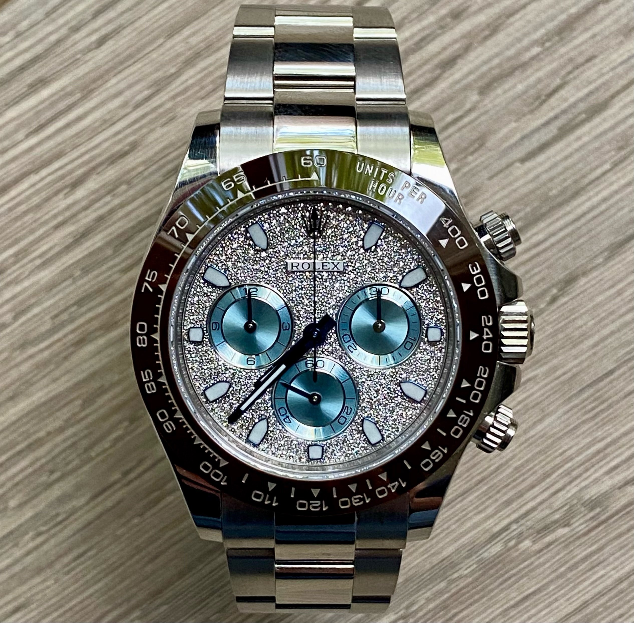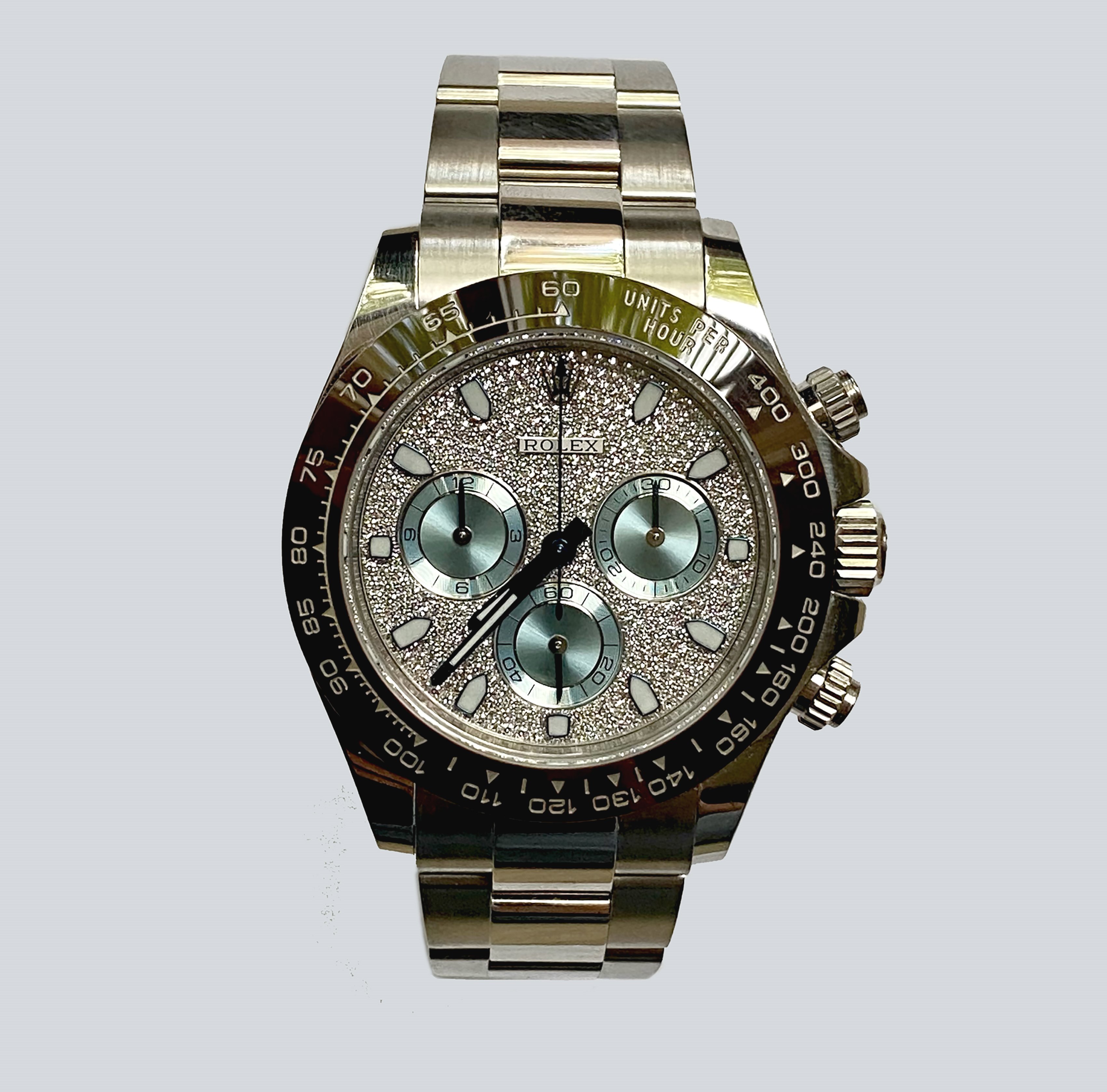 A truly perverted Daytona in that while it lacks the baguette diamond bezel of the 116567TBR it utilises the same dial & hands. Only a few came in this configuration rendering it not only rarer than its big brother with the baguette diamond bezel but more expensive also. A great investment, though it remains unpolished it is just back from an extensive Rolex service and comes complete with a Watch Guru authenticity certificate plus it's 2024 Rolex service paperwork.
