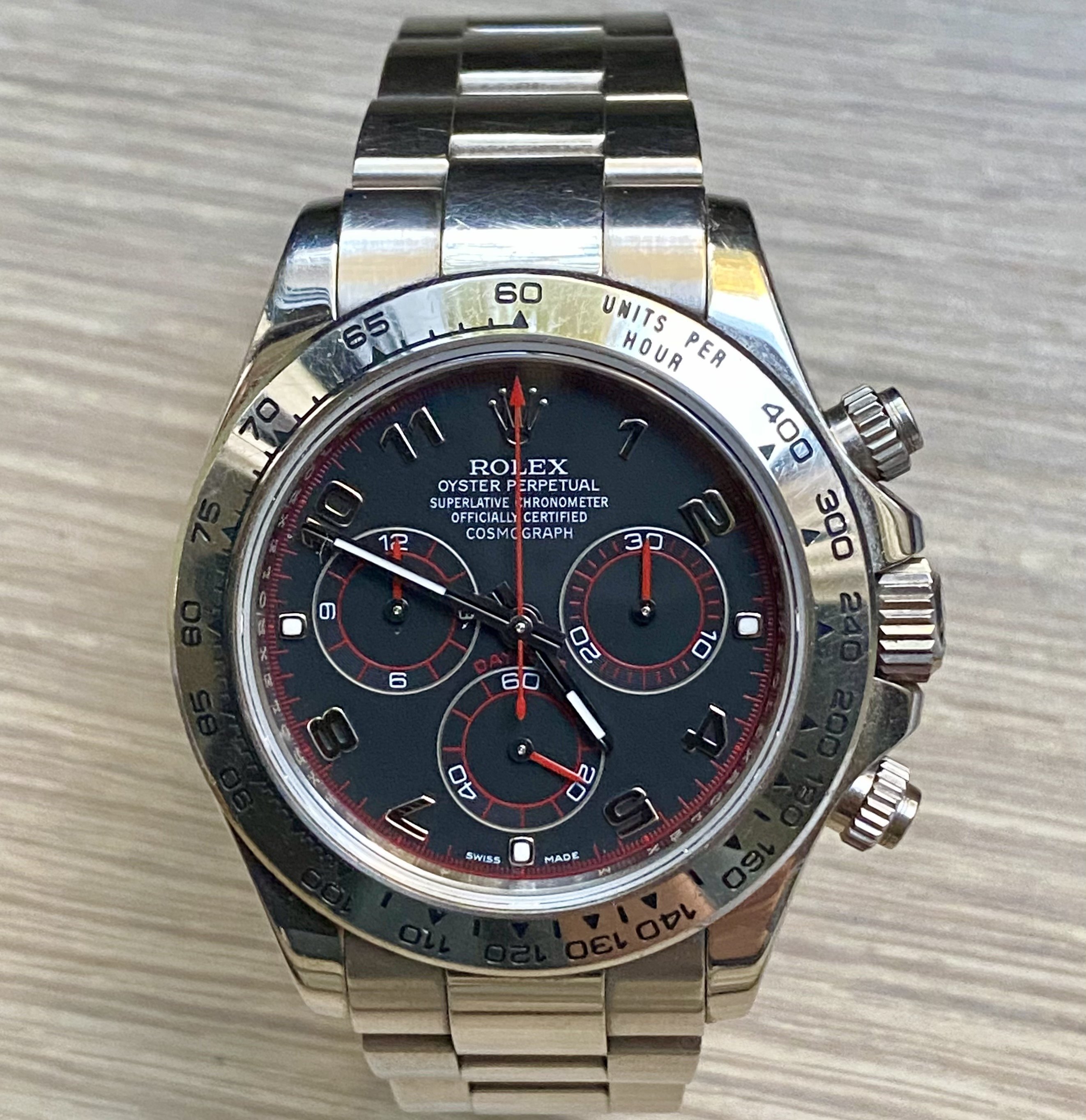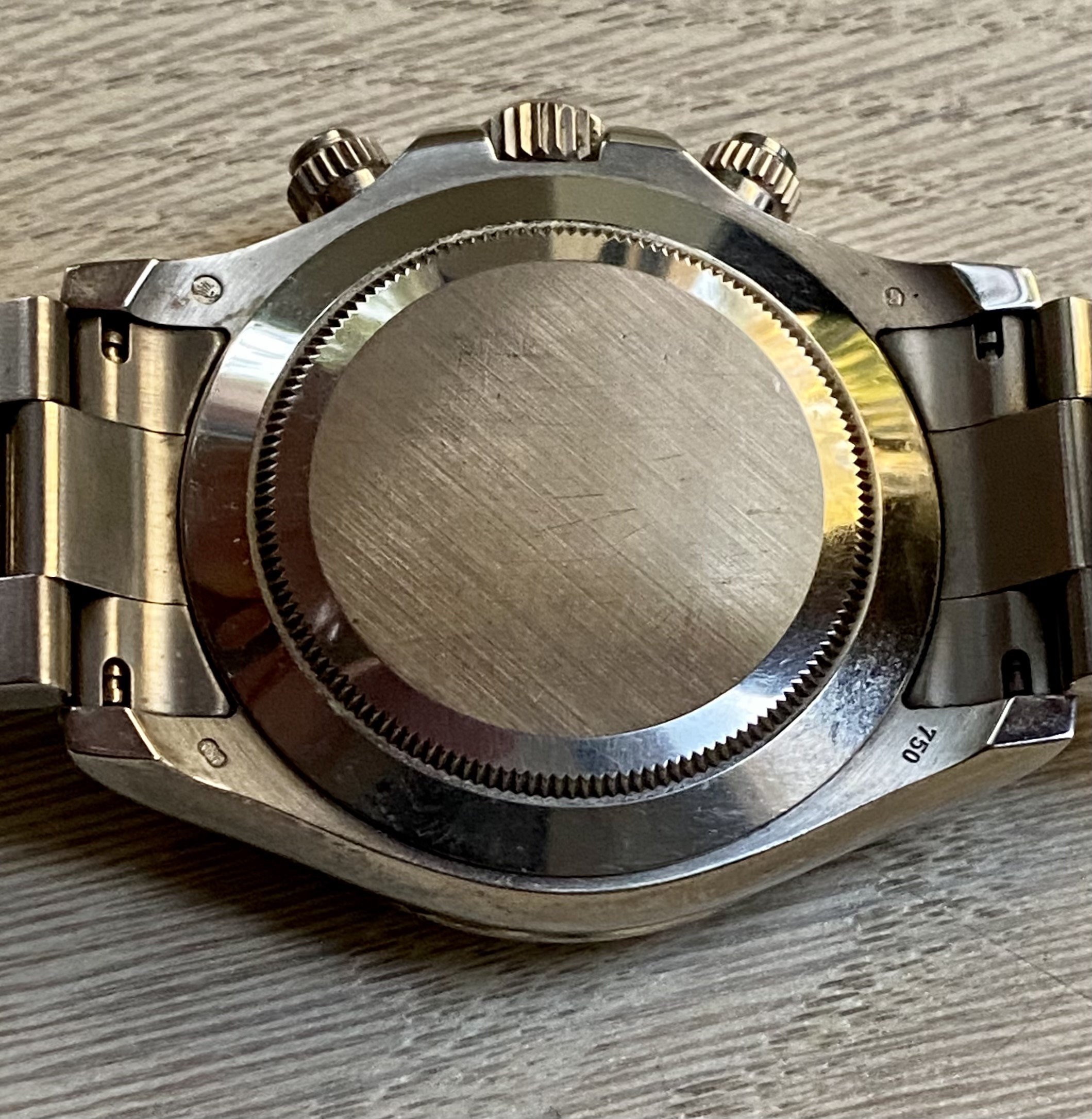 Having never been polished before, the watch has fine scratches, predominantly on the bracelet. For no extra cost the watch can be polished to look like new but more more more people are valuing never unpolished watches above refreshened examples now hence we're offering the choice.