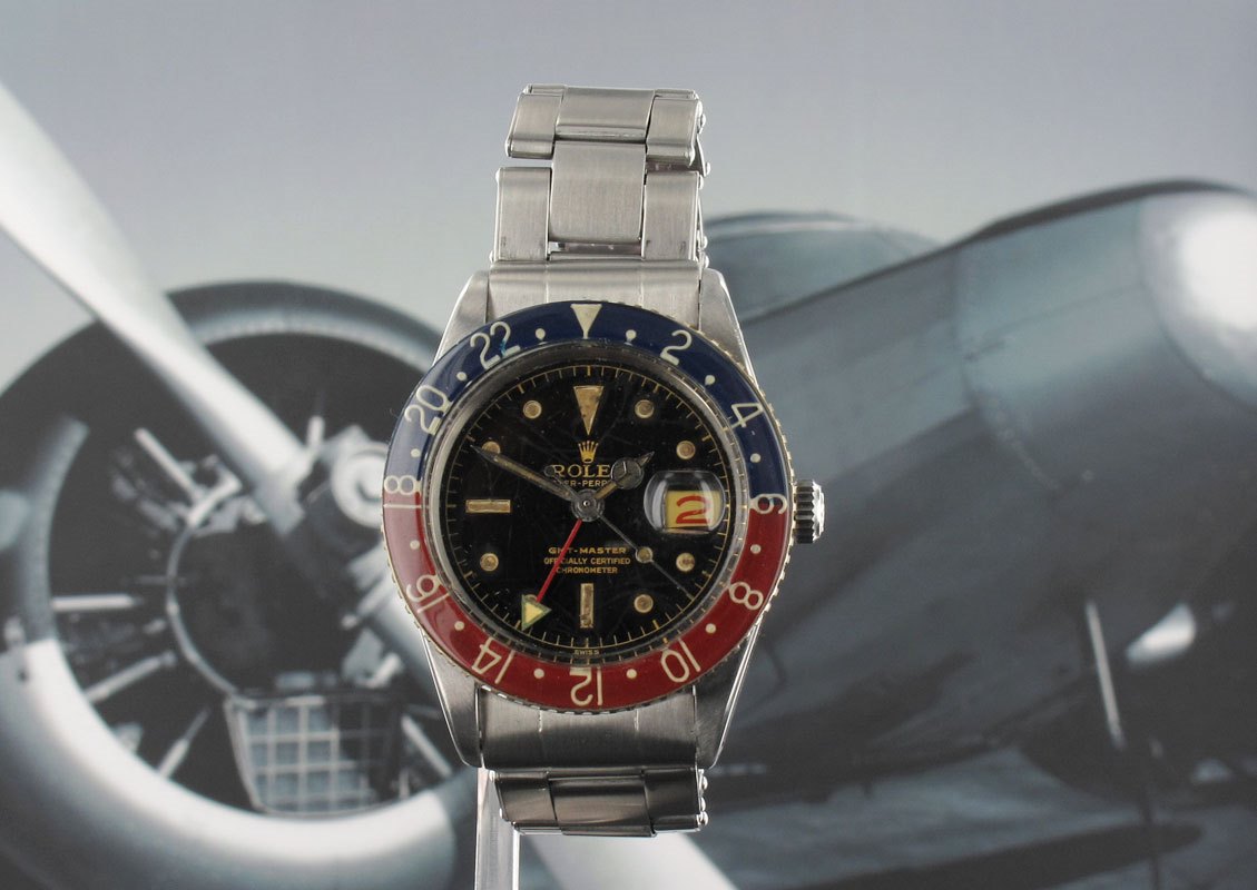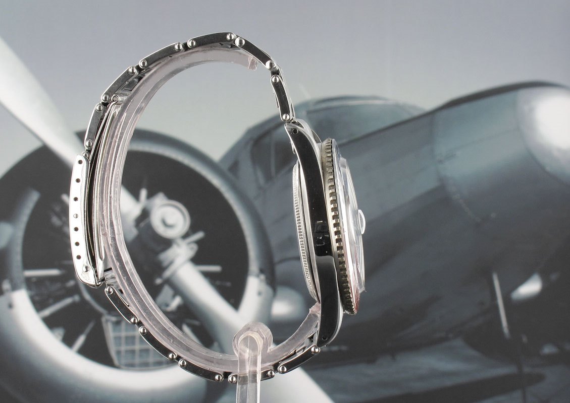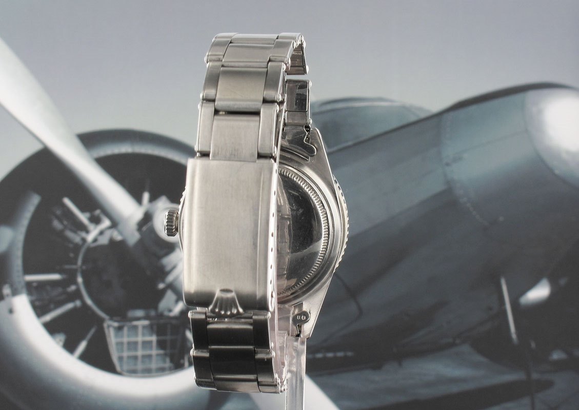 A rare oppertunity to own a reasonably priced 'spider dial' 6542 GMT. Collectors are now attributing premiums to these dials where the original lacquer has crazed due to age as they enforce the originality of the dial. Alas, while this example has the original 50s dial, roulette calendar and riveted bracelet, it has, ( like so many other examples ) lost its original bezel at some point in its life hence a replacement bezel has been fitted as has a 24 hour hand. But with the original bezels going for around £3000 (when located ) and the smaller GMT hands going for £500 (when found ) there is bags of potential profit to be made from this example as shown but we can't stock everything! Price is FIRM no offers!