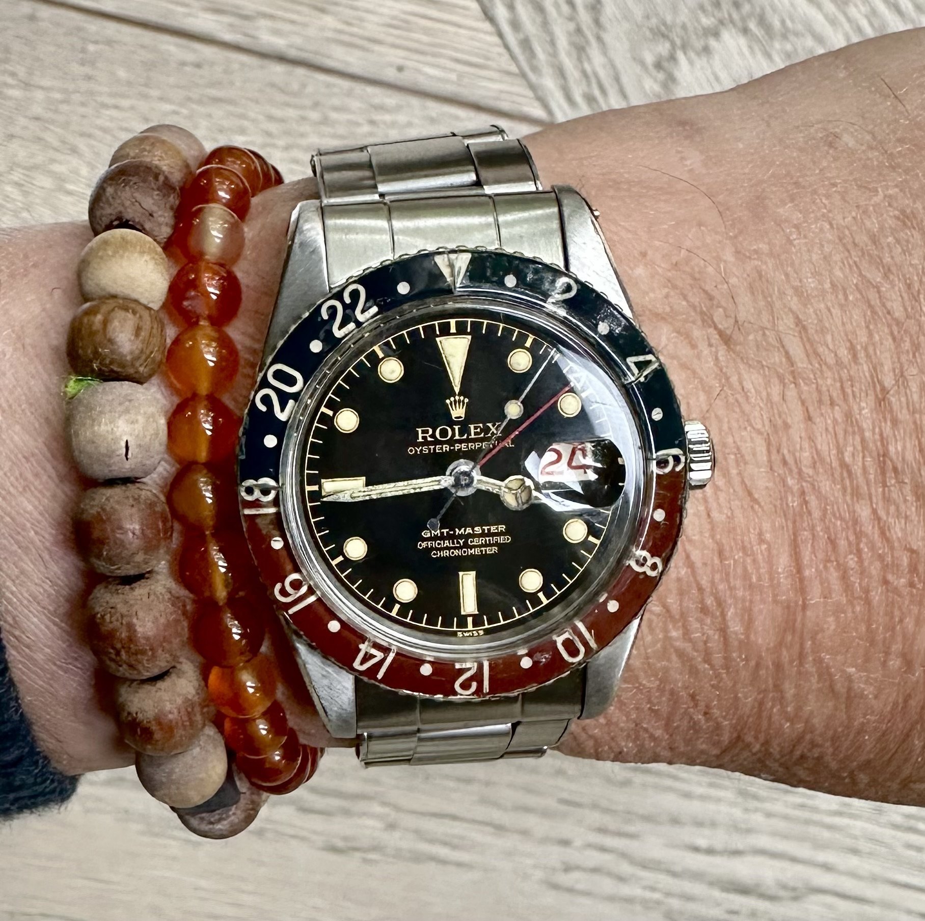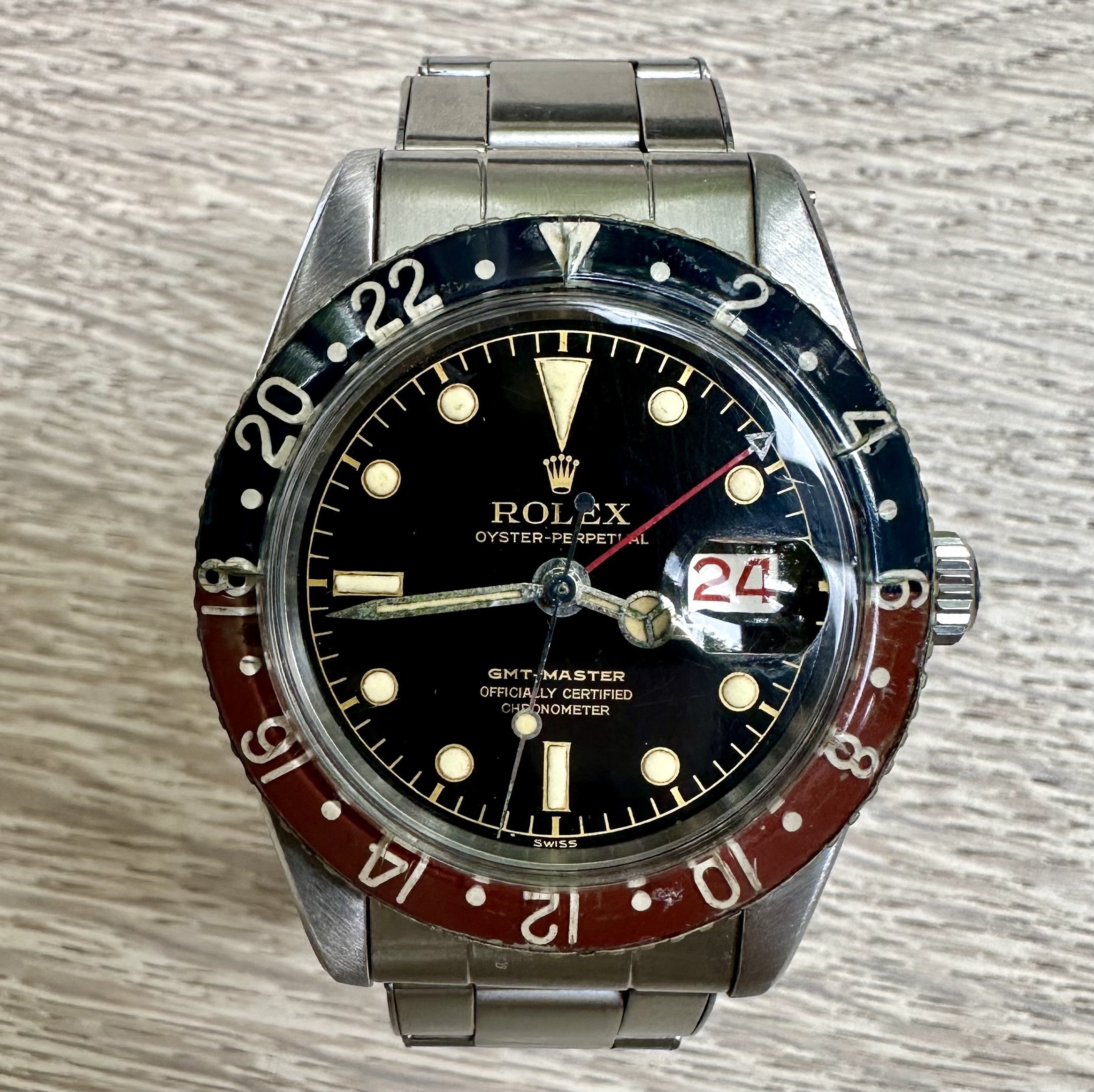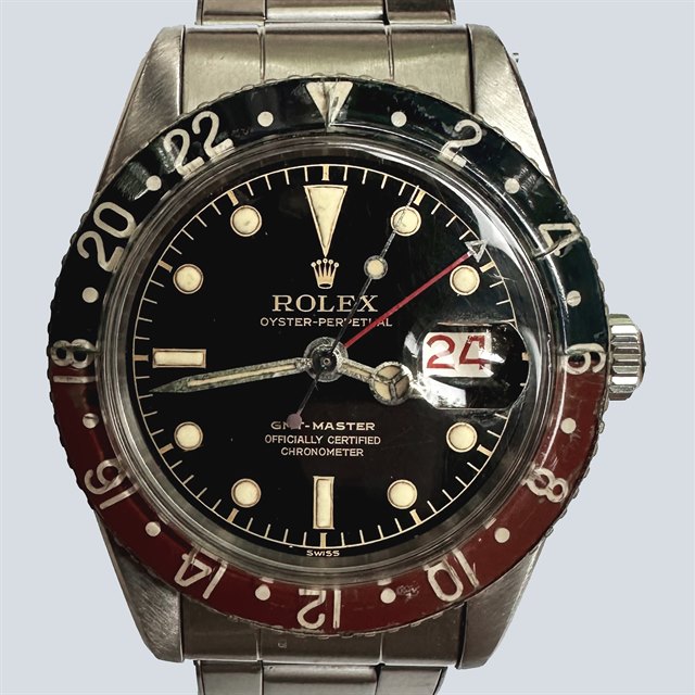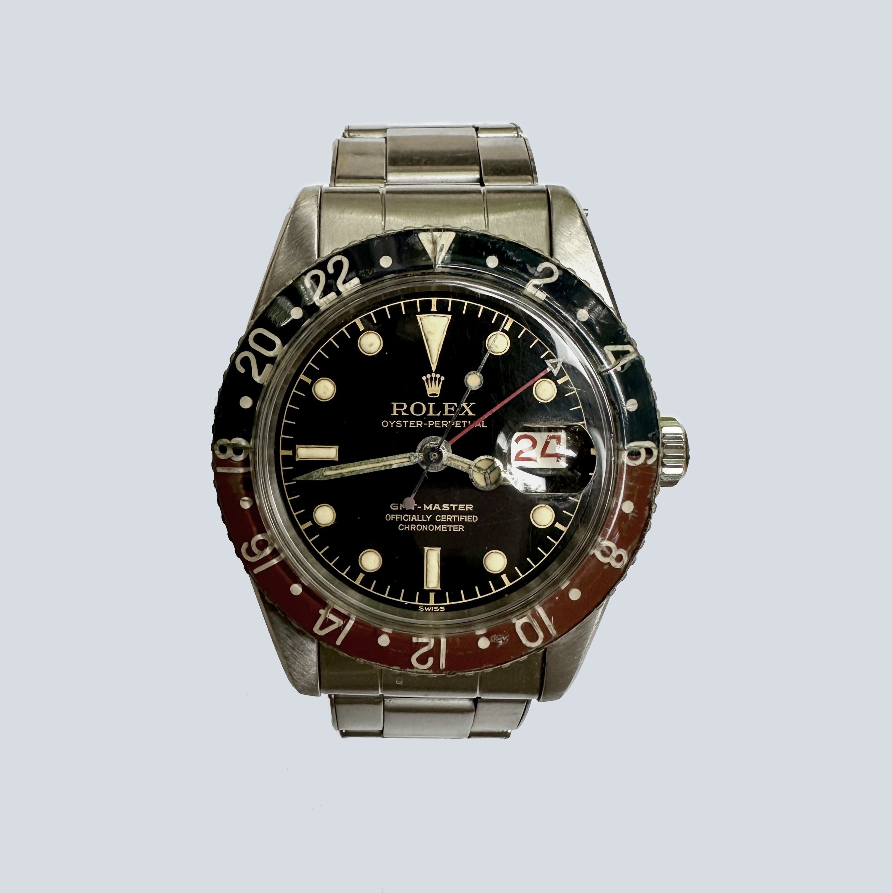The ref 6542 was the 1st GMT Master manufactured by Rolex. It incorporated a Bakelite bezel insert which due to their fragility have all but been replaced. In fact, even the originals were replaced due to a recall by Rolex for excessive radioactivity! Though we believe the insert of this watch has indeed been replaced, as a whole this watch is incredible, the dial is literally unblemished.