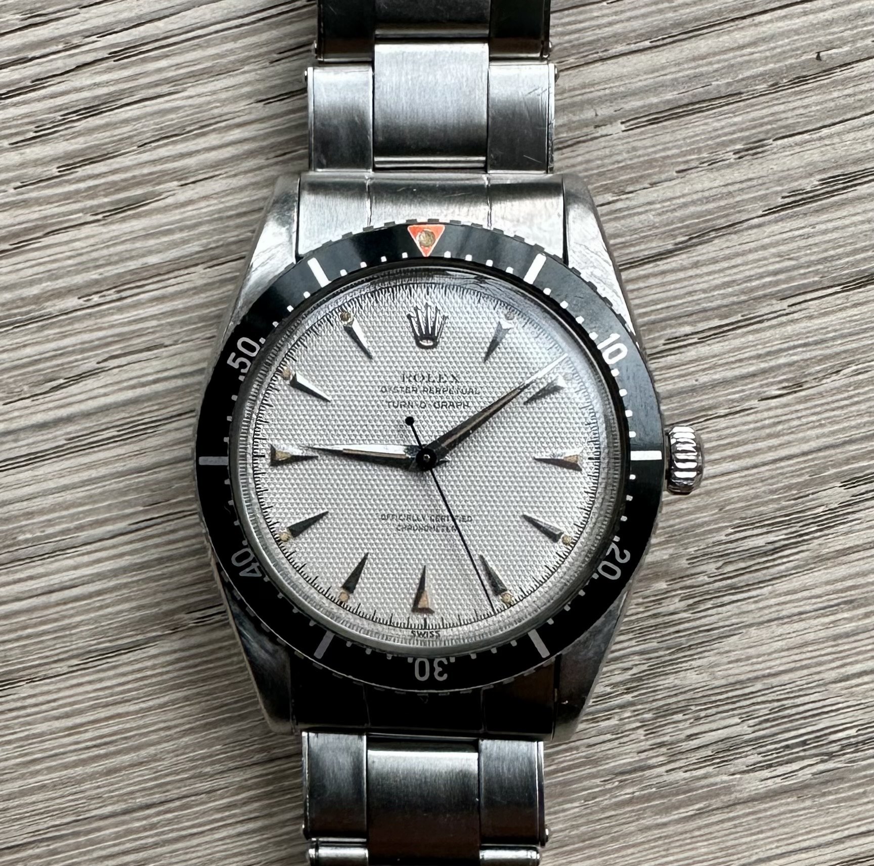 An incredibly rare Turn-O-Graph, which was one of Rolex's first mass-produced tool watches. There are three known variants of the 6202, though many are unaware of the 3rd version which has a white honeycomb dial, usually with yellow gold indexes. This example, however, has steel indexes instead further boosting its rarity and desirability.