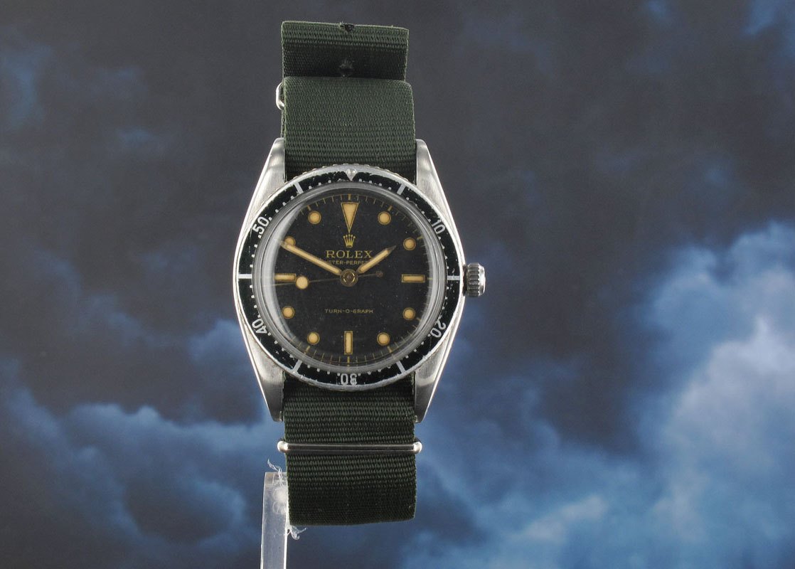 Very early pencil hand version with oversize "lollipop" second hand made in 1953 the same year the Turn-O-Graph was launched at the Basel fair. Predecessor to the Submariner and the very first watch produced by Rolex with a rotary bezel it is only now that this historical model is getting the recognition it deserves.