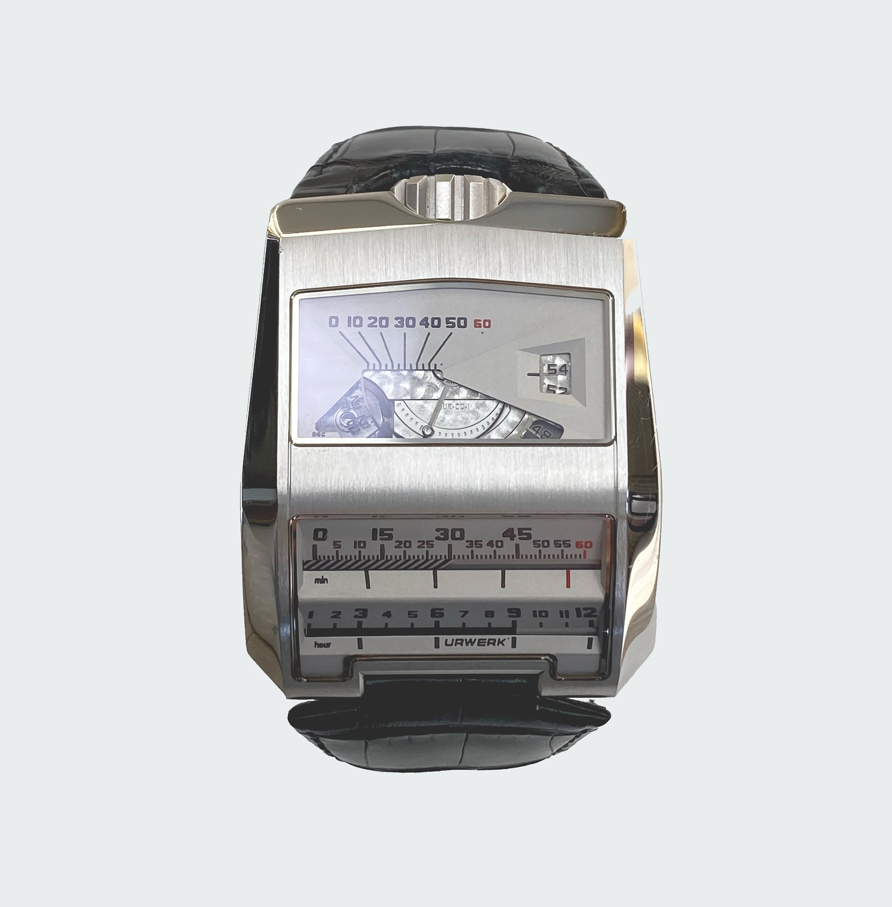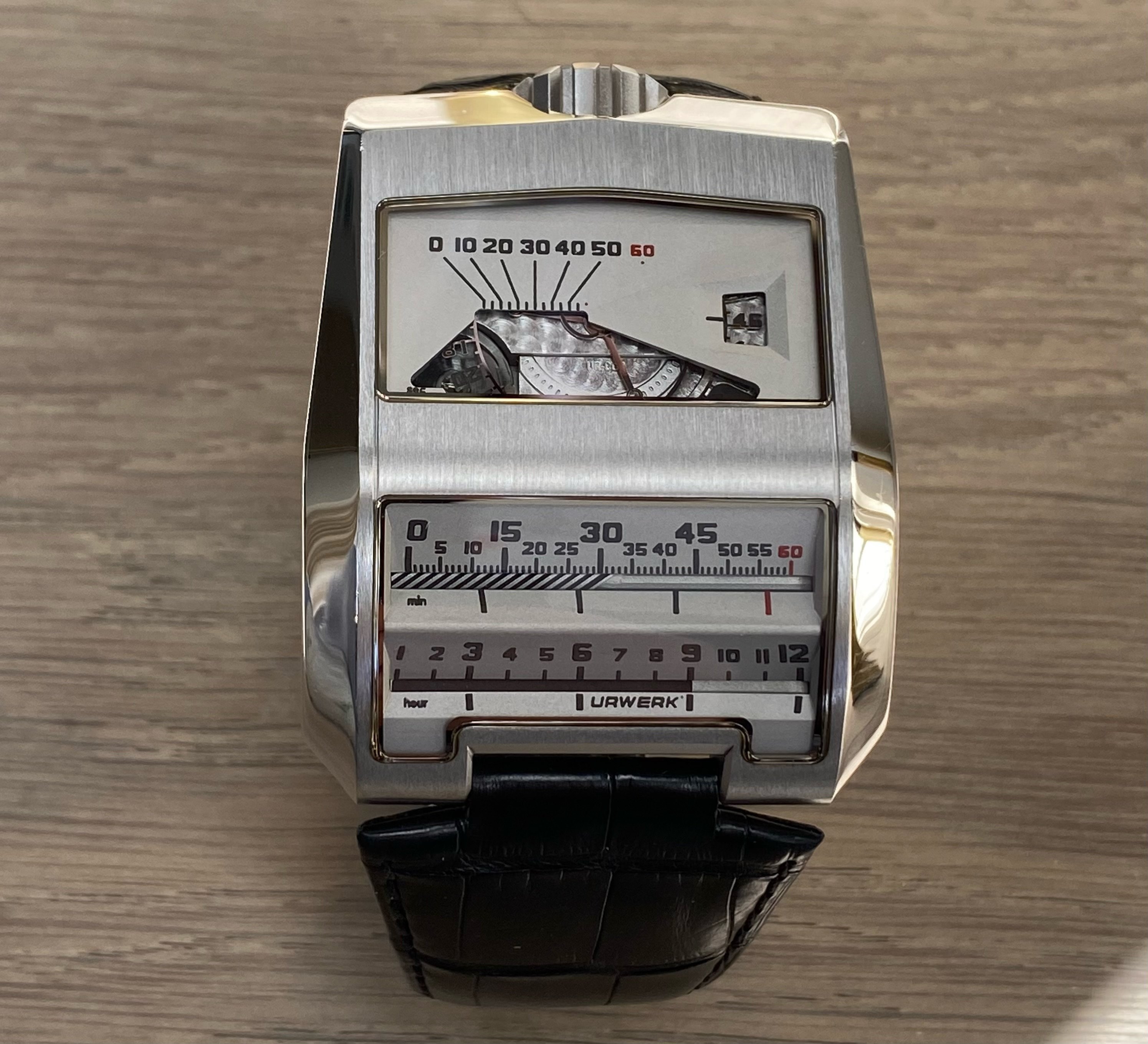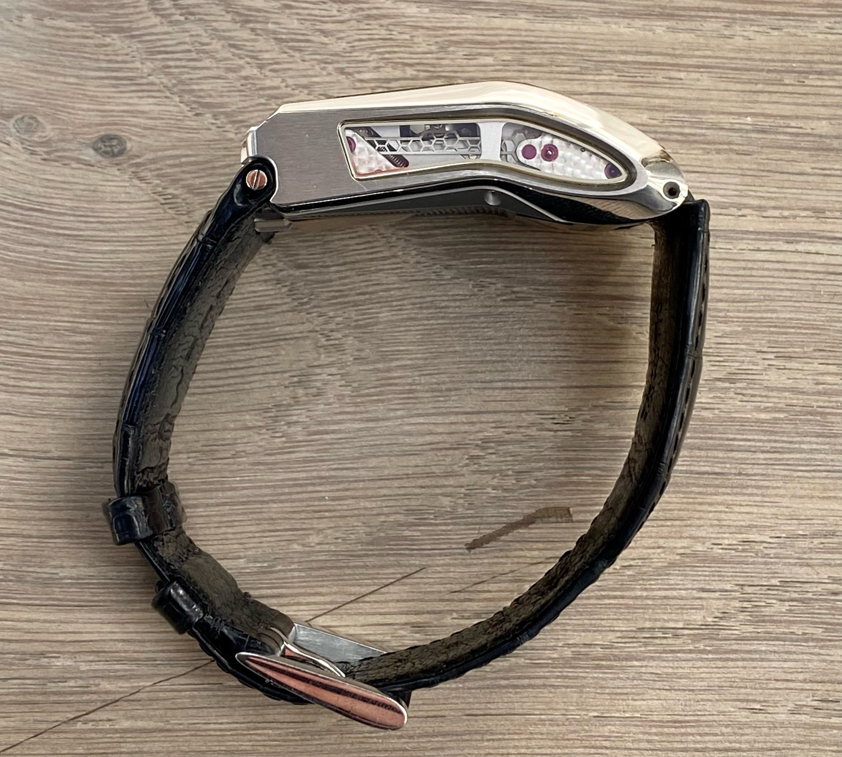 Initially conceptualised by Louis Cottier for Patek Philippe over 5 decades ago, the worlds first linear mechanical wristwatch never actually worked, hence wasn't put into production. Just over a decade ago, Frei & Baumbartner successfully manufactured 50 functioning, linear wristwatches consisting of 25 in white gold & titanium plus 25 in black gold & titanium. They also made 1 'Albino' example shown here with a white dial rather than standard black hence the 'Piece Unique' case back designation. Inspirered by 1970s automobile instrumentation, the timepiece is as technical, historical & funky as they come. The piece unique brother to this example in black coated gold was recently sold for £275k at auction. I consider that to be an inferior example to this, due to the fact that one should never black coat gold due to its softness.