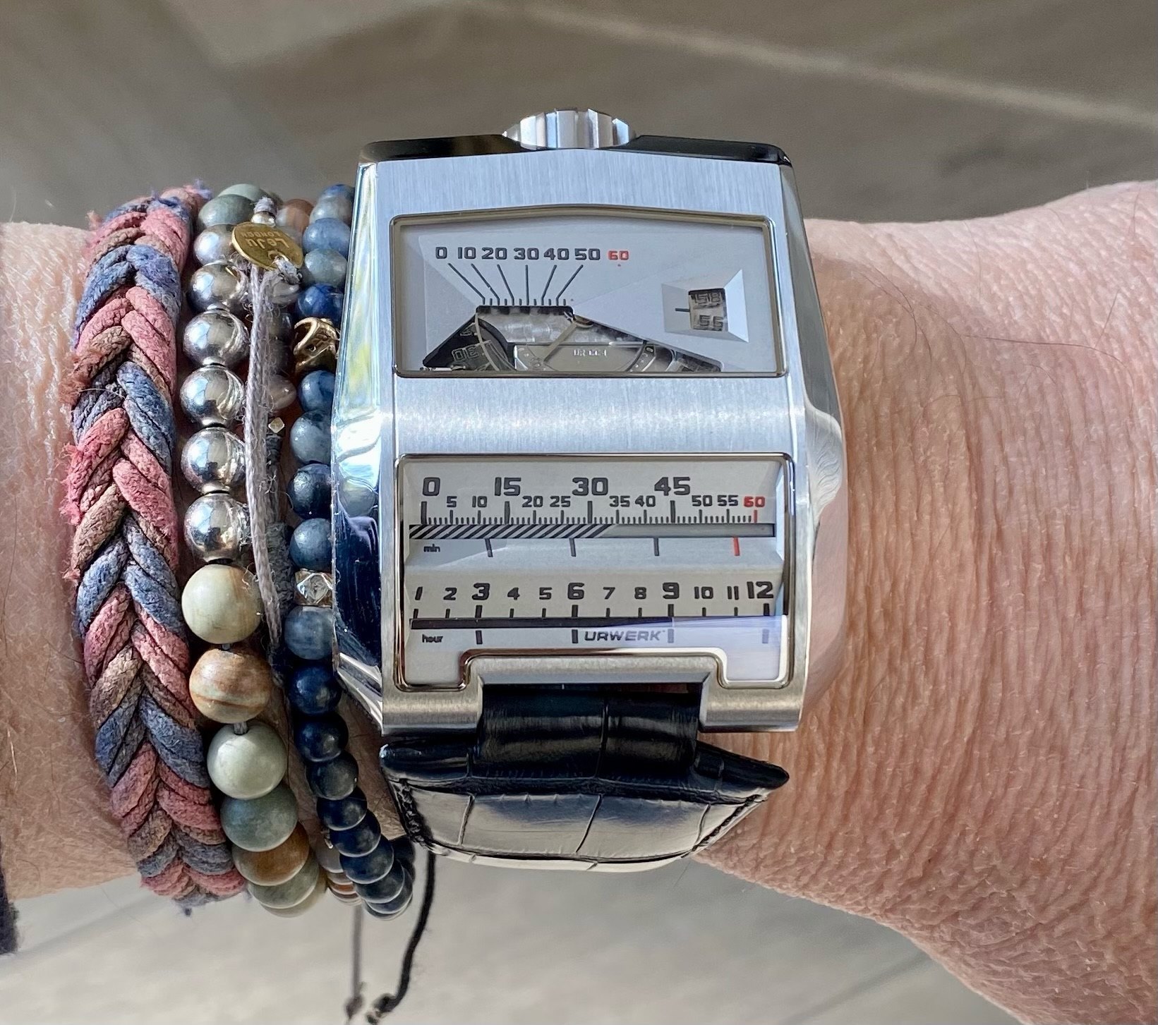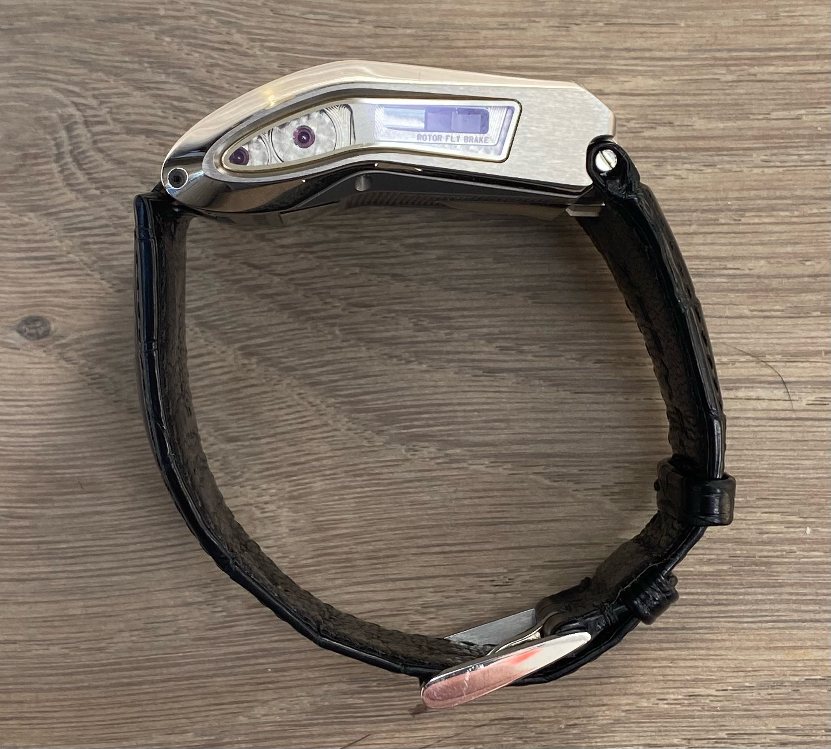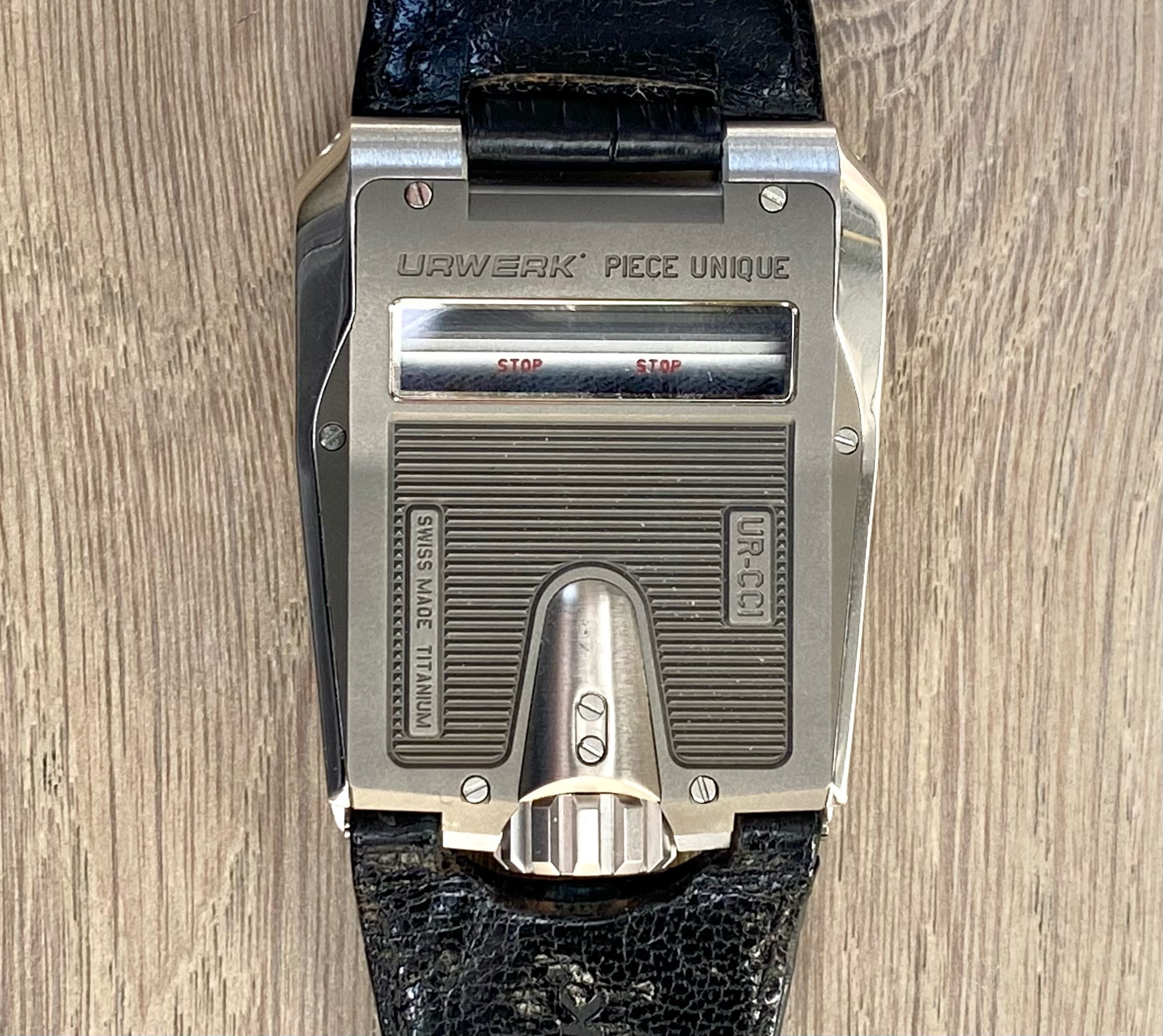 Initially conceptualised by Louis Cottier for Patek Philippe over 5 decades ago, the worlds first linear mechanical wristwatch never actually worked, hence wasn't put into production. Just over a decade ago, Frei & Baumbartner successfully manufactured 50 functioning, linear wristwatches consisting of 25 in white gold & titanium plus 25 in black gold & titanium. They also made 1 'Albino' example shown here with a white dial rather than standard black hence the 'Piece Unique' case back designation. Inspirered by 1970s automobile instrumentation, the timepiece is as technical, historical & funky as they come. The piece unique brother to this example in black coated gold was recently sold for £275k at auction. I consider that to be an inferior example to this, due to the fact that one should never black coat gold due to its softness.