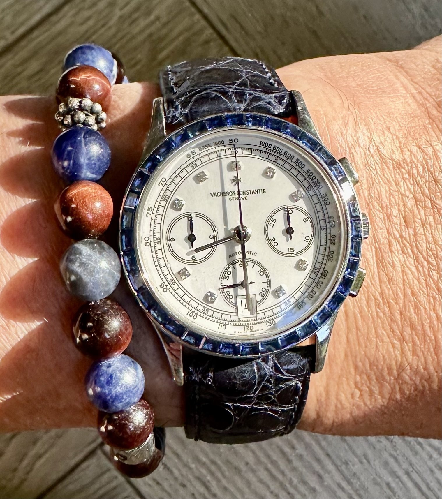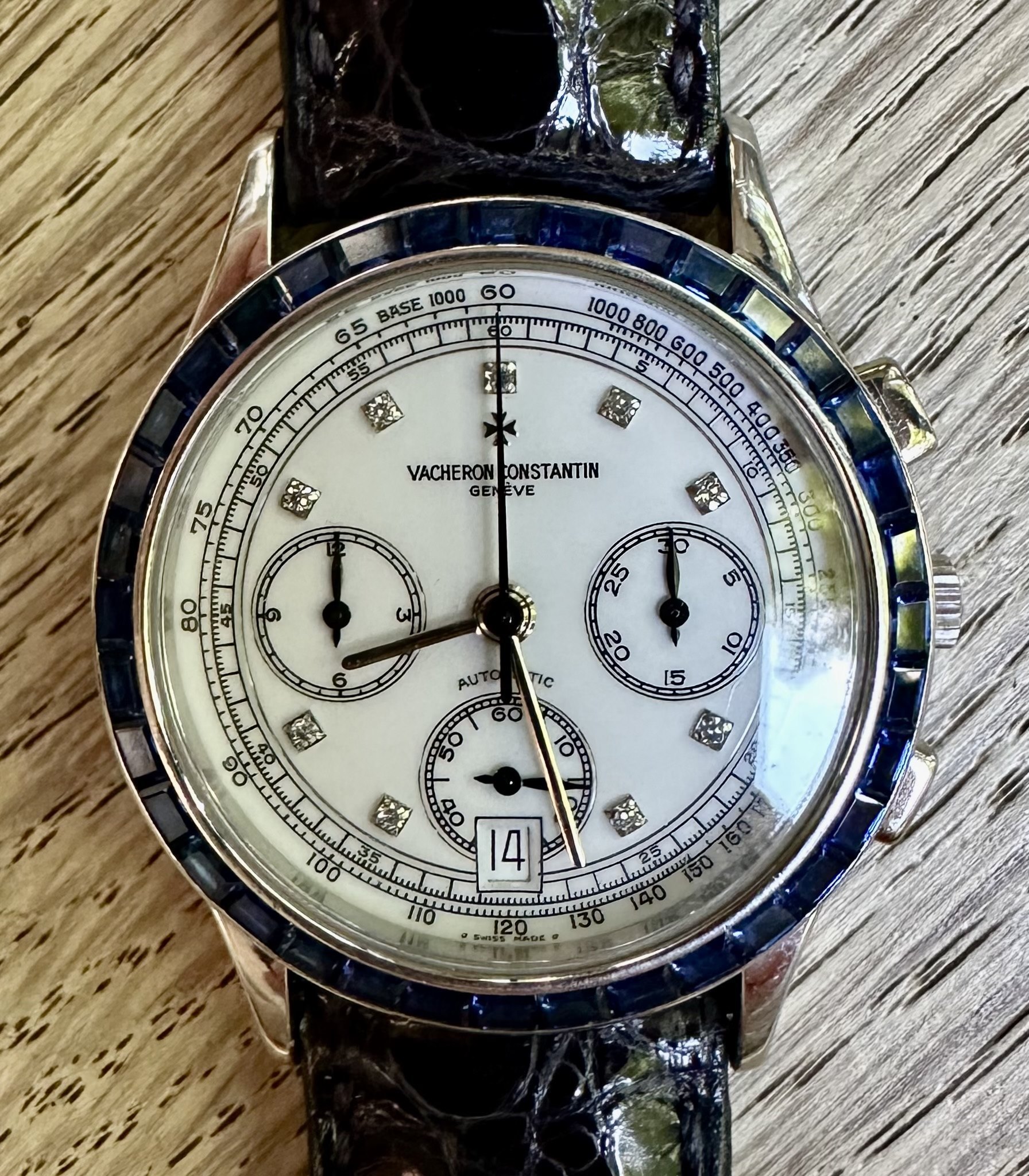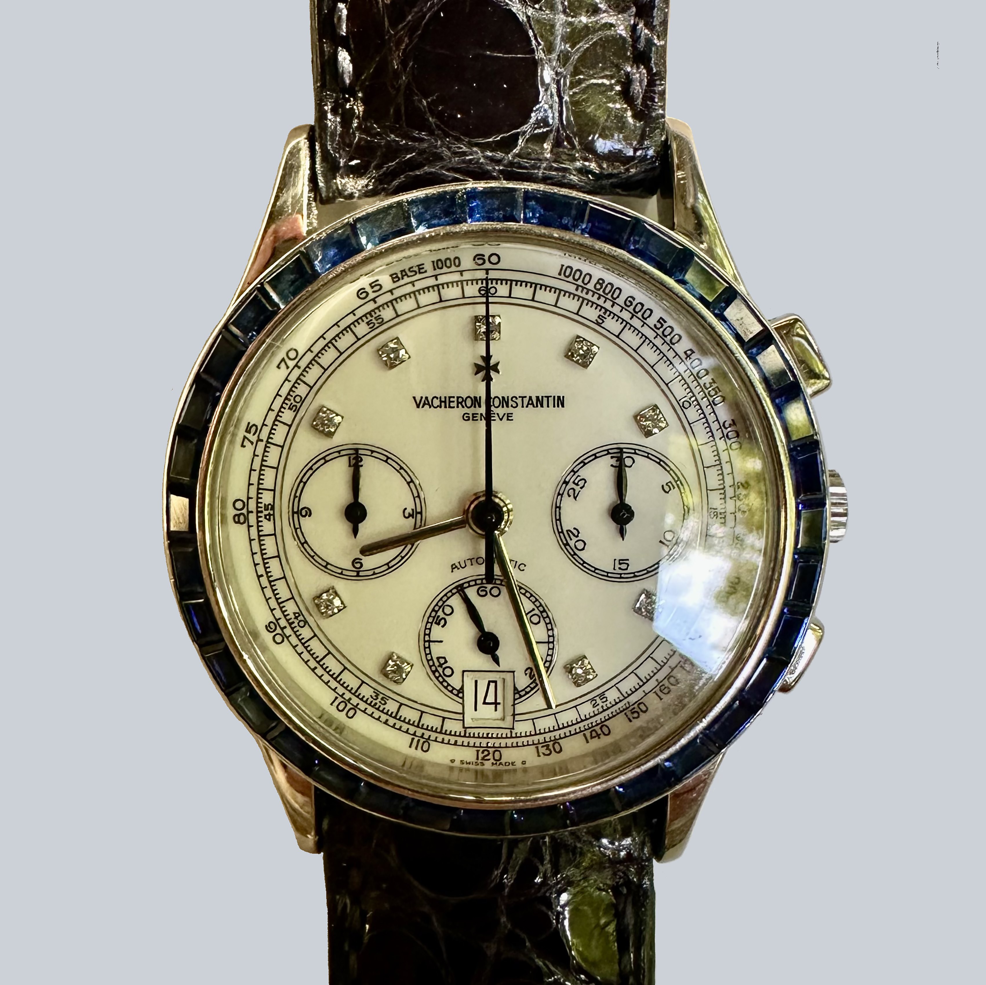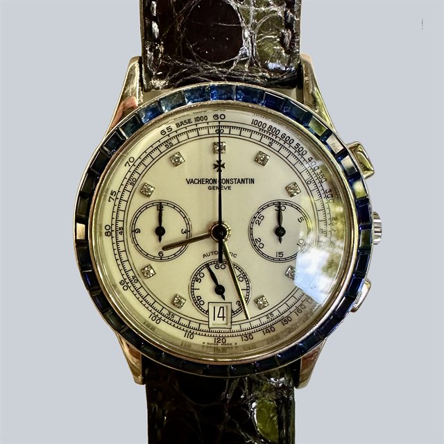 An incredibly rare and vibrant watch incorporating a porcelain diamond dial and a Sapphire baguette bezel which represents phenomenal value for money when compared to the Patek 5071's of the same era.
